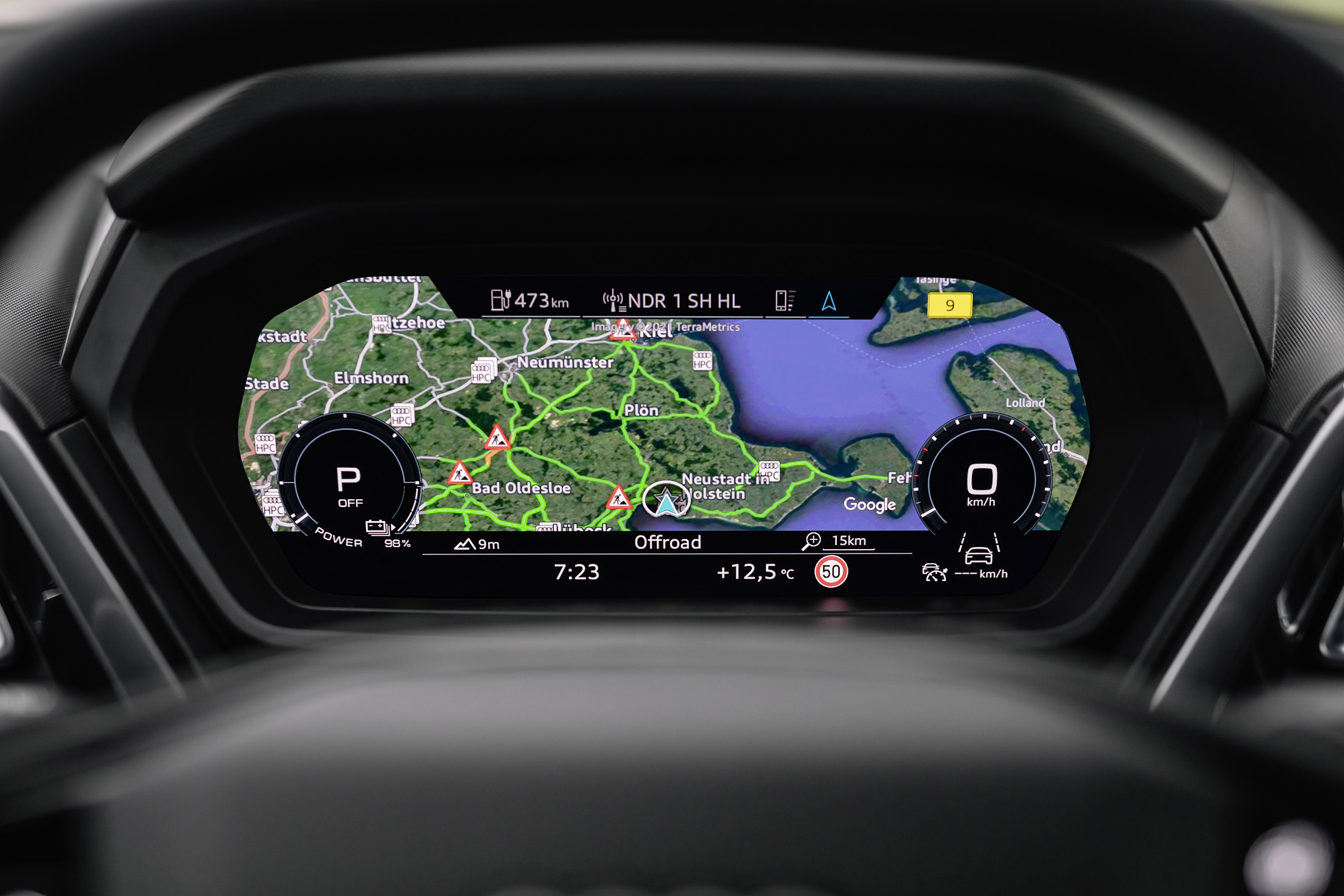 O volante tem novo design da linha ‘S line’, bem como diversos outros elementos com cunho mais desportivo (tal como no exterior), enquanto o painel de instrumentos digital volta a marcar presença, com grande personalização possível. Um sistema de head-up display com realidade aumentada faz também parte do conjunto e aporta um visual moderno e, ao mesmo tempo, funcional, especialmente durante a navegação, já que as setas dispostas no para-brisas a uma distância virtual de dez metros permitem fazer uma orientação dinâmica do caminho a seguir.