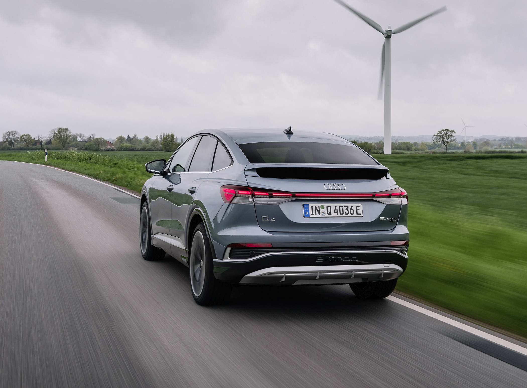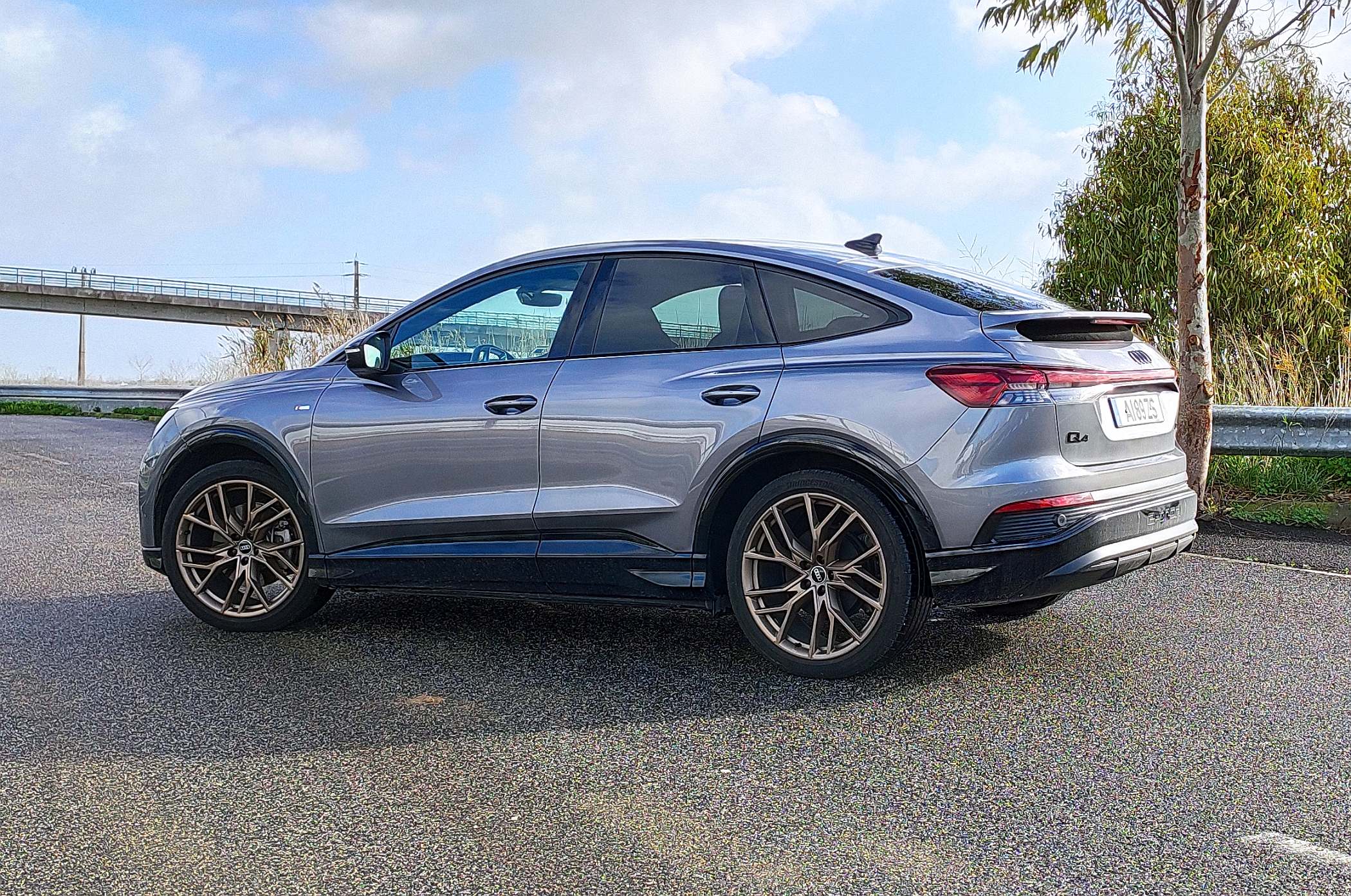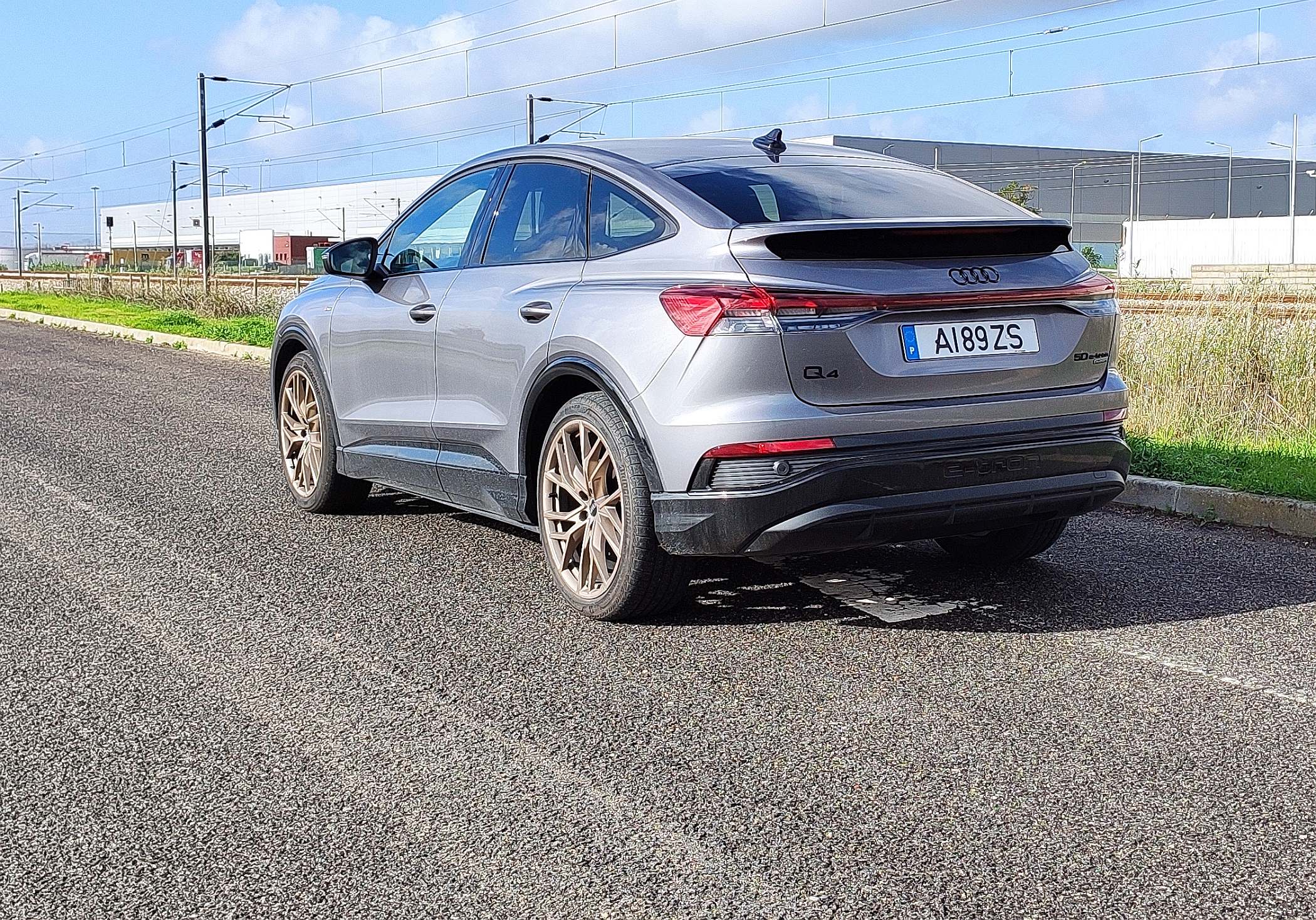 A eficiência aerodinâmica fica patente em detalhes como a grelha ‘Singleframe’ tapada e nos canais para direcionar o fluxo de ar pela carroçaria com o objetivo de reduzir o arrasto e aumentar um pouco mais a autonomia. O resultado é um coeficiente de arrasto de 0.26, bastante interessante para um modelo com este volume. Face ao Q4 e-tron de que deriva, a maior diferença a separar estes gémeos idênticos faz-se notar na traseira, com o Sportback a assumir o tal formato coupé com a implicação do óculo traseiro ser dividido por um spoiler (ainda que não cause grandes constrangimentos à visibilidade durante a condução).