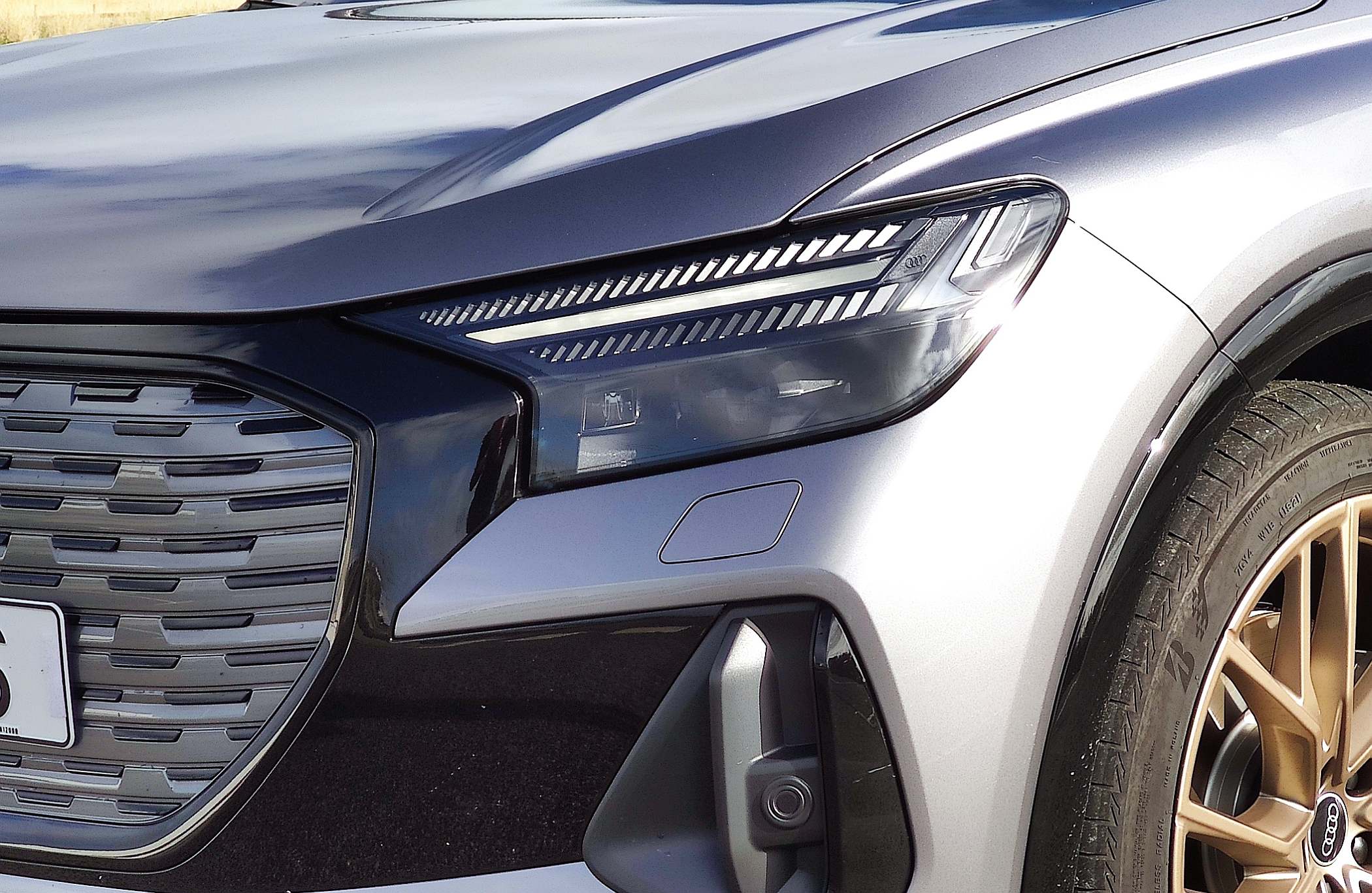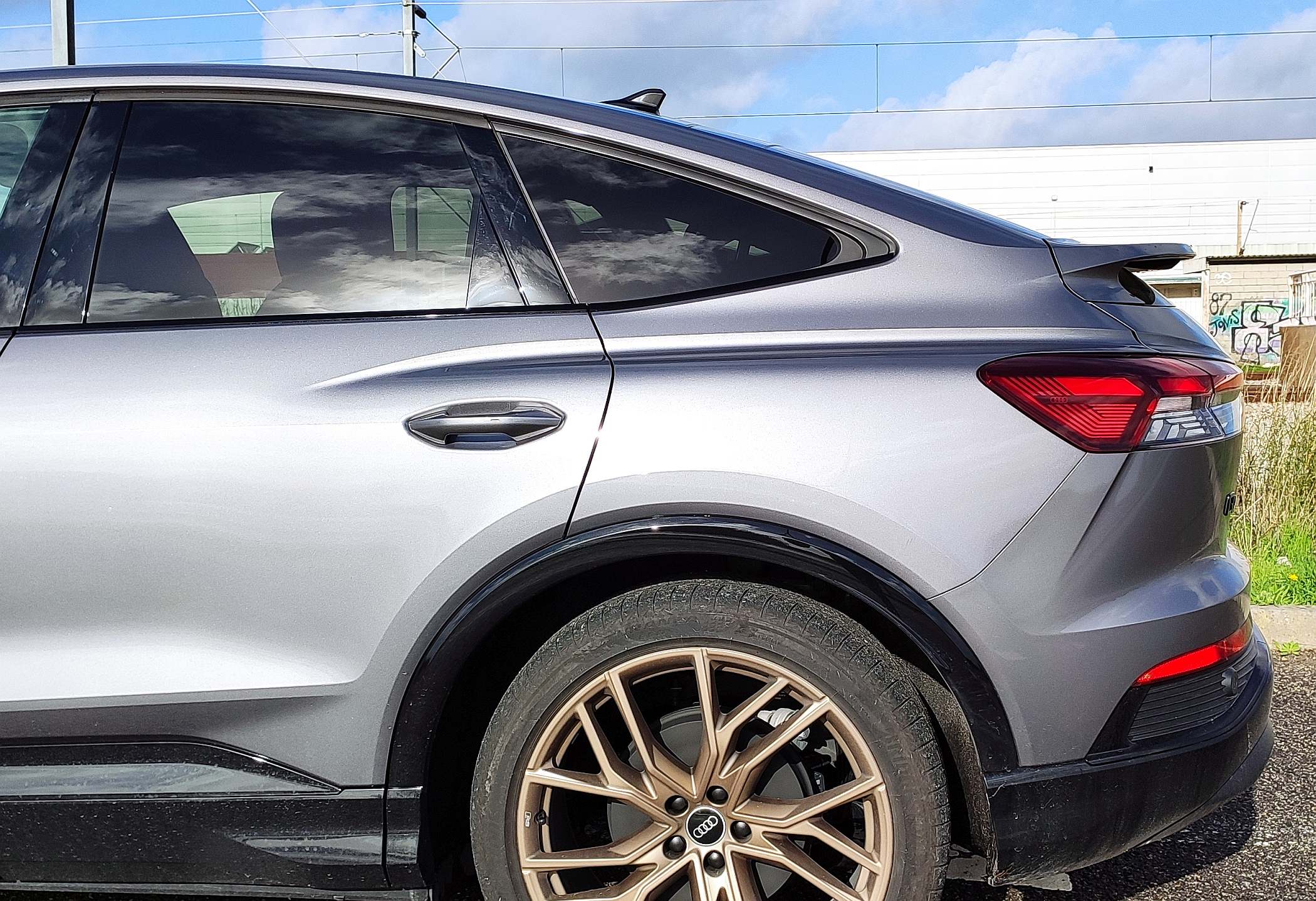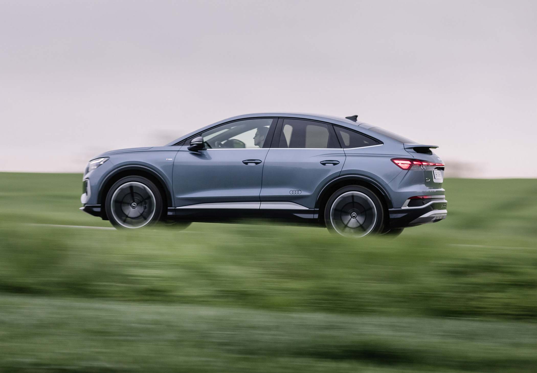 A eficiência aerodinâmica fica patente em detalhes como a grelha ‘Singleframe’ tapada e nos canais para direcionar o fluxo de ar pela carroçaria com o objetivo de reduzir o arrasto e aumentar um pouco mais a autonomia. O resultado é um coeficiente de arrasto de 0.26, bastante interessante para um modelo com este volume. Face ao Q4 e-tron de que deriva, a maior diferença a separar estes gémeos idênticos faz-se notar na traseira, com o Sportback a assumir o tal formato coupé com a implicação do óculo traseiro ser dividido por um spoiler (ainda que não cause grandes constrangimentos à visibilidade durante a condução).