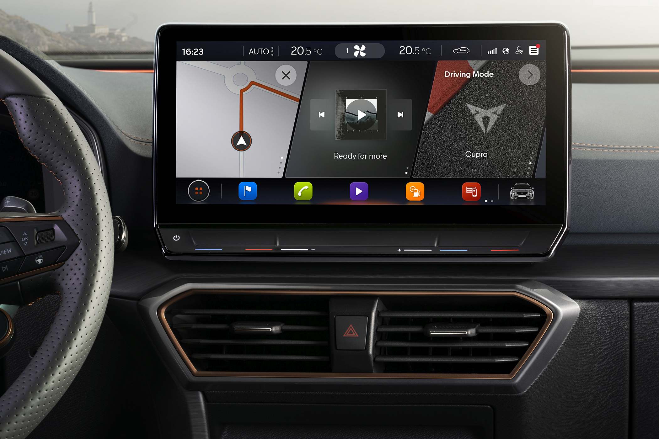 No centro do tablier desponta o ecrã tátil de 12”, que congrega todas as funcionalidades do veículo, incluindo a climatização, numa interação que carece de habituação pela quantidade de menus e de informações. Além disso, os comandos táteis para a climatização são pouco práticos e, de noite, carecem de retroiluminação. Por outro lado, permite elevada conectividade com ligação aos sistemas operativos Android Auto, Apple CarPlay e MirrorLink.