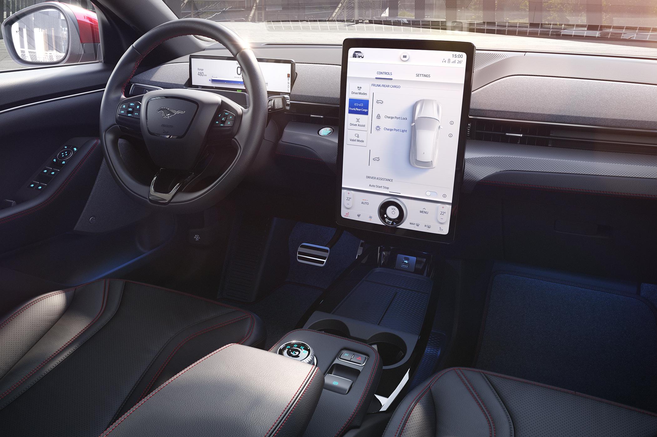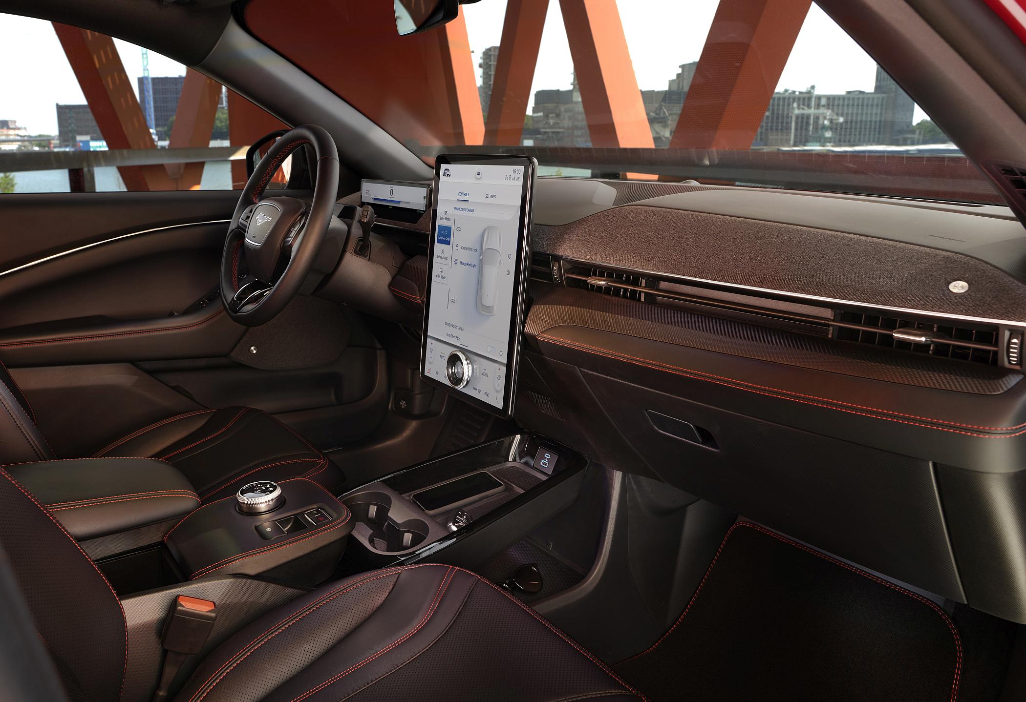 Já sentados no interior, com bancos bastante confortáveis (talvez lhes faltasse um pouco mais de apoio em curva), encontramos o tal elemento tecnológico que tem como ponto nevrálgico o gigantesco tablet central de 15.5 polegadas que congrega a maioria dos sistemas e funcionalidades do Mustang Mach-E. A partir do ecrã é possível aceder aos ajustes do veículo, quer das suas funcionalidades e ajustes, quer da climatização, sendo de fácil interação atendendo ao facto de ter uma abordagem muito semelhante à de um smartphone ou de um tablet comum.