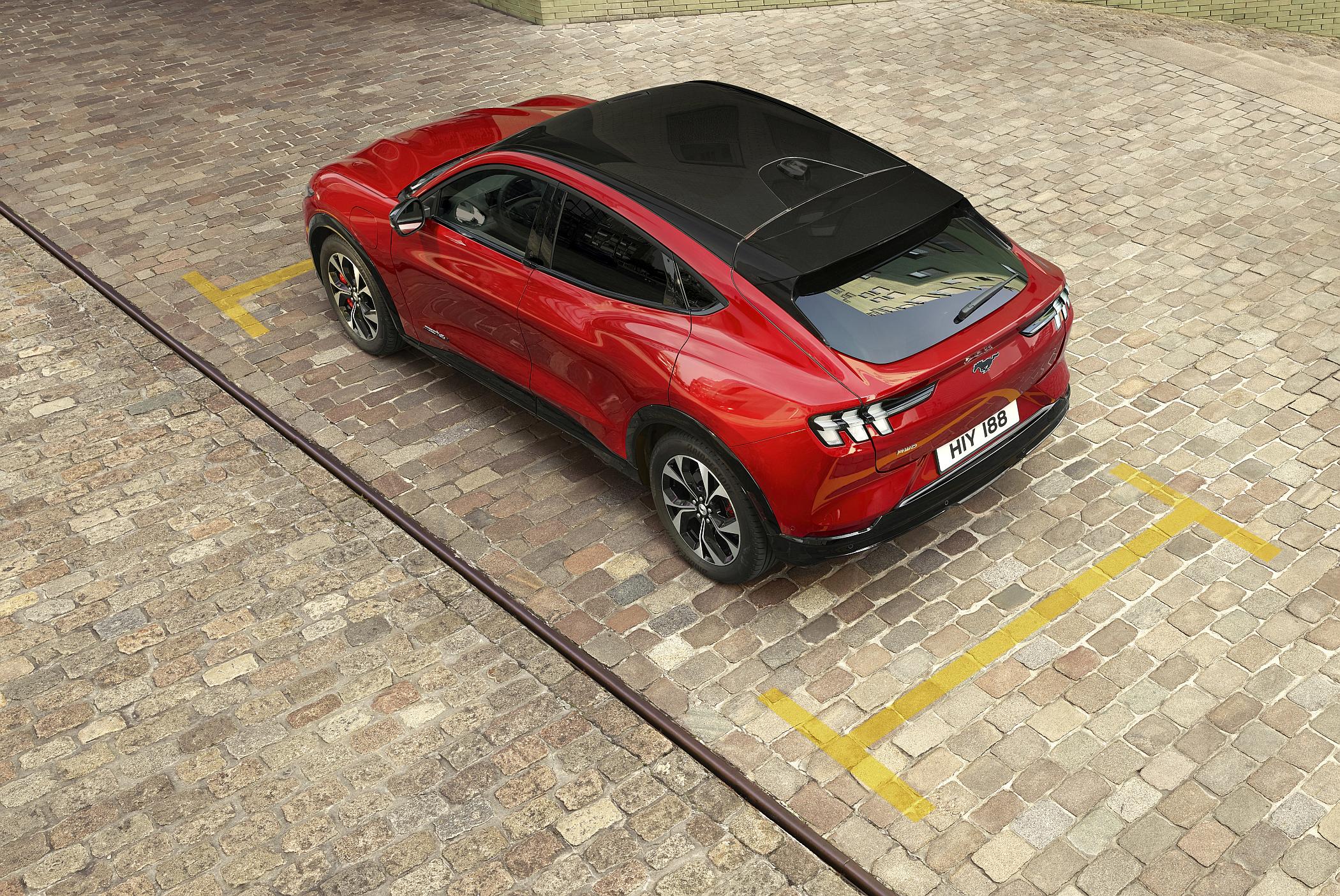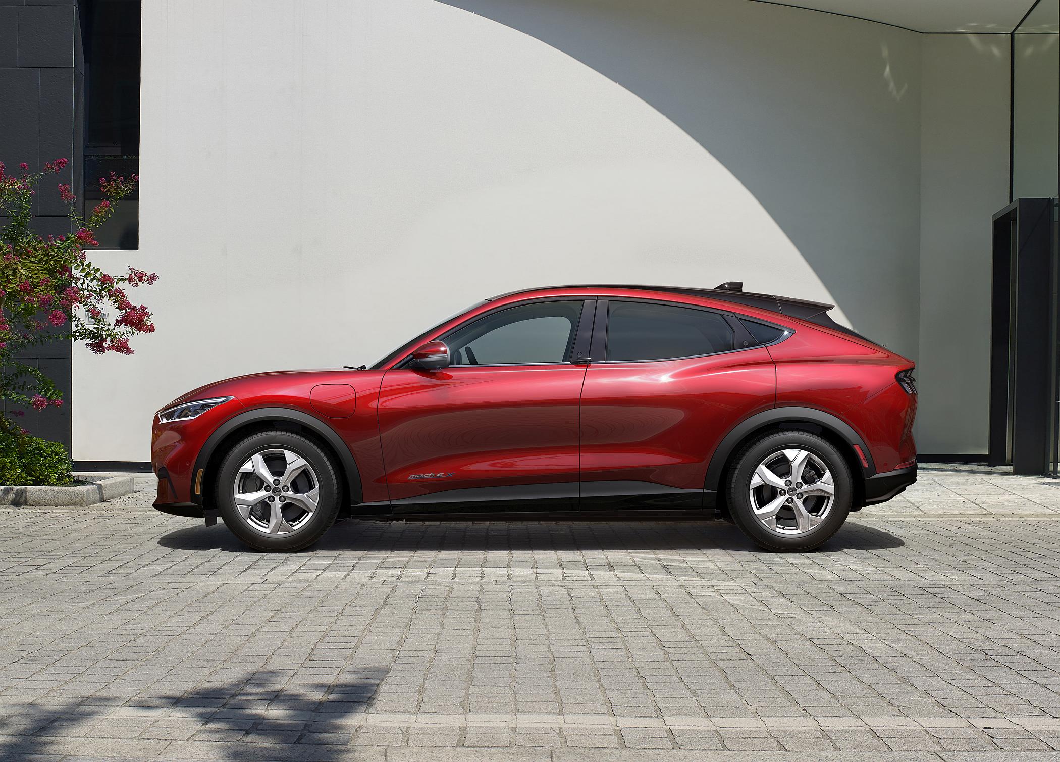 Por fora, a estética é a de um modelo altivo e dinâmico, inspirando-se no Mustang coupé que também se vende na Ford, aqui reforçado com a necessária maior altura ao solo de um SUV, com a marca americana a seguir as tendências de mercado que ditam a importância daquele tipo de modelos. Entre os detalhes chamativos, a grelha dianteira tapada, as cavas das rodas musculadas, as saliências do capot e os farolins com três elementos verticais destacados. O Mustang Mach-E não deixa ninguém indiferente à sua passagem, carregando consigo, de certa forma, o mesmo simbolismo de exuberância que os Mustang do passado.