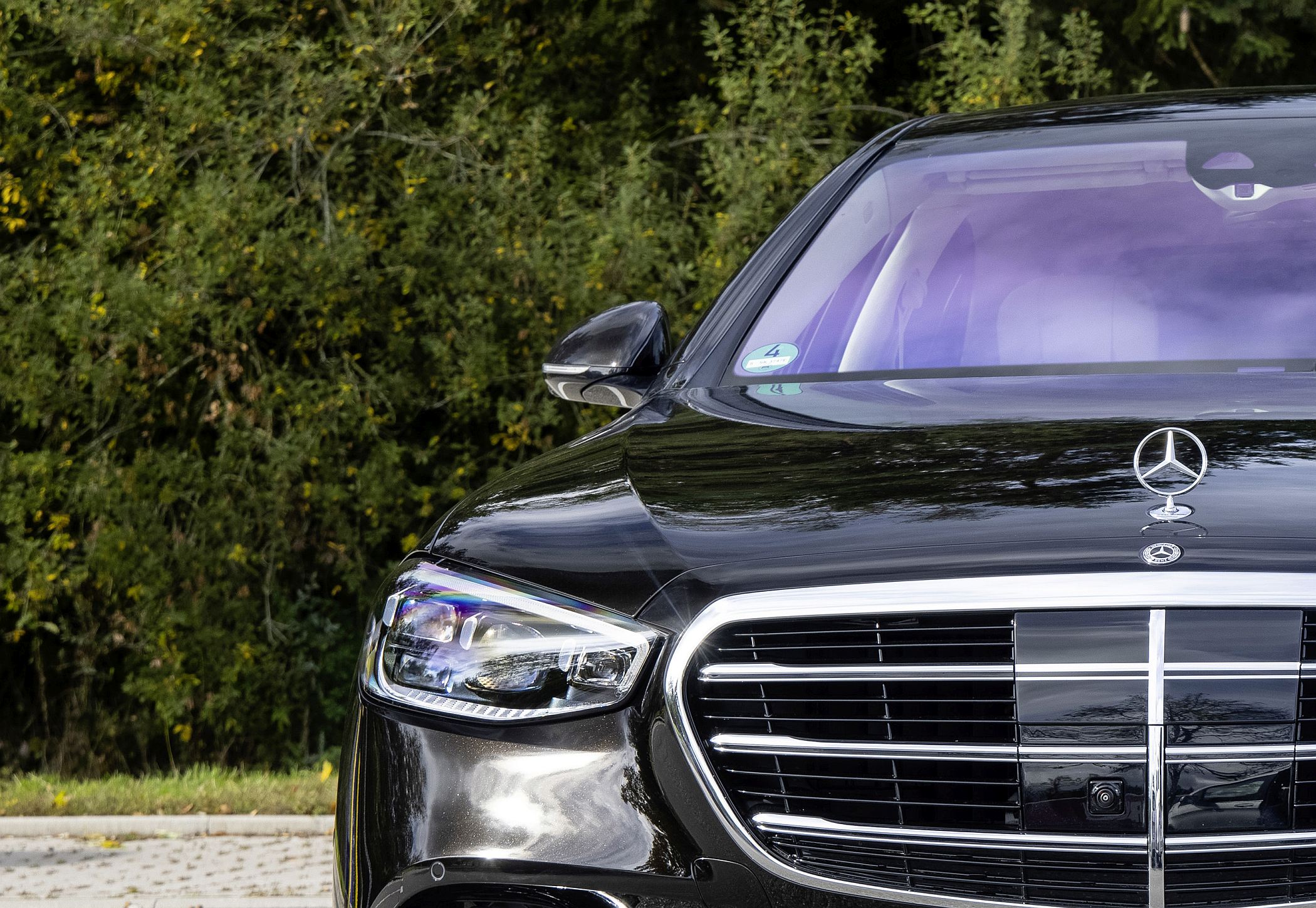 Voltemos ao visual. O Classe S emprega a mais recente linguagem de estilo da Mercedes-Benz aplicada aos modelos de luxo, com uma imagem imponente e plena de força, naquele que será, porventura, um dos desenhos mais bem conseguidos para este segmento. A dianteira sobressai pelos faróis com tecnologia Digital Light, os quais permitem uma fenomenal amplitude de funções de iluminação, adaptando-se às condições do trânsito graças à funcionalidade Multibeam LED.