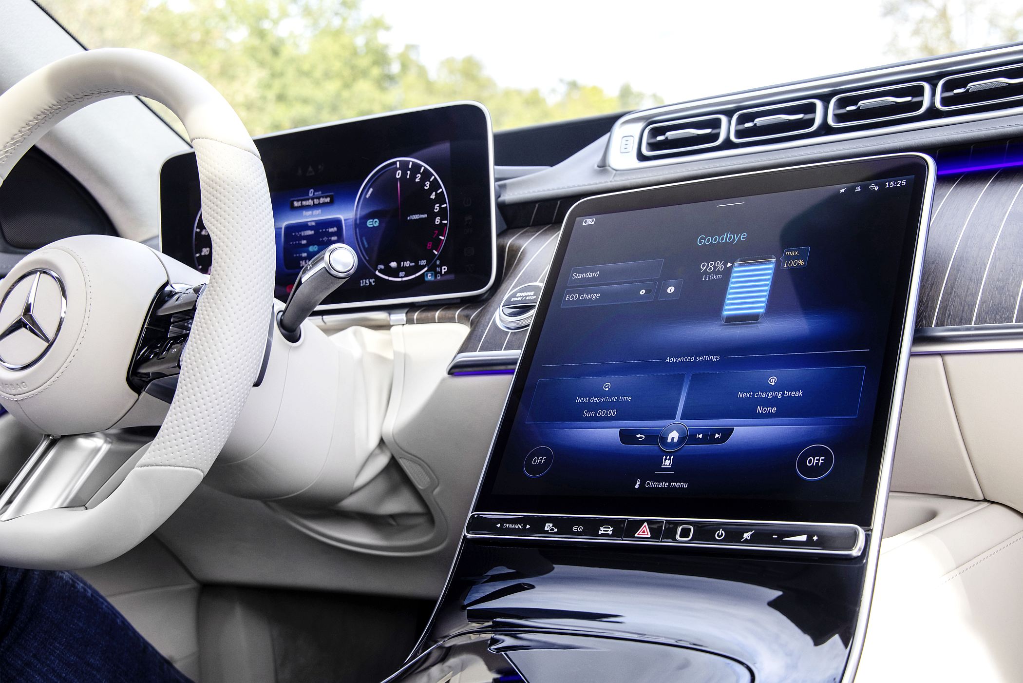No centro do tablier, o grande ecrã central OLED de 12.8 polegadas, disposto em posição vertical, serve de centro de comando para praticamente todas as funcionalidades do Classe S, com uma solução de ‘Nível 0’ em que as principais aplicações ou funcionalidades mais utilizadas estão num nível de mais fácil acesso no sistema de infoentretenimento. Apesar de ser simples de utilizar, há muitos menus e funções que levarão o seu tempo a apreender pelo condutor e passageiro. Há poucos botões de manuseamento físico, ‘sobrando, por exemplo, o dos modos de condução ‘Dynamic Select’, o da câmara ou o de atalho para controlar as diversas funcionalidades do Classe S.