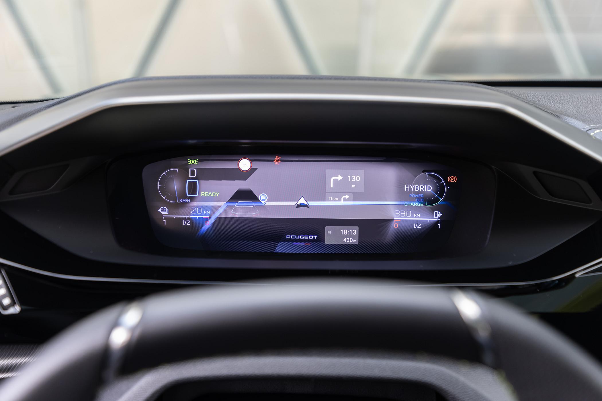 Na versão GT Pack, o requinte interior é evidente e salta à vista, quer na solidez de construção e integração de todos os elementos, quer na própria conceção moderna daquilo que a Peugeot apelida de i-Cockpit, que conhece aqui uma nova evolução. O condutor tira partido de painel de instrumentos digital parametrizável com ecrã de 10”, o qual concede desde logo uma faceta moderna e vanguardista com modos de visualização distintos. No nível de equipamento GT (e GT Pack), adota tecnologia 3D, que faz sobressair os elementos visuais. O formato de volante de diâmetro reduzido continua a não ser espetacular, obrigando a uma procura prévia pela posição de condução ideal para o corpo e para a visualização perfeita da instrumentação. Uma questão de hábito.