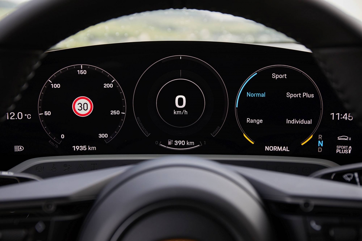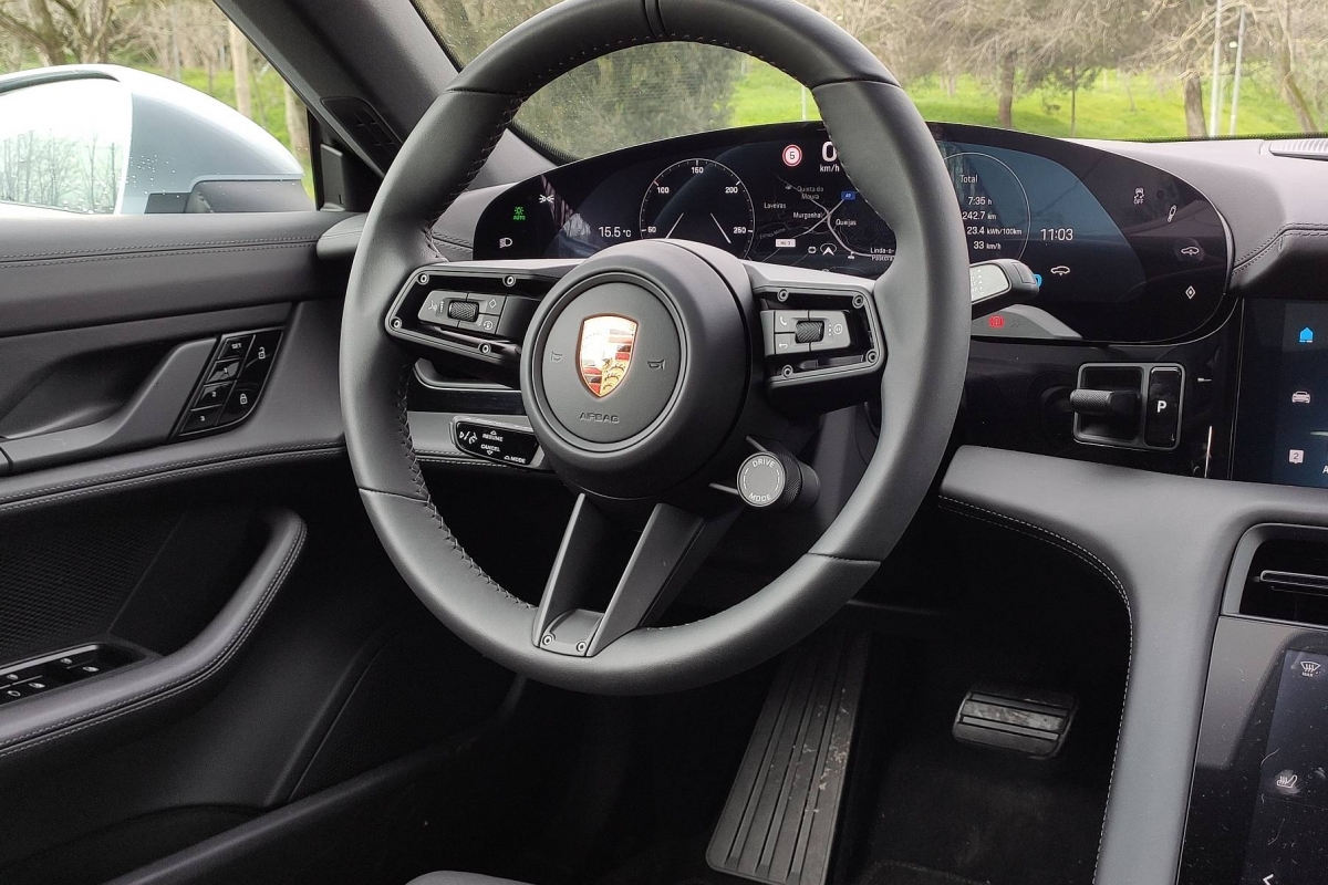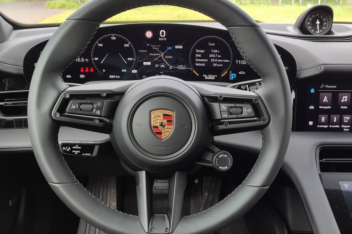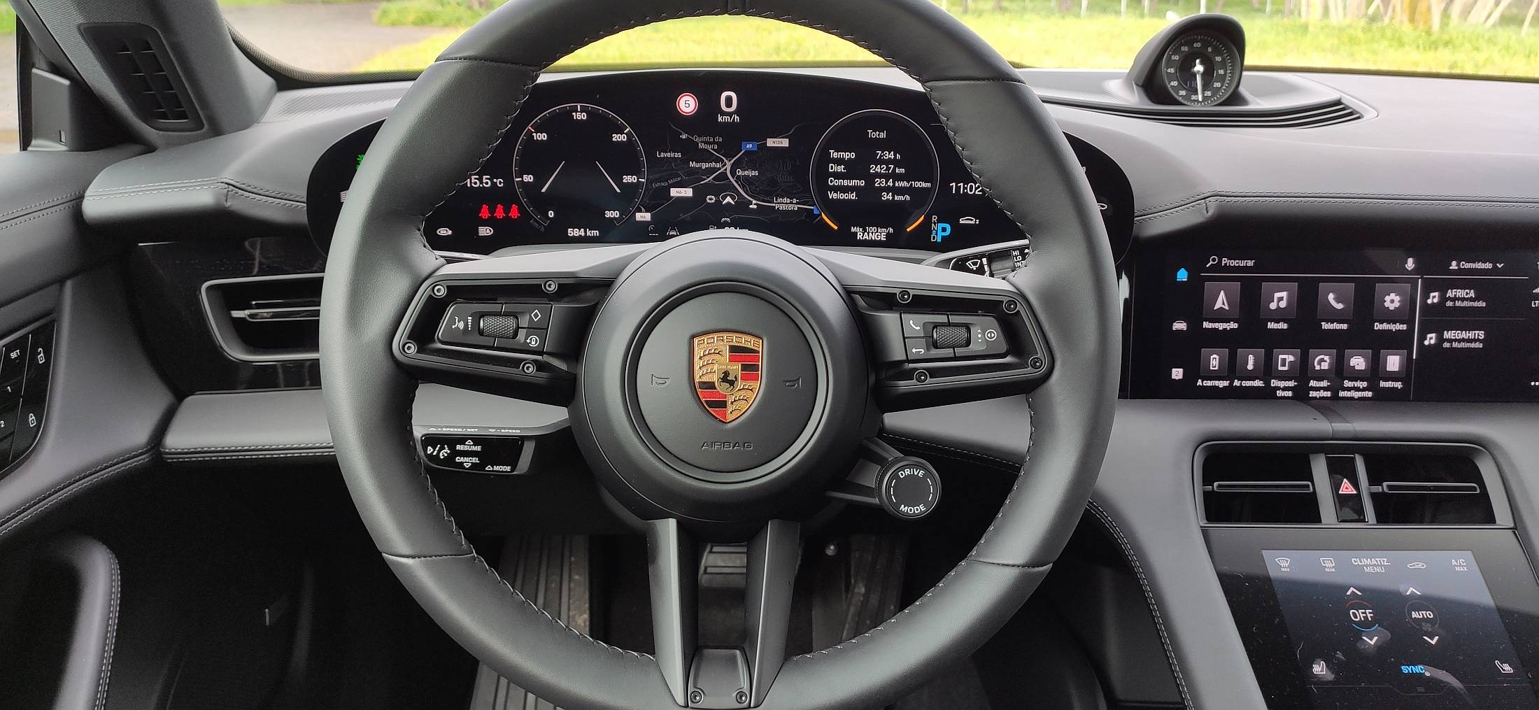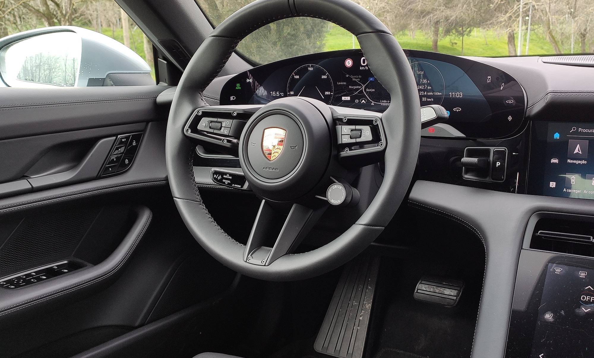 Tipicamente Porsche, os padrões de qualidade são elevadíssimos, proporcionando um ambiente requintado e luxuoso, no qual não faltam elementos desportivos e muita tecnologia. Começando pelo que está no campo de visão do condutor, trata-se de um ecrã curvo de 16.8 polegadas, com moldura negra para contraste visual. A instrumentação de três campos é personalizável, conferindo assim, maior personalização, parecendo-nos uma ótima solução. Pareceu-nos, porém, que algumas das informações mais junto às laterais podem ficar tapadas pelo aro do volante.