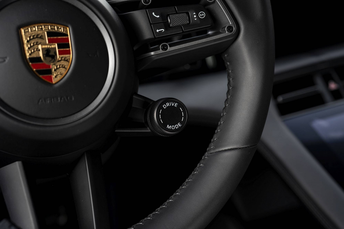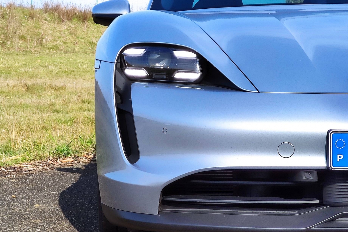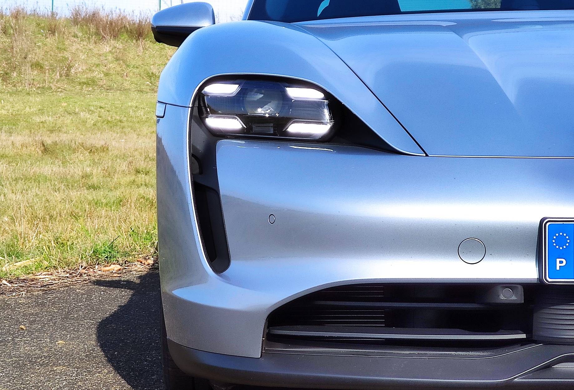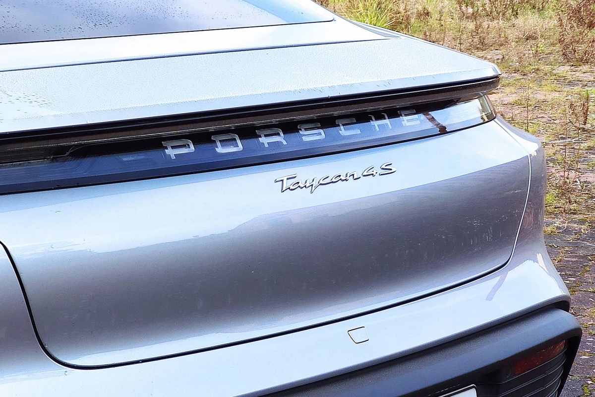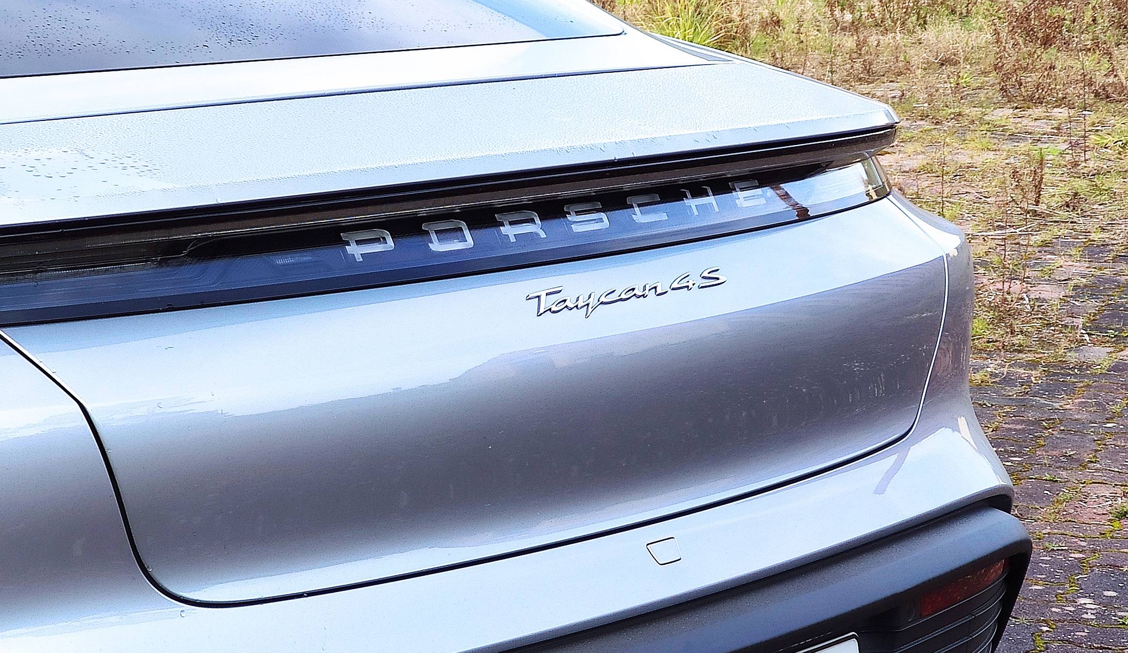 Depois, todo o impacto visual de grupos óticos escurecidos com tecnologia LED, alinhados com cortinas laterais aerodinâmicas, cavas das rodas salientes em frente mergulhante (com grelha ativa que varia a sua posição consoante as necessidades de refrigeração), jantes de grandes dimensões (21 polegadas no caso da unidade ensaiada), fundo plano e uma secção traseira musculada, com ombros largos e farolins esguios, com um spoiler na tampa da bagageira e a designação Porsche em superfície vidrada logo abaixo. Nas portas (sem molduras), os puxadores exteriores escondem-se na carroçaria para também reduzir o impacto aerodinâmico.
