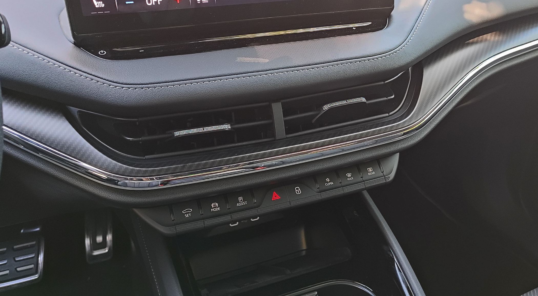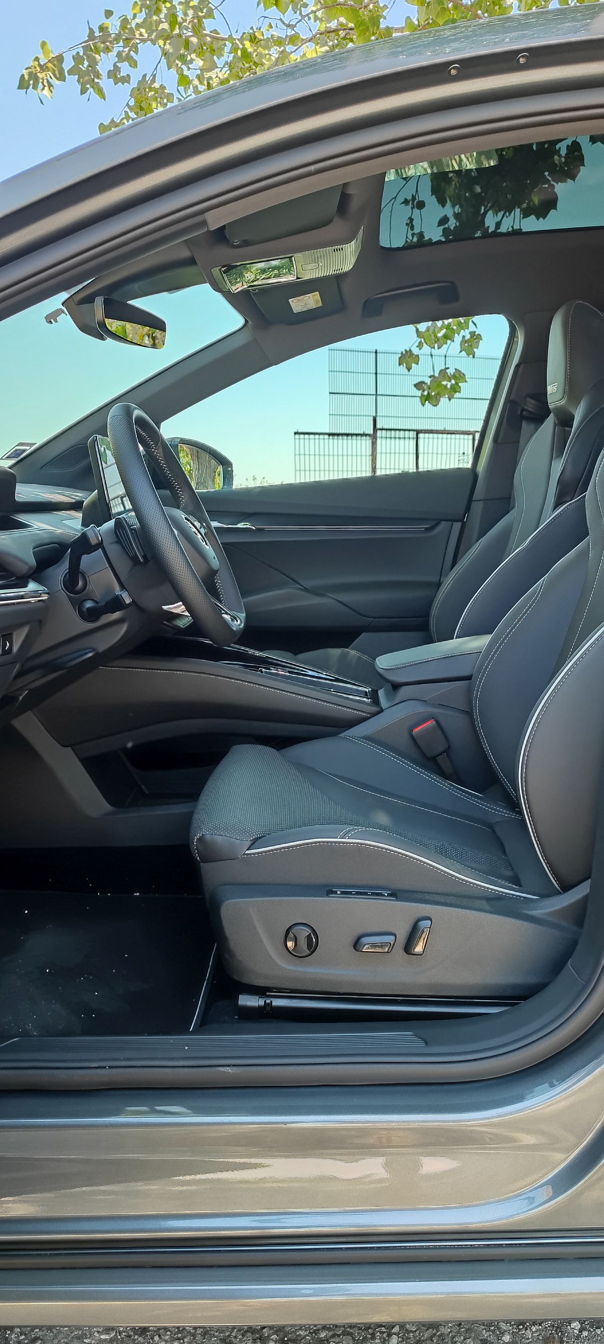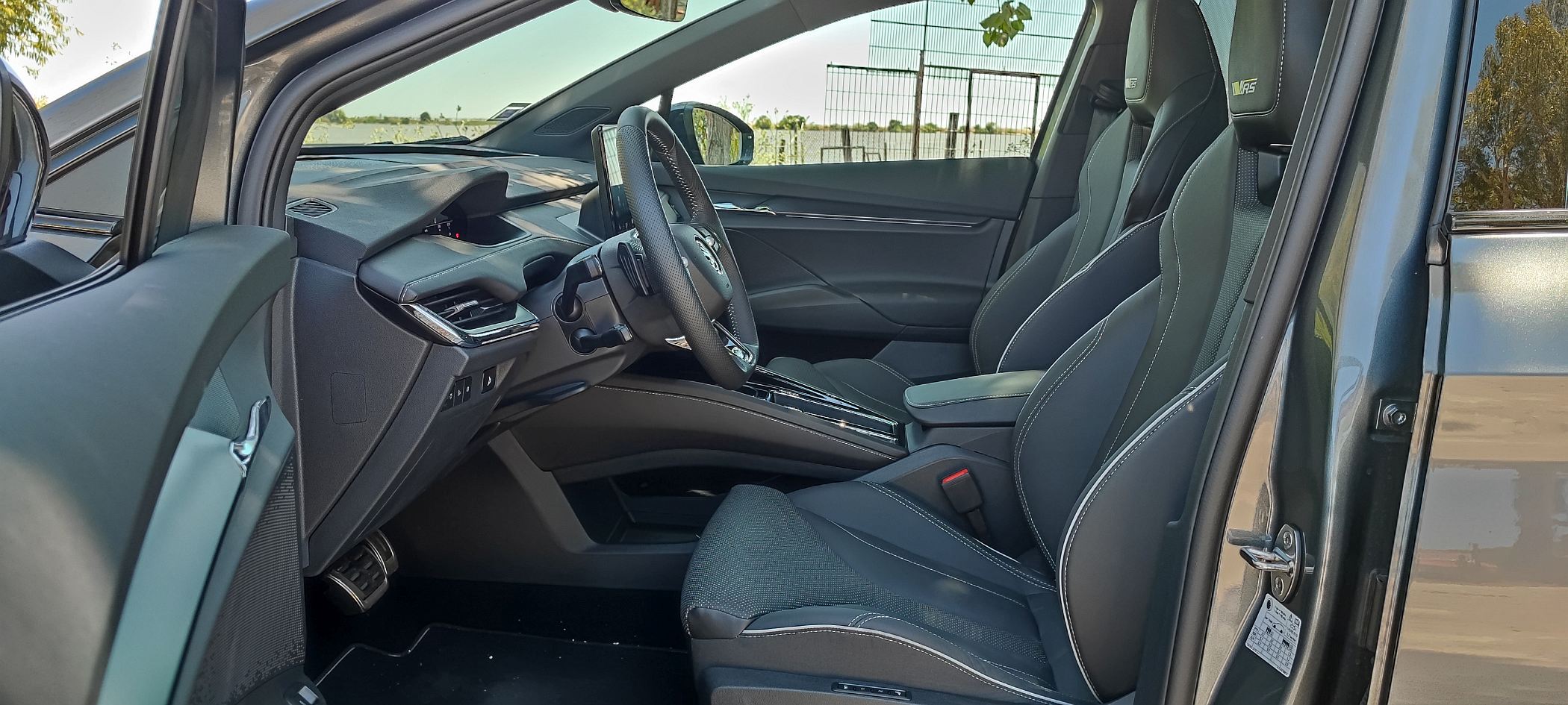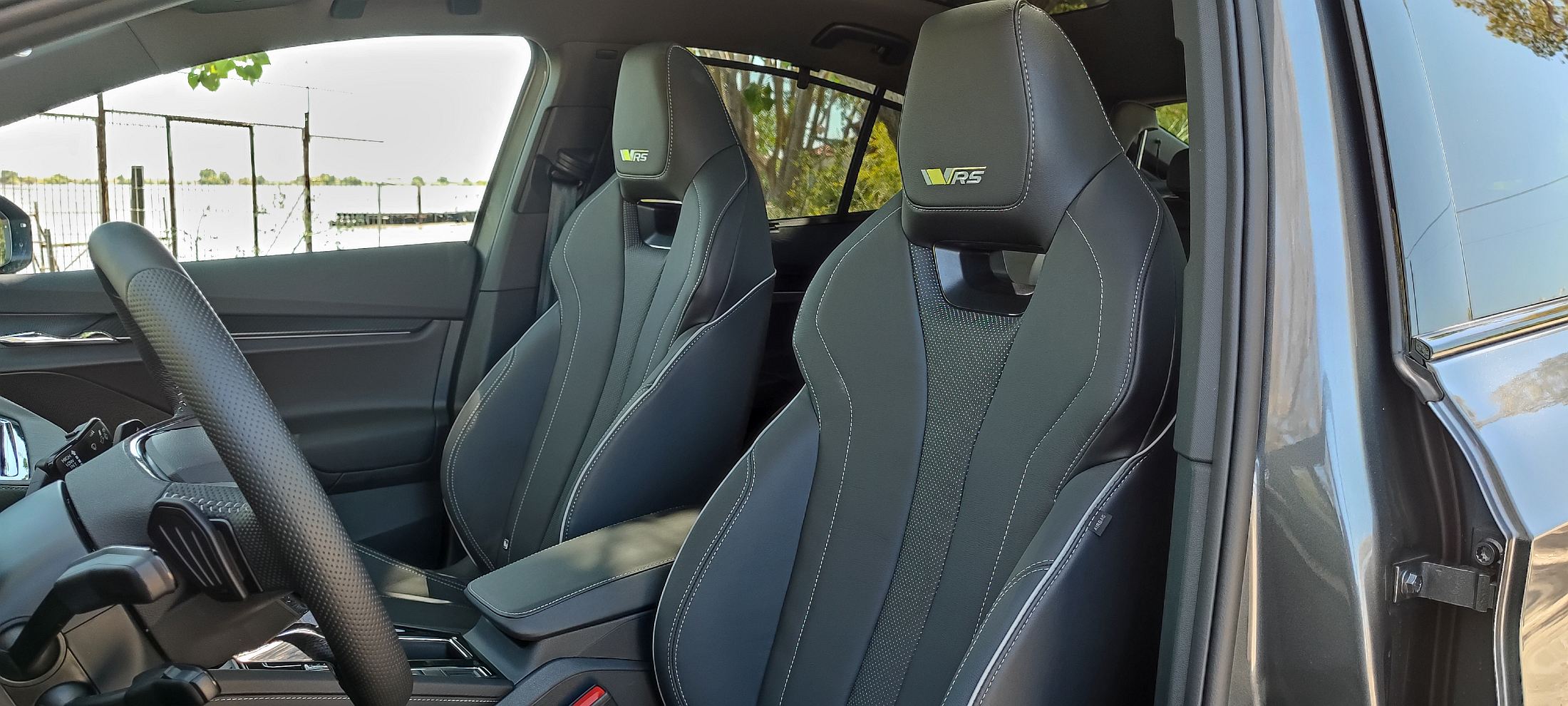 A bordo, o ambiente é extremamente cuidado e elegante, com a Skoda a jogar bem as suas ‘cartas’ desportivas ao dotar este modelo de bancos desportivos (com encosto de cabeça integrado) que suportam o corpo de forma exemplar, recebendo ajuste elétrico com memória para o banco do condutor. O revestimento em pele/camurça ‘Suedia Soul’ também eleva a fasquia.