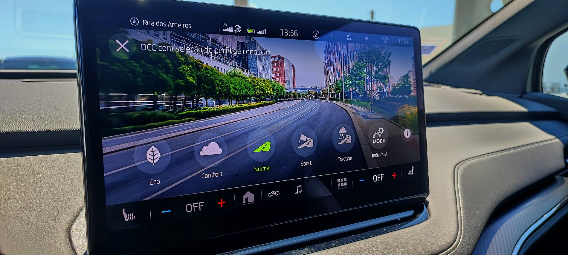 Já o ecrã central tátil tem 13 polegadas, servindo de base para o sistema de infoentretenimento de terceira geração, ao qual não faltam funcionalidades de navegação, registo de dados de condução e conectividade via Bluetooth com o smartphone, além dos cada vez mais costumeiros Android Auto e Apple CarPlay sem fios. É também pelo ecrã que o condutor pode ter acesso ao sistema de auxílio ao estacionamento 360º com base em câmaras, num sistema muito completo e útil. As teclas de ‘atalho’ abaixo do ecrã central são bem-vindas.