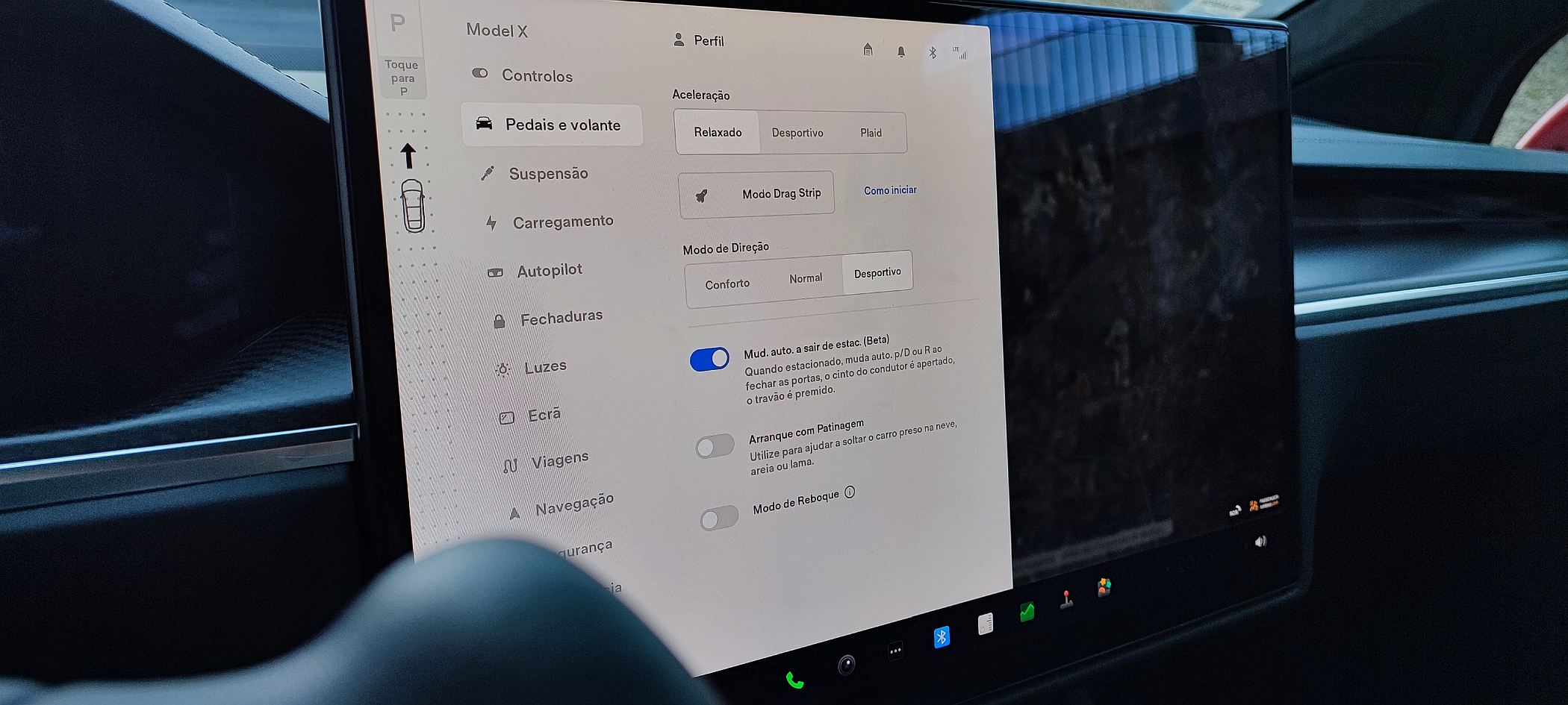 O Model Y Plaid tem modos de condução distintos, entre o ‘Relaxado’, Deportivo’ e o ‘Plaid’, sendo este último o mais extremo, embora a aceleração máxima seja alcançada com o modo ‘Drag Strip’, que mimetiza os fogosos ‘dragsters’ das provas de aceleração nos Estados Unidos da América (EUA), preparando a bateria e o chassis para um arranque fulgurante: a dianteira baixa e a traseira levanta até alcançar aquilo que a Tesla denomina de ‘modo Chita’, como um felino prestes a saltar. Quando se solta o pedal do travão, lá vamos, uma vez mais, esmagados contra o banco.