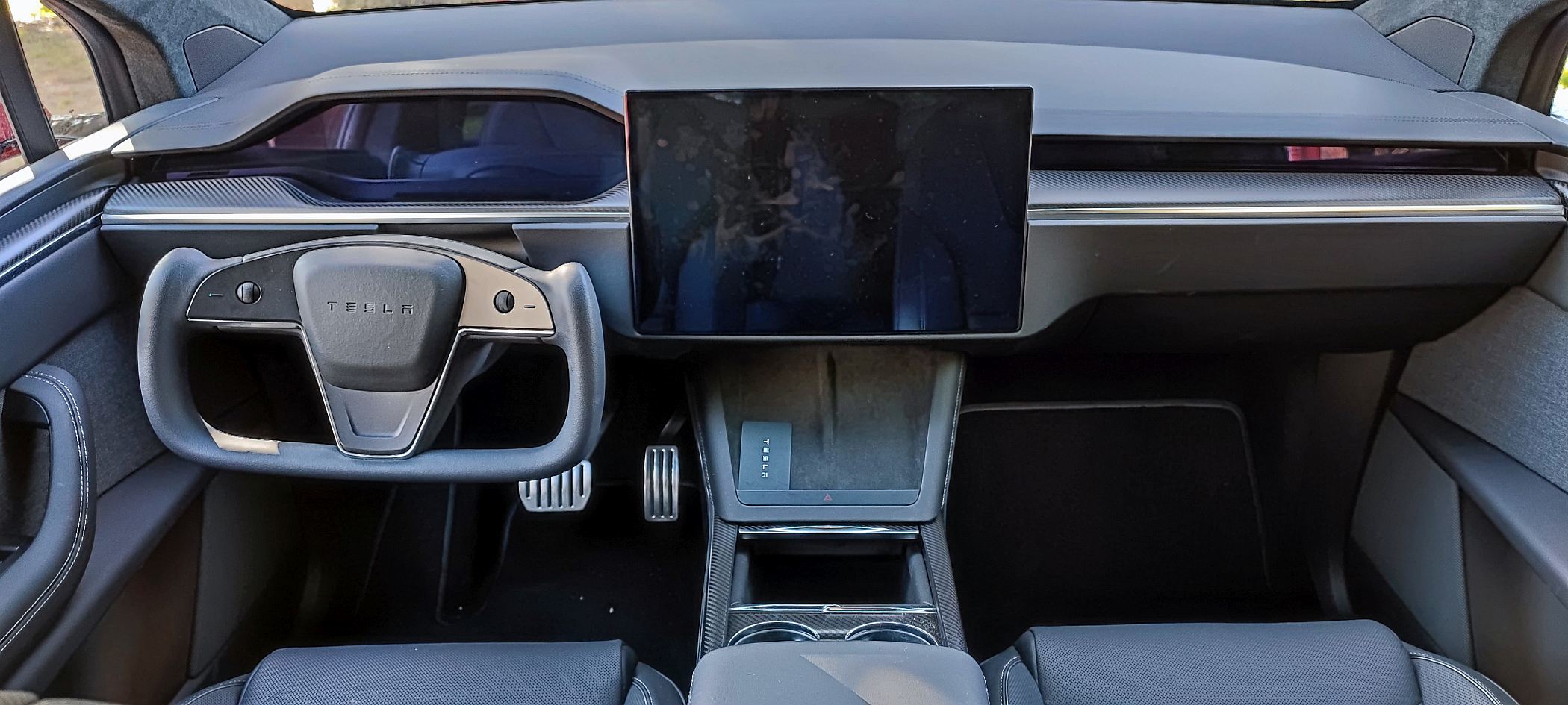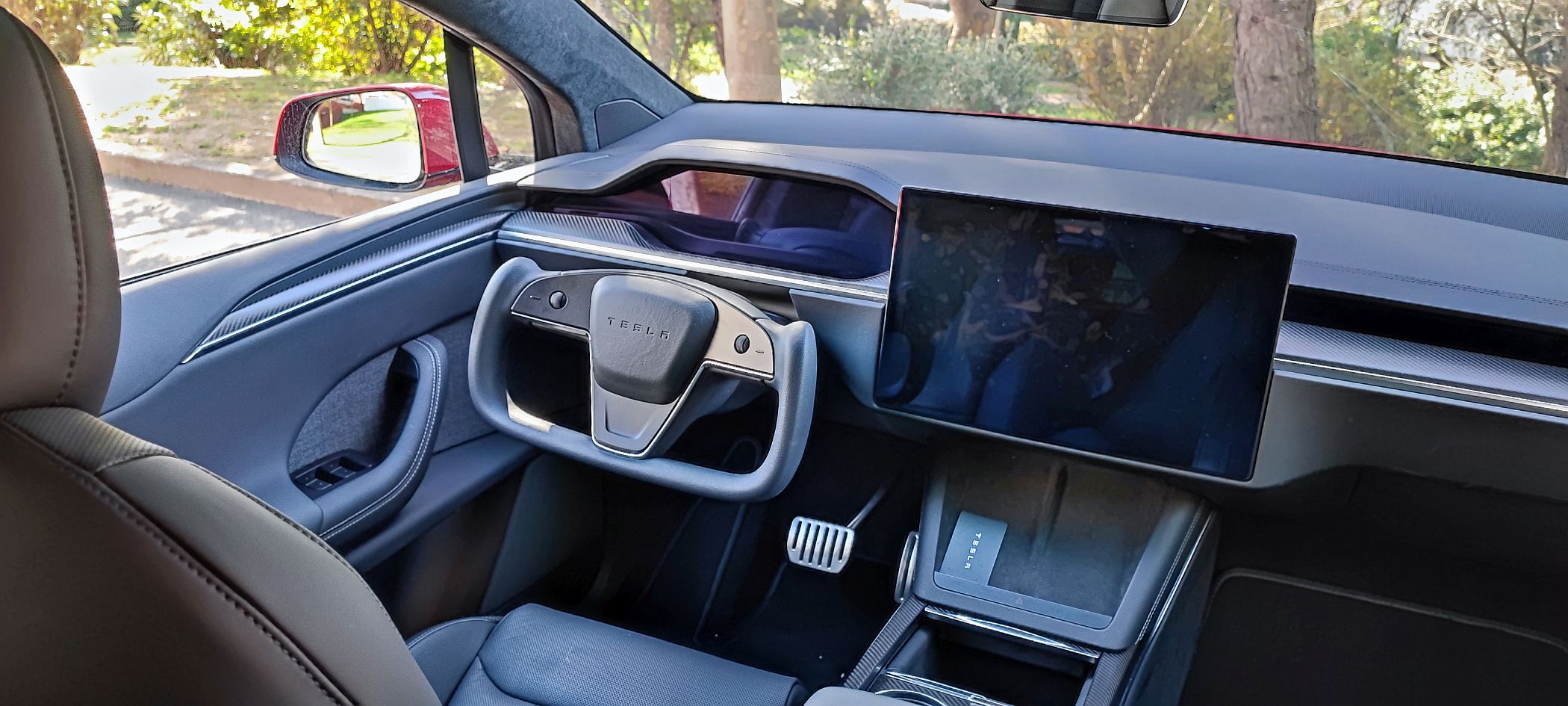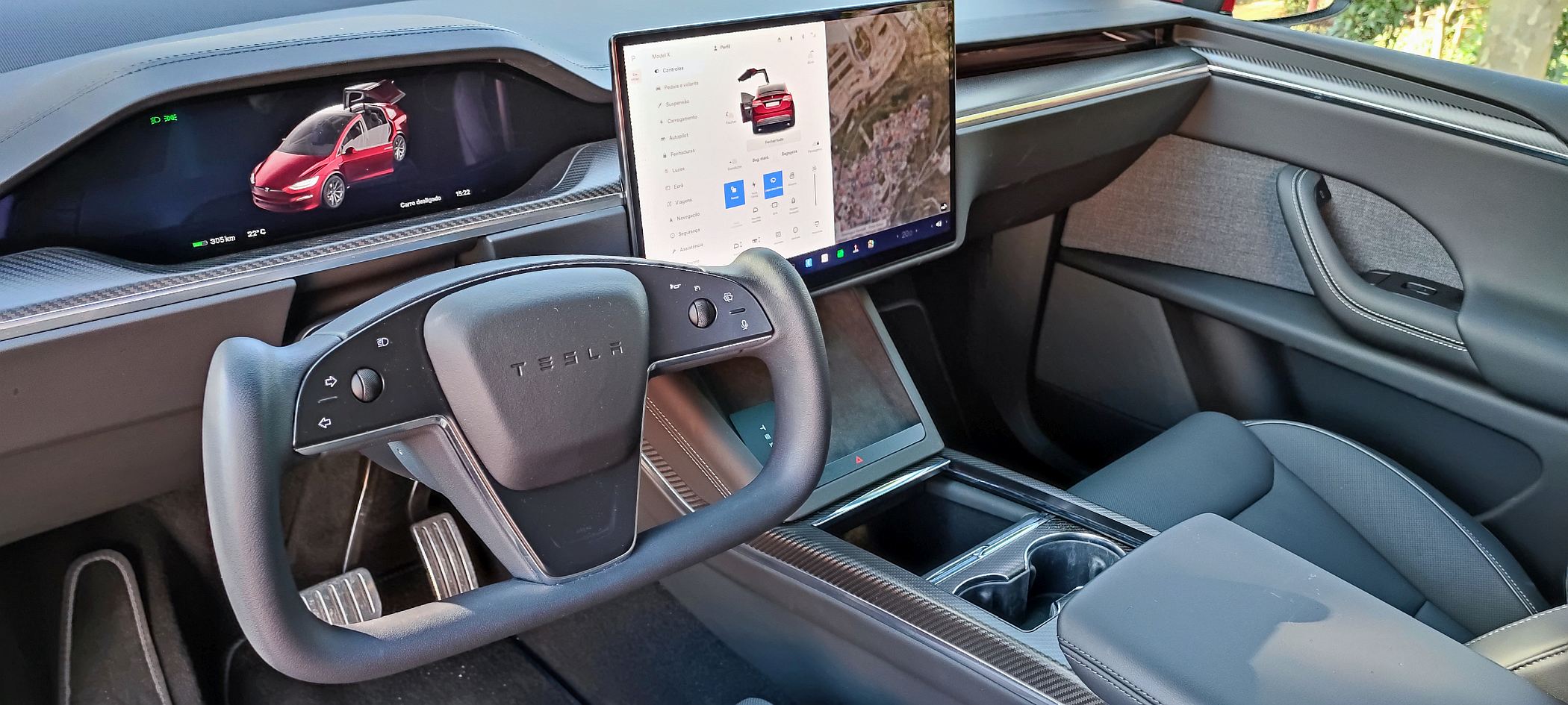 O condutor tira partido do painel de instrumentos minimalista, com o ‘yoke’, volante de estilo ‘manche’ de avião retangular a fazer aqui também a sua aparição. Tal como já sucedeu no ensaio ao Model S Plaid, qualquer condutor ficará melhor servido com o clássico volante circular, já que este torna as manobras menos naturais, enquanto o posicionamento dos ‘piscas’ no lado esquerdo do ‘yoke’ também não ajuda se quisermos cumprir com o código da estrada nas rotundas e assinalar a entrada e a saída. Opcionalmente, a Tesla oferece o volante redondo. Não pense duas vezes e escolha este.