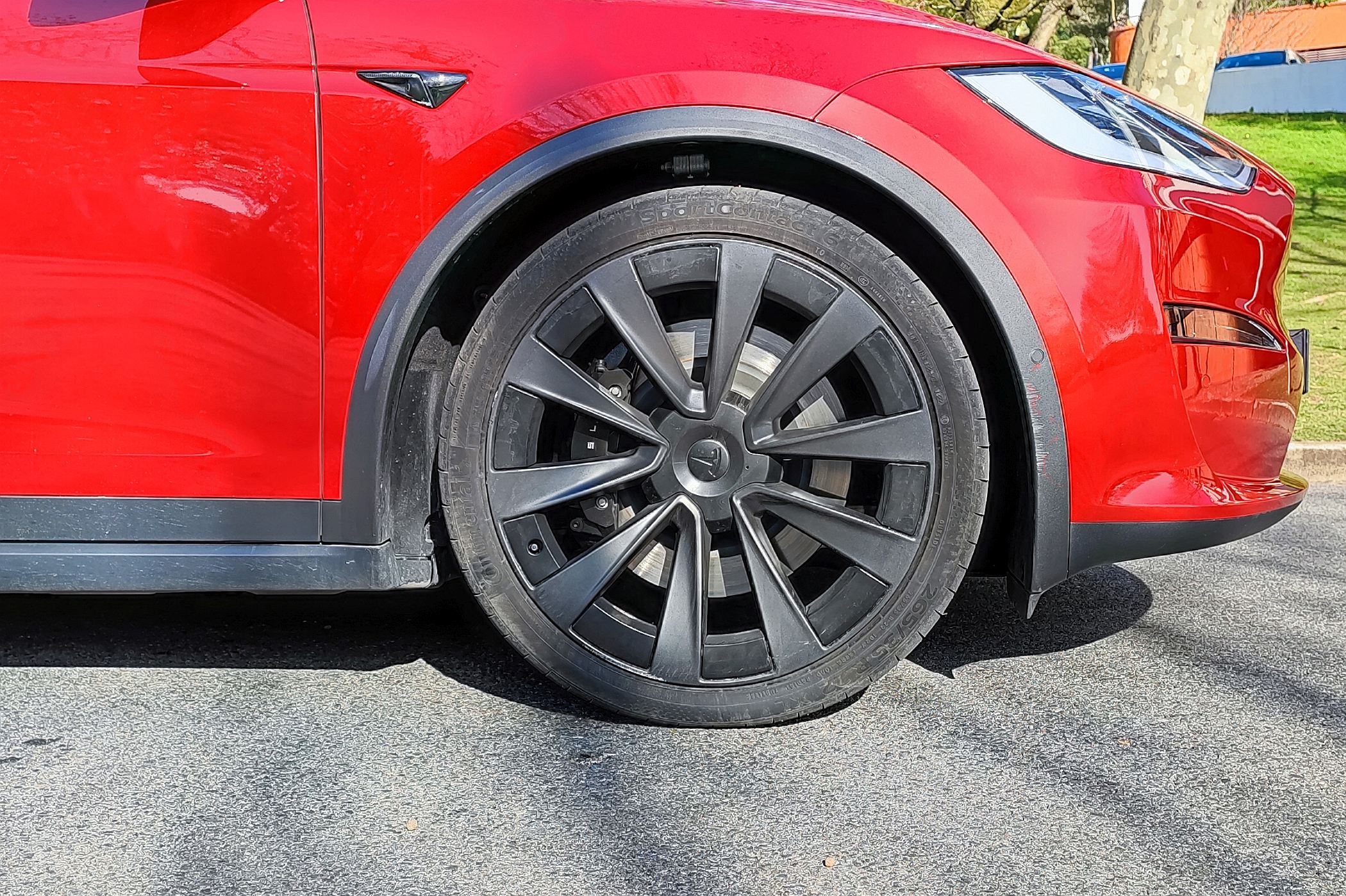 O Model X Plaid não se diferencia muito dos demais Model X no exterior, tendo como único elemento claramente diferenciador o símbolo retangular no portão da bagageira. Aquele que é o SUV mais rápido em aceleração atualmente em produção (2,6 segundos dos zero aos 100 km/h) mantém a postura robusta e forte, aqui reforçada com as jantes Turbine opcionais de 22″, por 5950€. Também à vista estão as pastilhas de travão com maior capacidade térmica para assim oferecerem maior resistência ao desgaste e à necessidade travar mais de duas toneladas de peso.