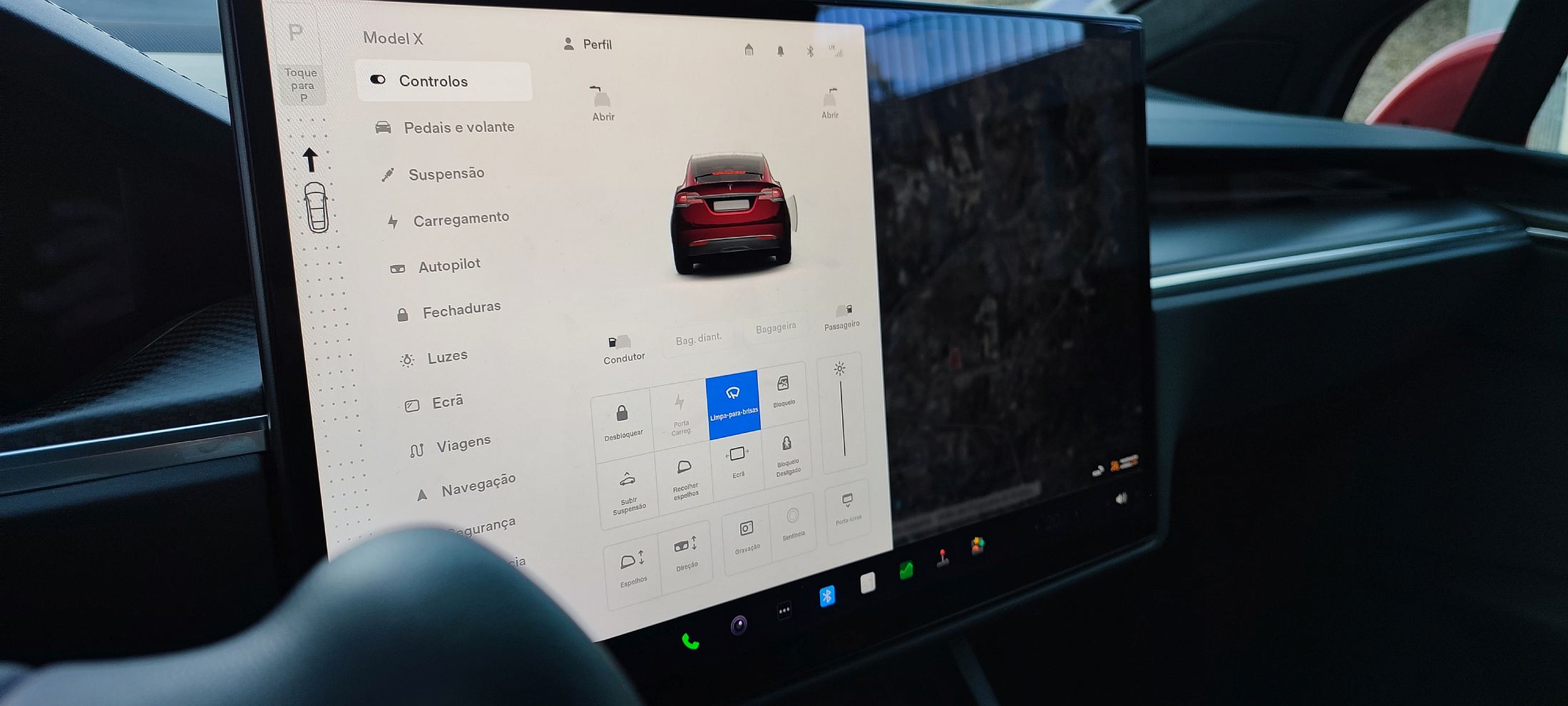 A suspensão pneumática tem amortecimento controlado dinamicamente, com o veículo a ajustar a altura ao solo e a firmeza consoante o tipo de condução e o tipo de piso, conseguindo assim oferecer reações altamente precisas e elevadíssima estabilidade sem prejudicar o conforto, que se mantém num padrão muito elevado. Torna-se fácil andar depressa, mas também com conforto quando necessário a bordo deste Model X Plaid. A bateria de 100 kWh em posição central ajuda certamente a obter um baixo centro de gravidade, enquanto assegura também uma maior estabilidade em curva.