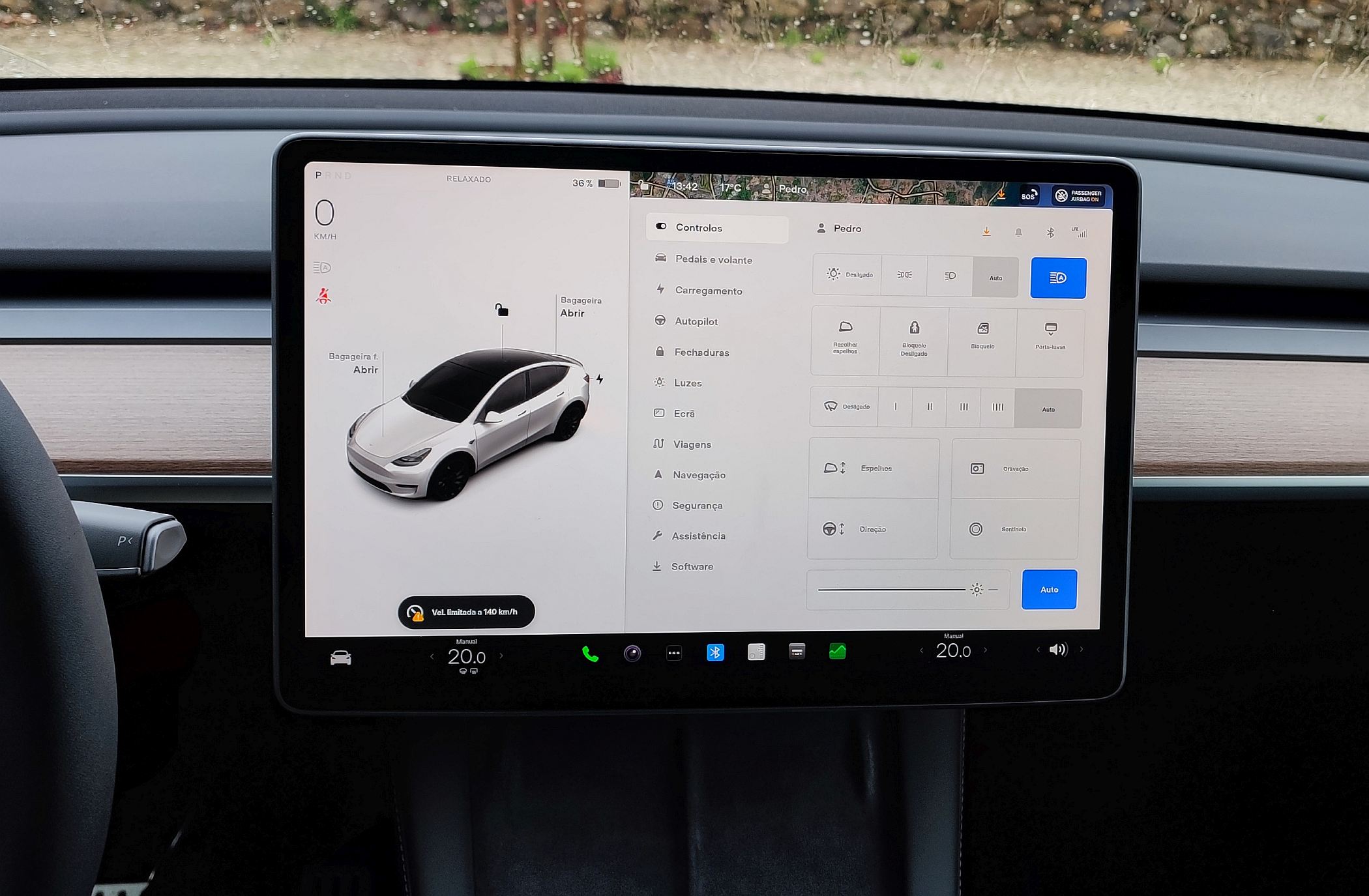 O sistema, que é também fácil de compreender após algum tempo, dá validade ao termo menu: há uma página para cada tópico, como para os controlos do veículo (ajuste dos espelhos, etc), modos de condução, carregamento, Autopilot (de série neste modelo), luzes, dados de viagens ou navegação, entre outros, não faltando também os ‘brindes’ como jogos para passar o tempo quando no habitáculo à espera para alguma coisa.