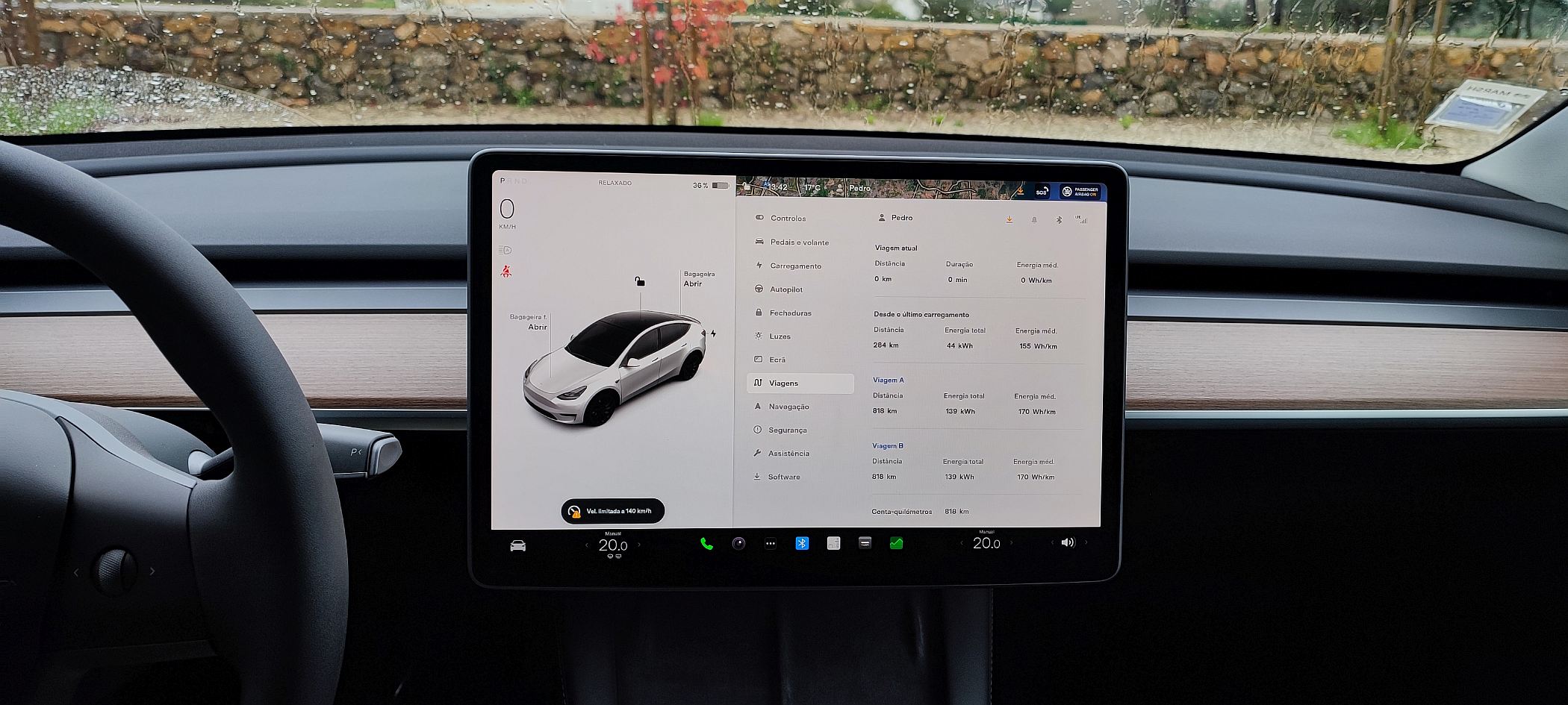Por outro lado, na vertente da segurança, o Autopilot com controlo automático do veículo em autoestrada é um dado vantajoso, já que tem um desempenho muito competente na larga maioria das ocasiões. Naturalmente, ainda há um caminho a percorrer – por exemplo, numa via rápida de 100 km/h, o sistema definiu como máximo os 120 km/h e tentou lá chegar.