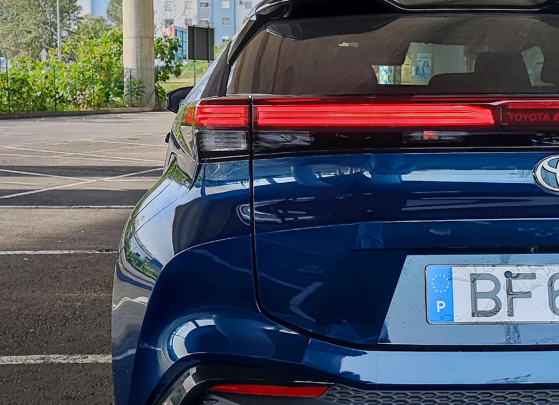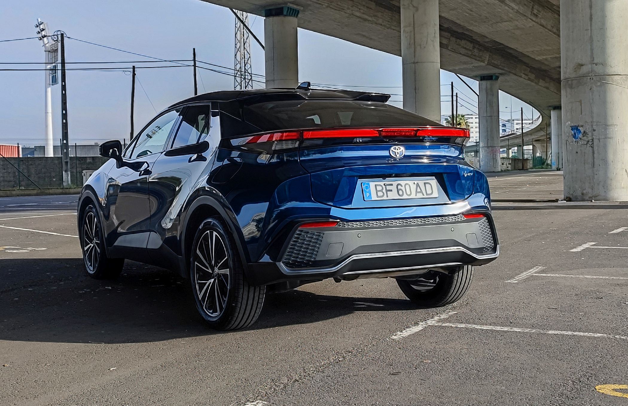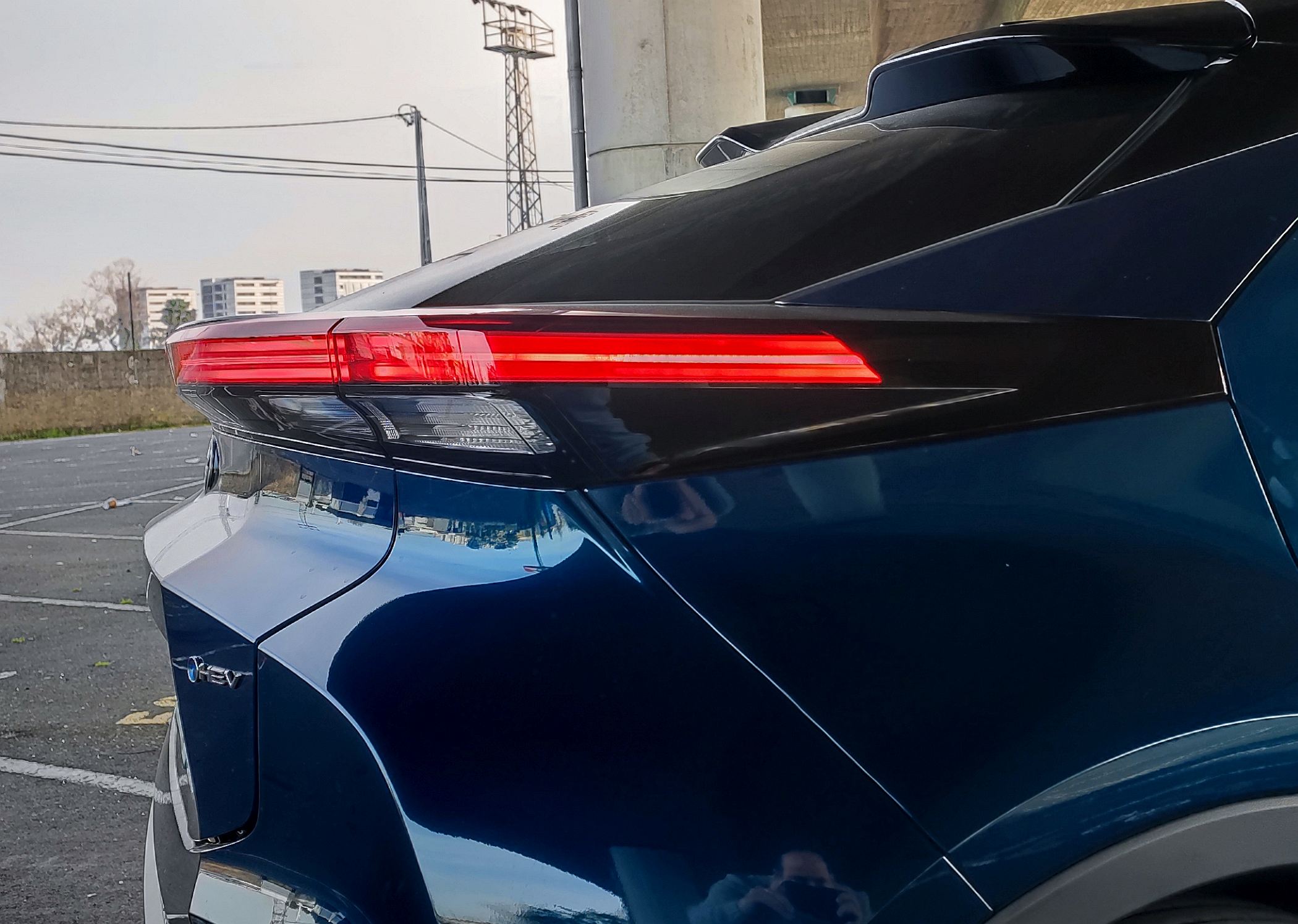 Na traseira, há duas áreas de destaque, uma correspondente à tampa da bagageira saliente e com um spoiler dividido a marcar a linha de tejadilho e, a outra, relativa à secção inferior com um para-choques que parece sobressair. Essas duas áreas são divididas pelos farolins de estilo horizontal e com a denominação ‘Toyota C-HR’ ao centro, acendendo-se de noite. Nota, ainda para todo o trabalho feito na aerodinâmica para tornar o novo SUV mais eficiente.