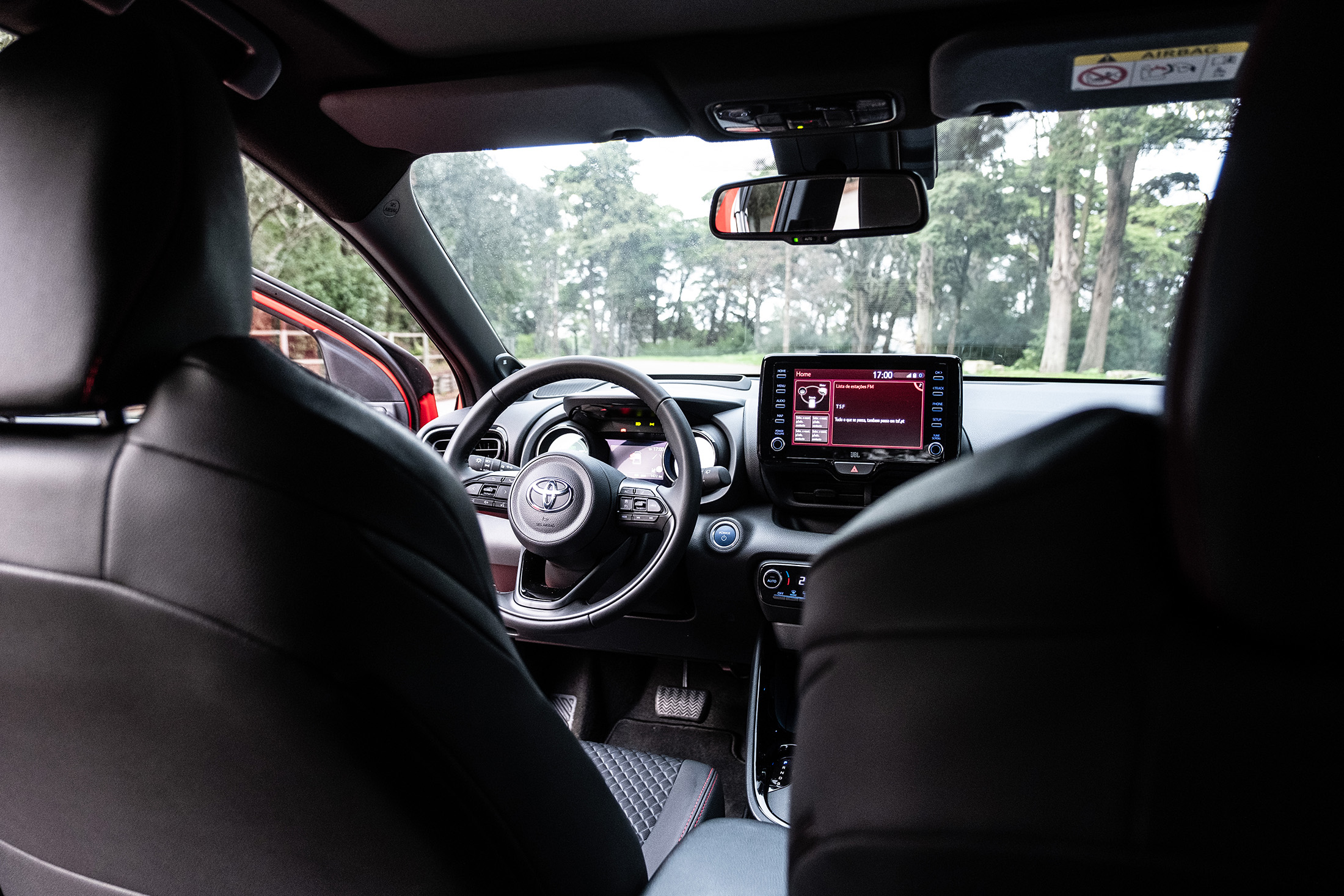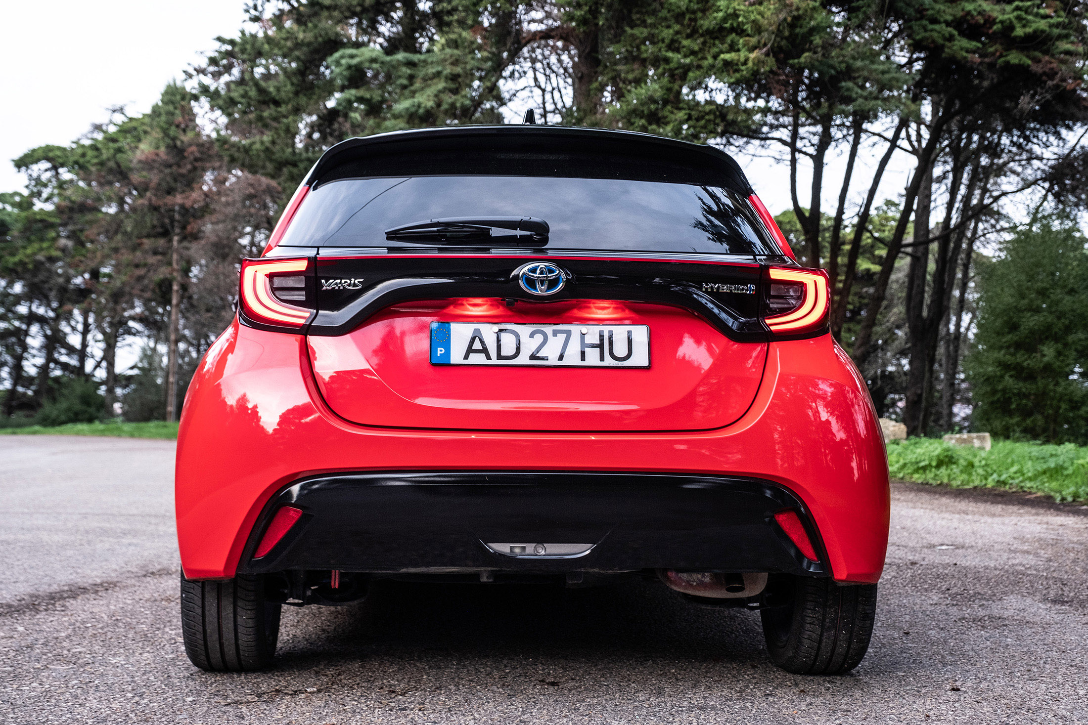 No centro do tablier está o ecrã tátil de infoentretenimento que, felizmente, tem botões físicos para acesso às funções – a Toyota continua a insistir num interface pouco intuitivo e claramente ultrapassado. A eliminação de distrações durante a condução são uma prioridade no novo Yaris e para esse fim temos um “head-up display” que projeta a informação essencial no para-brisas. Chegamos ao preço. 25 990€ para a versão testada que se justifica pelo equipamento incluído: Android Auto e Apple Car Play, vidros escurecidos, ar condicionado automático bizona, bancos desportivos em tecido e pele sintética, sensores de luz e chuva, câmara de marcha atrás, travão elétrico, sistema de som JBL com oito colunas, volante multifunções em pele, faróis LED para iluminação e circulação diurna, luzes de nevoeiro e óticas traseiras, máximos automáticos, reconhecimento de sinais, head-up display projetado, cruise control adaptativo, aviso de saída de faixa, travagem de emergência, sistema pré-colisão, jantes de 17 polegadas maquinadas, e ainda um tejadilho panorâmico, que é uma pena ser tão difícil abrir e fechar a sua cobertura.
