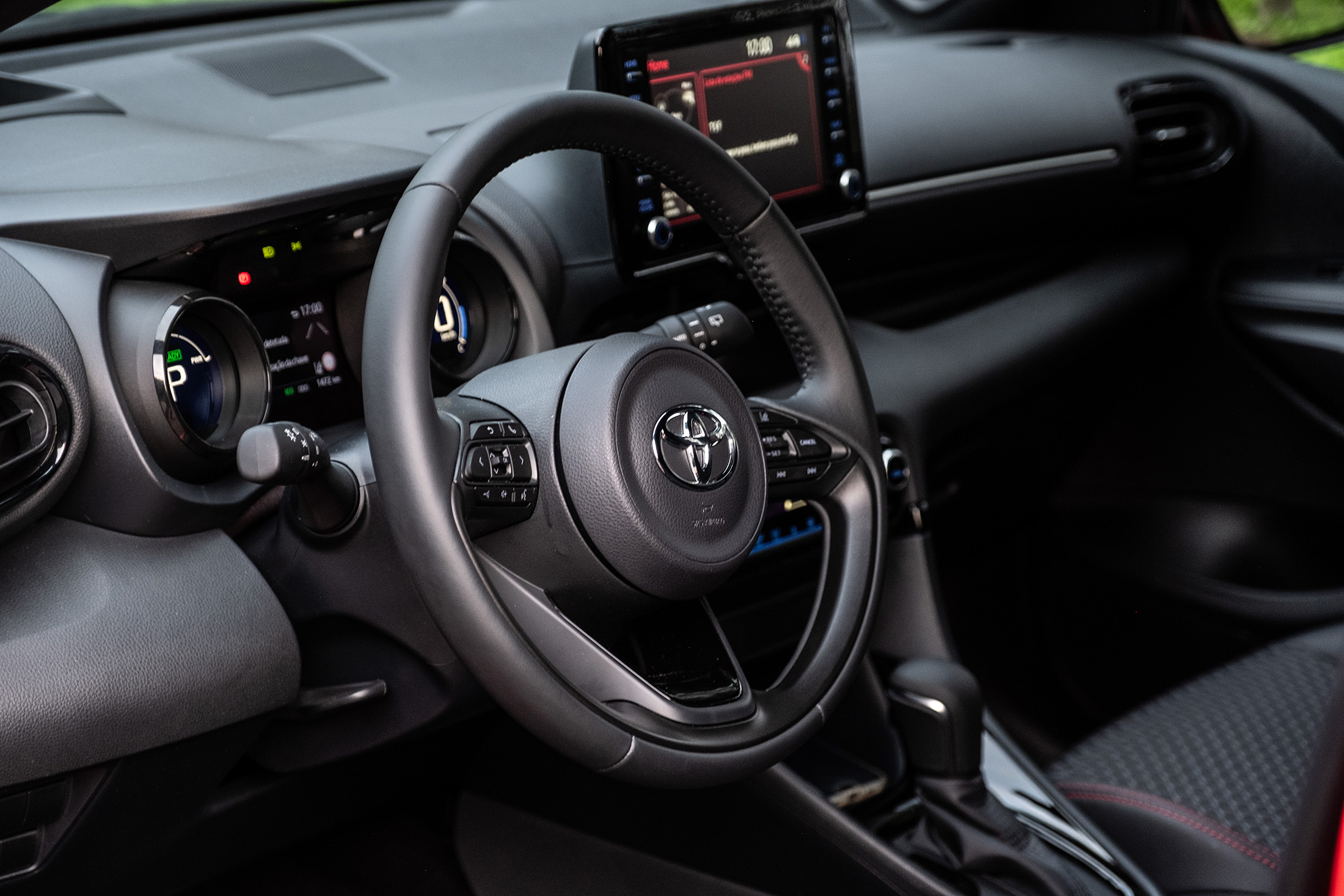 No entanto, o automóvel mais ecológico da altura não era assim tão empolgante de conduzir. Face à geração anterior, o novo Yaris não deixa ninguém indiferente. Parece que foi ao ginásio. Está musculado, mais largo, mais baixo e ligeiramente mais curto, mas com uma maior distância entre eixos, fruto da nova plataforma GAB estreada no modelo. O sistema de propulsão está agora na quarta geração que combina na versão testada um motor elétrico com 80 cv e um motor de combustão 1.5 l de três cilindros com 90 cv de ciclo Atkinson. Neste motor a abertura das válvulas de admissão é retardada, gerando menos atrito na câmara de combustão para aumentar a eficiência térmica. Dessa forma economiza combustível e por isso é uma escolha para automóveis híbridos. Infelizmente, a potência combinada fica-se pelos 116 cv, mas é preciso não esquecer que o objetivo deste automóvel é ser eficiente. Em percurso extraurbano verificámos uma média de 4,9 litros aos 100 quilómetros; já em auto-estrada e fazendo uso do “cruise control” a uma velocidade de 120 km/h, obtivemos 4,5 litros. Longe dos 3,7 litros indicados pela marca em ciclo combinado, mas mantendo ainda assim uma boa dose de frugalidade.