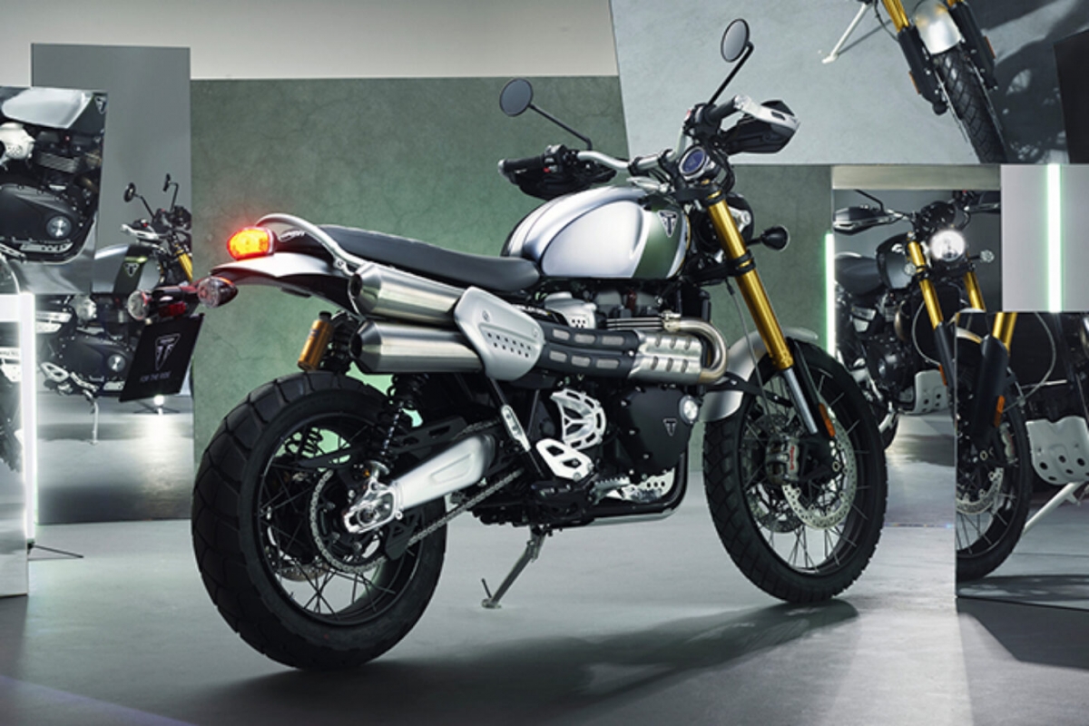 A Scrambler 1200 XE Chrome Edition distingue-se pelo depósito de combustível cromado com faixa pintada em Brooklands Green; Já o guarda-lamas e escudo térmico são em alumínio escovado, com farol e painéis laterais em Jet Black.