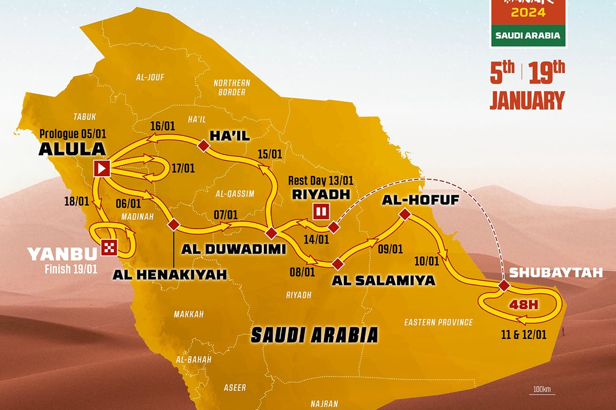 A prova começa em Al-Ula com um prólogo no dia 5 e termina em Yanbu, no dia 19, sendo que há um dia de paragem, dia 13, em Riyadh. Serão um total de 7.881 quilómetros, dos quais 4.727 serão cronometrados.