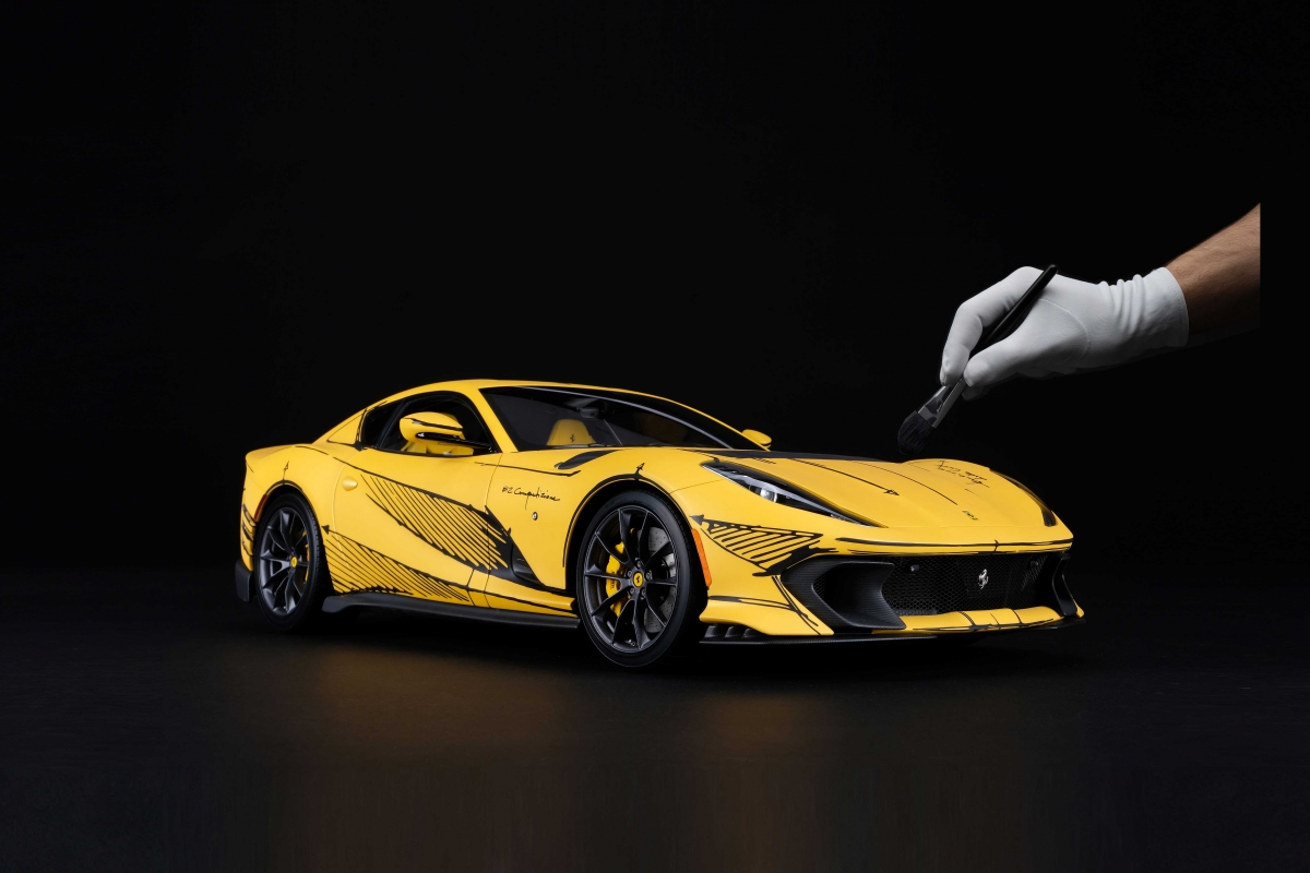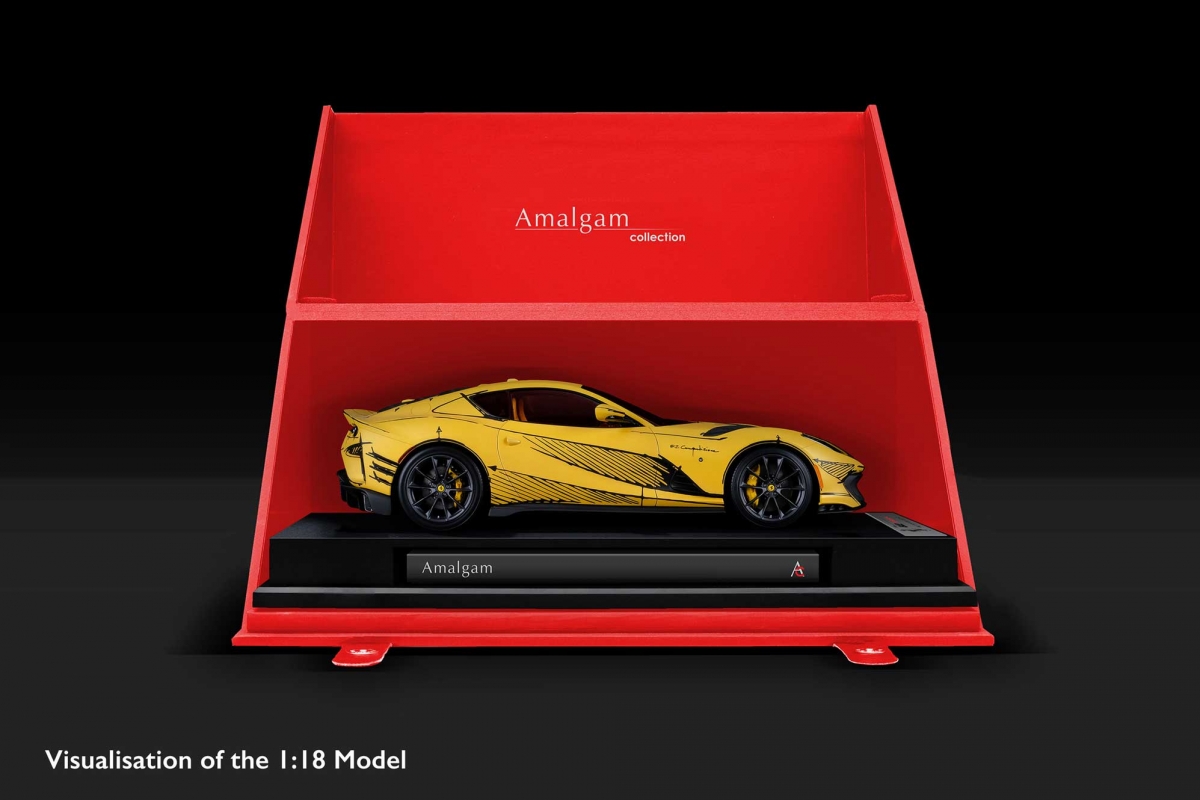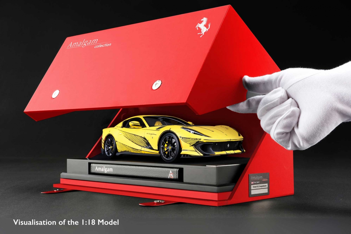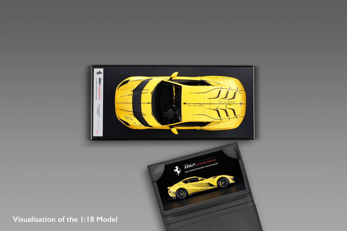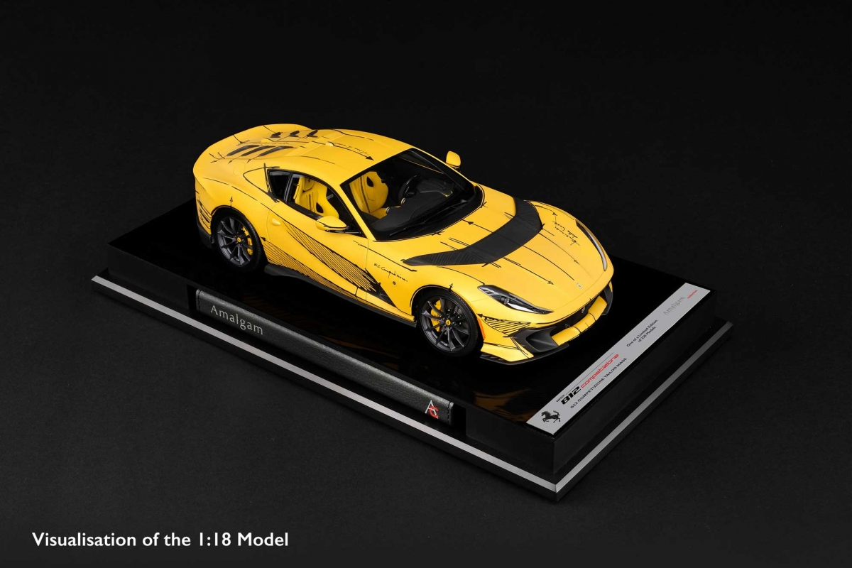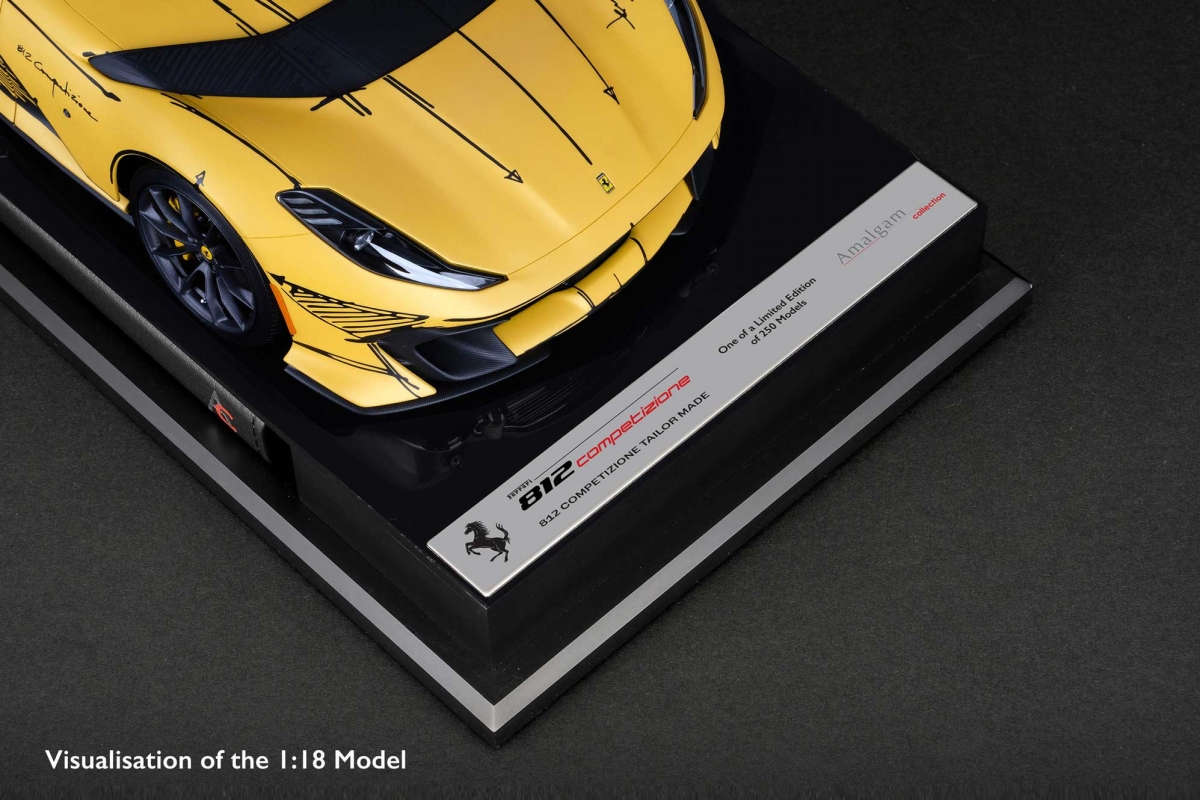 Cada modelo à escala 1:18 terá mais de 25 centímetros de comprimento e será produzido e montado nas oficinas da Amalgam Collection. Usando os dados CAD originais fornecidos pelo Ferrari Centro Stile, os artesãos da Amalgam serão capazes de recriar na perfeição cada detalhe refinado do único 812 Competizione Tailor Made, desde as tintas originais precisamente misturadas para combinar com o exterior matte Giallo Tristate do modelo real, até ao interior que captura perfeitamente a arte dentro do exemplar original. O toque final será a aplicação dos detalhes meticulosos na cor matte Nero DS Sketch.