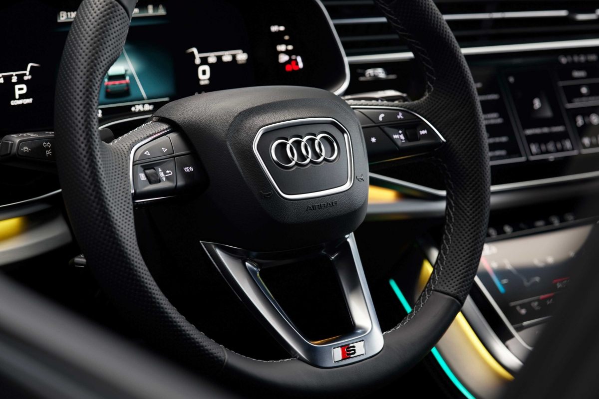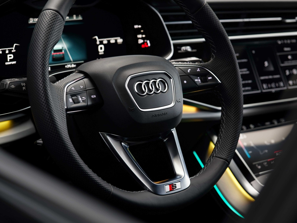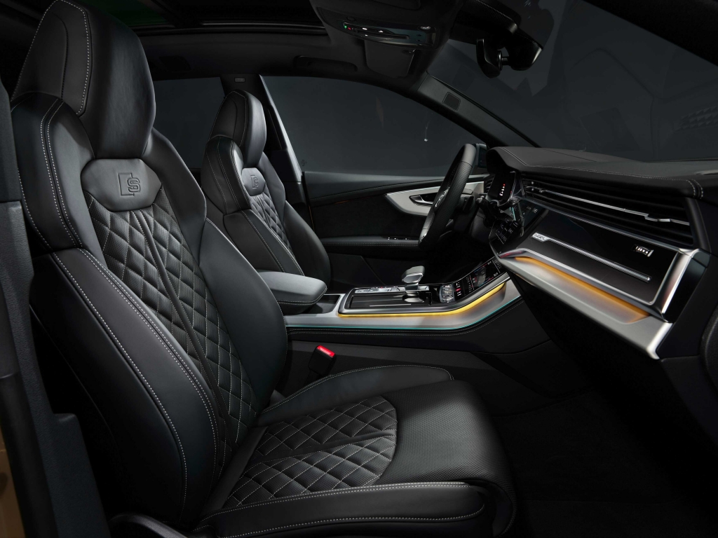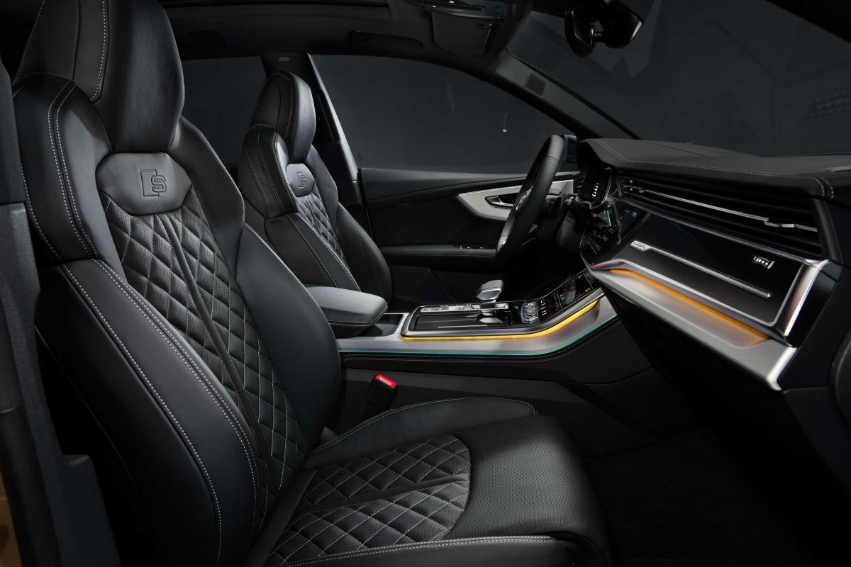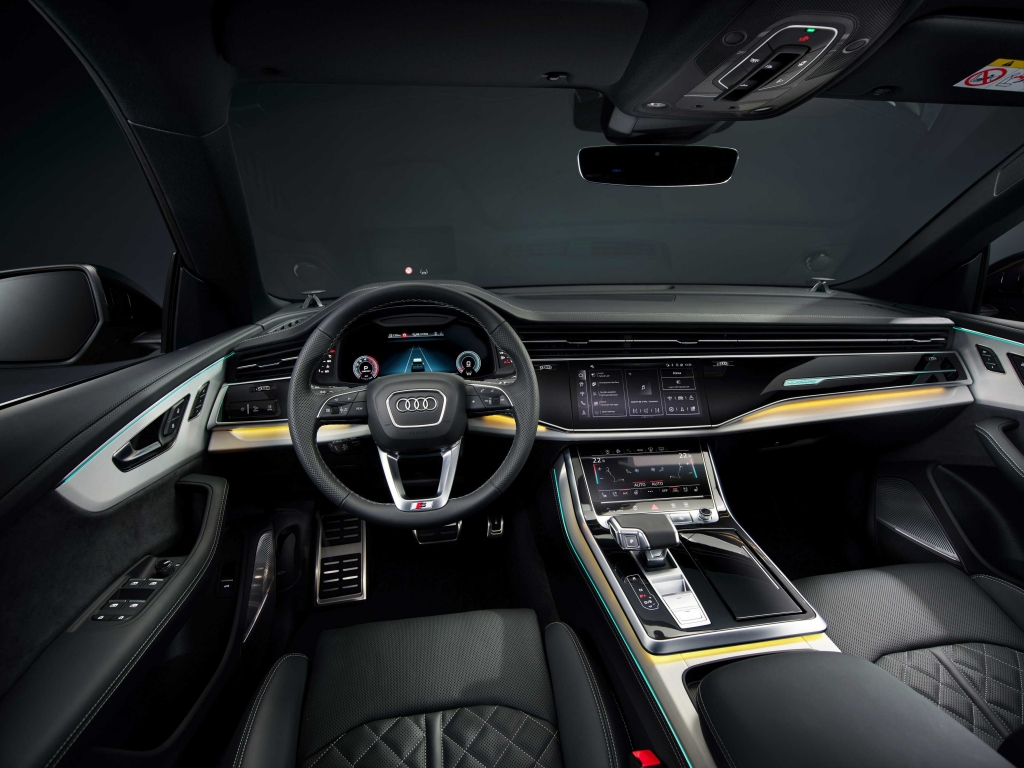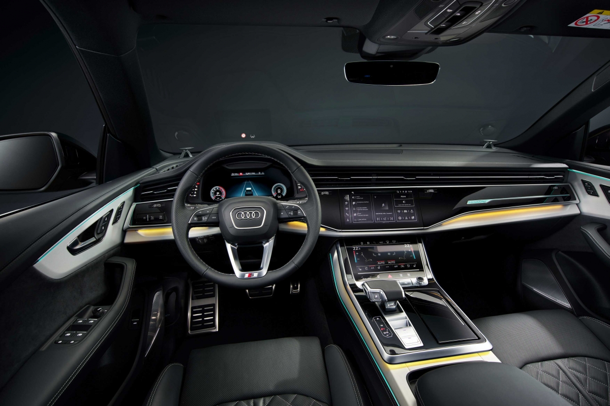 Lá dentro, a Audi também realizou alterações. As costuras dos bancos em cinza contrastante são de série na versão base. No que se refere aos sistemas de assistência, o painel de instrumentos recebeu algumas modificações, já que o virtual cockpit da Audi passa a apresentar online o aviso de mudança de faixa, o aviso de distância para outras viaturas que circulam na via (camiões, automóveis e motociclos), a assistência em cruzamentos e a informação sobre semáforos com uma impressionante qualidade Full HD. Para além do novo ecrã, a atualização do Q8 também amplia o seu equipamento de série: câmara de visão traseira, assistente de estacionamento e de máximos, entre outros.