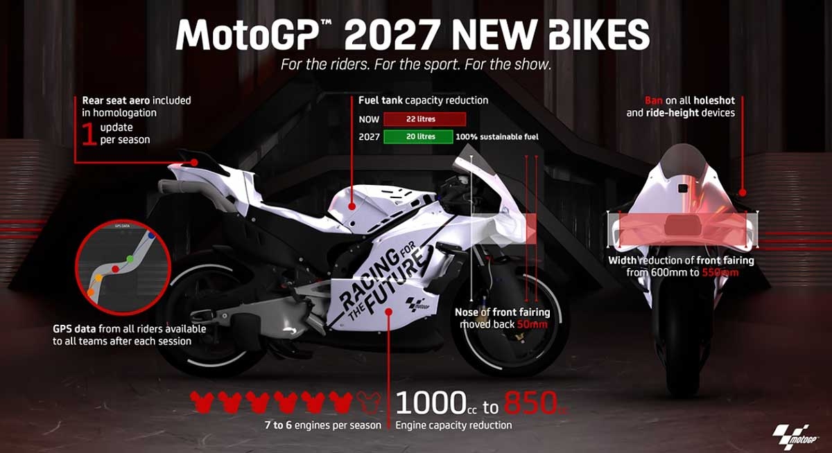 Vai ser reduzida a cilindrada para um limite máximo de 850 cc, em detrimento dos atuais 1000 cc, além de que apenas vão passar a estar disponíveis seis motores por temporada, quando atualmente são sete. Além disso, o peso mínimo da moto vai passar dos atuais 157 kg para 153 kg.