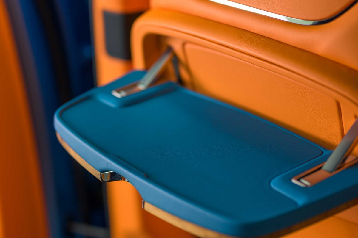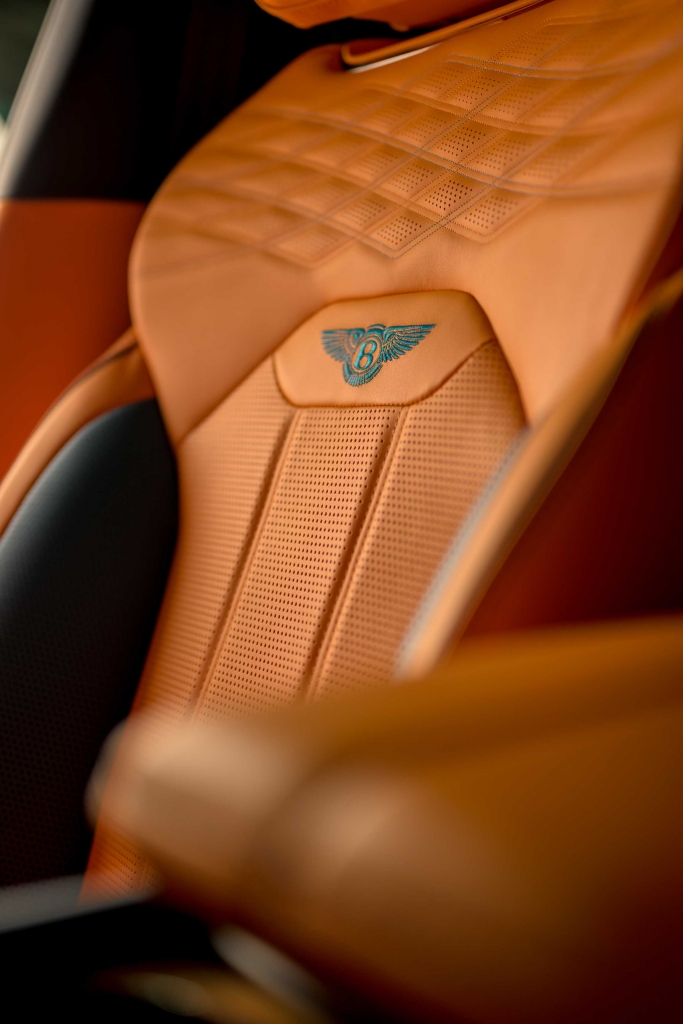 O interior deste Bentayga EWB único é tão deslumbrante como meticulosamente trabalhado, e os clientes passaram muitas horas a explorar a paleta de opções com Phill Dean. As suas escolhas incluíram a configuração de quatro lugares com a especificação de assento de avião da Bentley para os dois lugares traseiros, sistema áudio Naim e iluminação ambiente. No entanto, mais vibrante é a visão de luxo dos clientes, com um habitáculo numa combinação dramática de pele Mandarim e Imperial Blue. O folheado Open Pore Koa, leve, contemporâneo e sustentável, foi escolhido para o painel de instrumentos, a consola central traseira, revestimento interiores das portas e as mesas retráteis. Mas são os toques de pele Kingfisher que causam o impacto mais dramático, surgindo nos apoios dos bancos, no volante, na alavanca da caixa de velocidades e no revestimento das portas. A pele Kingfisher também se revela na superfície superior das mesas de piquenique quando abertas.