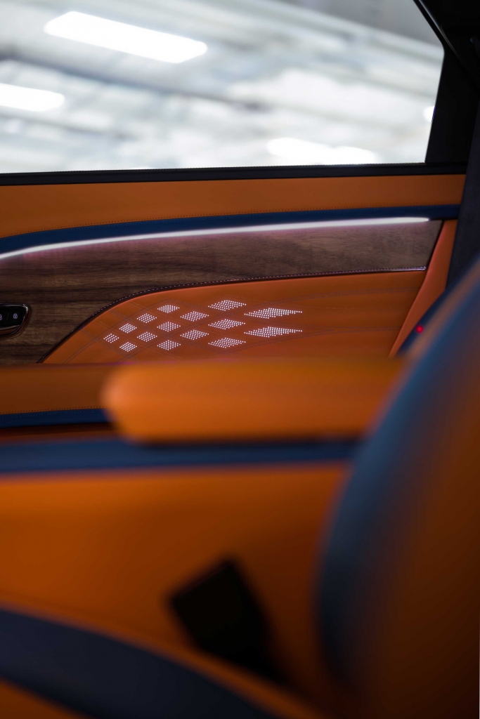 Um cofre da Mulliner proporciona segurança para joias e objetos de valor e é fornecida numa combinação de pele Imperial Blue e Mandarin, com Alcantara Imperial Blue para as superfícies interiores. Os logos nos bancos são bordados em Kingfisher, sendo a mesma cor utilizada na costura de contraste em todo o habitáculo. Até mesmo os tapetes em Azul Imperial apresentam um micro revestimento em Kingfisher com costuras em Mandarim e revestimento exterior. As placas nas soleiras das portas são gravadas com a mensagem “One of One” personalizada para o cliente.
