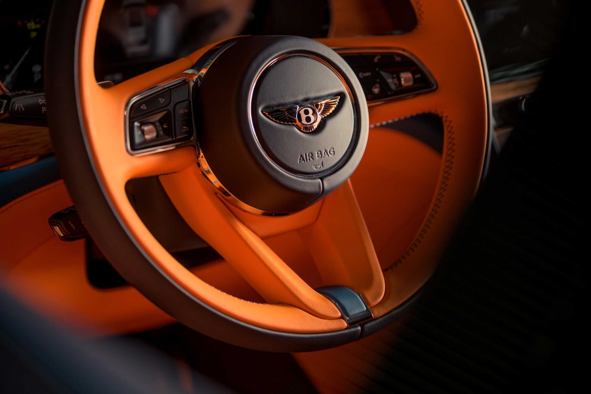 O acabamento Onyx escolhido para o capô, o tejadilho e a parte superior da carroçaria está perfeitamente integrado com a grelha em preto brilhante, as entradas de ar dianteiras, as aberturas das asas, as linhas laterais da carroçaria e o difusor traseiro da especificação Blackline. Contrasta de forma dramática com o acabamento em azul Kingfisher, enquanto o tejadilho e o habitáculo escuros criam uma impressão visual mais baixa e desportiva. A divisão de cores repete-se nas jantes de 22″ de dez raios com um acabamento pintado em Kingfisher e Beluga. Os emblemas fixos nas jantes Bentley dão o toque final ao exterior.