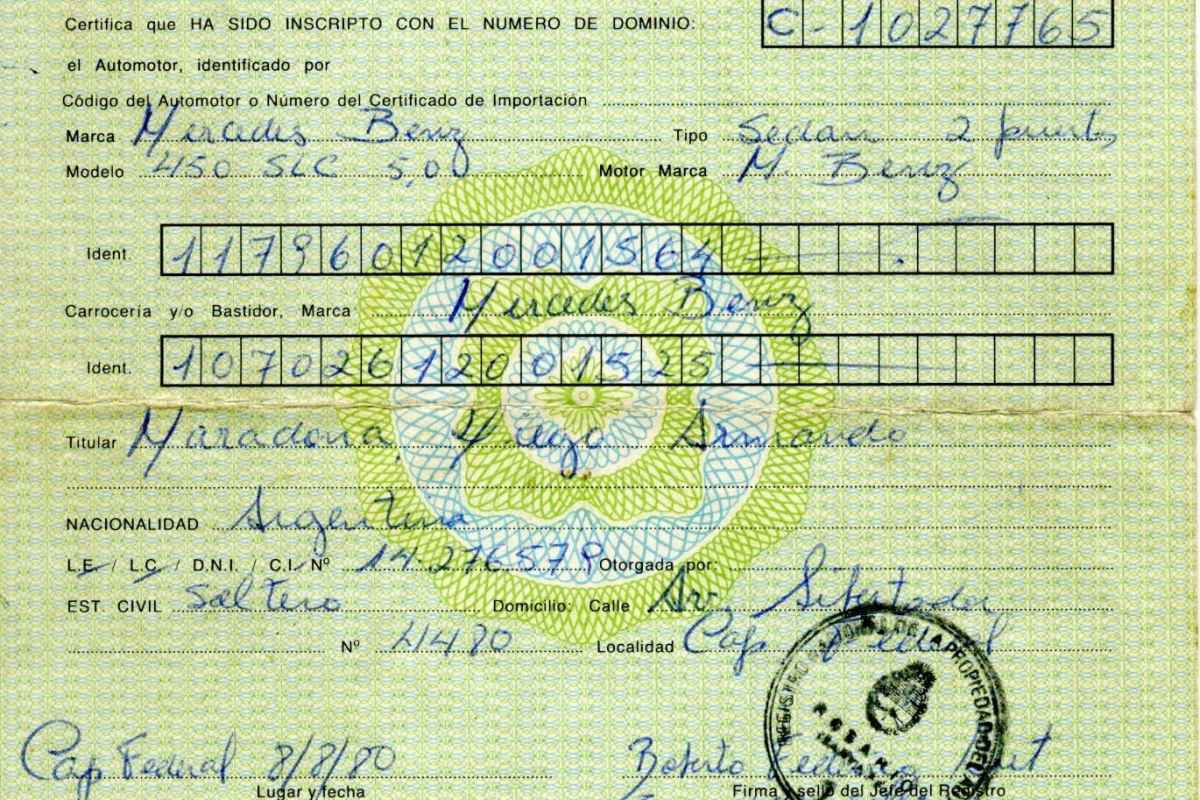 Maradona recebeu o seu Mercedes-Benz 450 SLC 5.0, em 1980, pelo próprio Juan Manuel Fangio, que era o responsável pela distribuição da Mercedes-Benz na Argentina, pintado na cor Signal Red, a cor do seu clube.