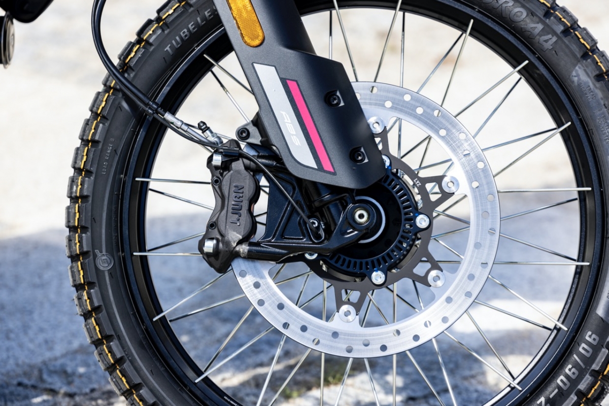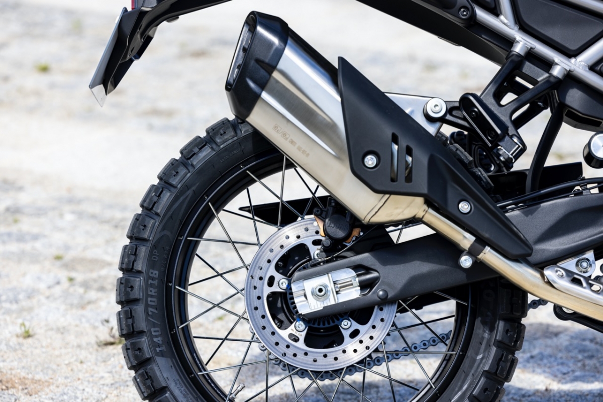 A travagem é perfeitamente aceitável, com uma mordida inicial muito suave (sem dúvida uma vantagem em todo-o-terreno). O disco único na frente de 320 mm com pinça de dois pistões e o traseiro de 240 mm cumprem a sua função de uma forma muito eficiente e sem surpresas. Um grande interruptor instalado no guiador, permite-nos desactivar o ABS traseiro e o controlo de tracção em segundos, em movimento, se assim o desejarmos.