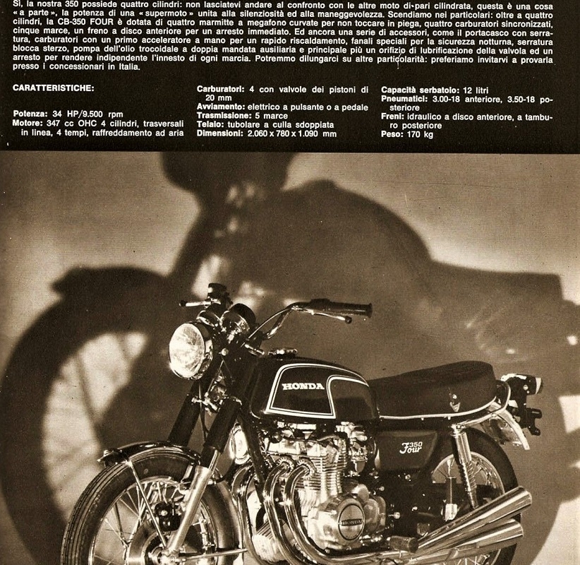 Quatro cilindros em linha (quando o “padrão” eram dois), pelo menos um disco de travão à frente uma ciclística muito aceitável, posição de condução descontraída, qualidade de construção fabulosa (cromados irrepreensíveis, pintura de qualidade…) arranque elétrico ou por pedal (apenas como sistema de redundância) e uma velocidade de ponta a rondar os 200 km/h! Uma barbaridade para a época! O sucesso foi de tal ordem que, ao longo da sua vida, foram produzidas mais de 400.000!