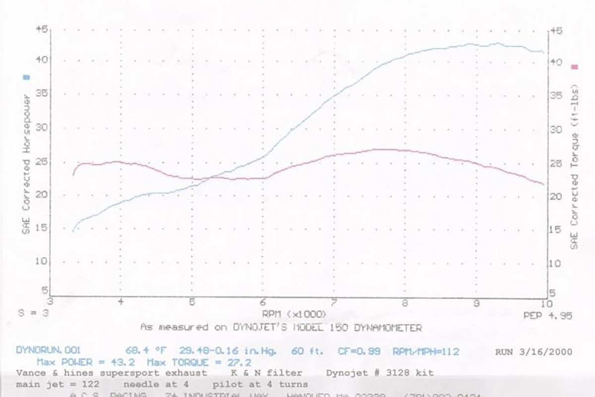 A posição de condução não é muito exigente (para os mais altos a moto facilmente se torna “pequena”) e os “avanços” ficam à mão de semear (mais tarde adotou um guiador convencional). O motor responde muito bem logo a partir das 5.000 rpm, mas lida mesmo bem é com os altos regimes, indo até às 10.000 rpm sem queixumes! De acordo com a indicação da marca, o valor máximo de binário é de cerca de 42 nm às 7.500 rpm e os cerca de 50 cv surgem por volta das 9.200 rpm! Veja-se este gráfico para se ter uma ideia mais clara das curvas da potência e binário.