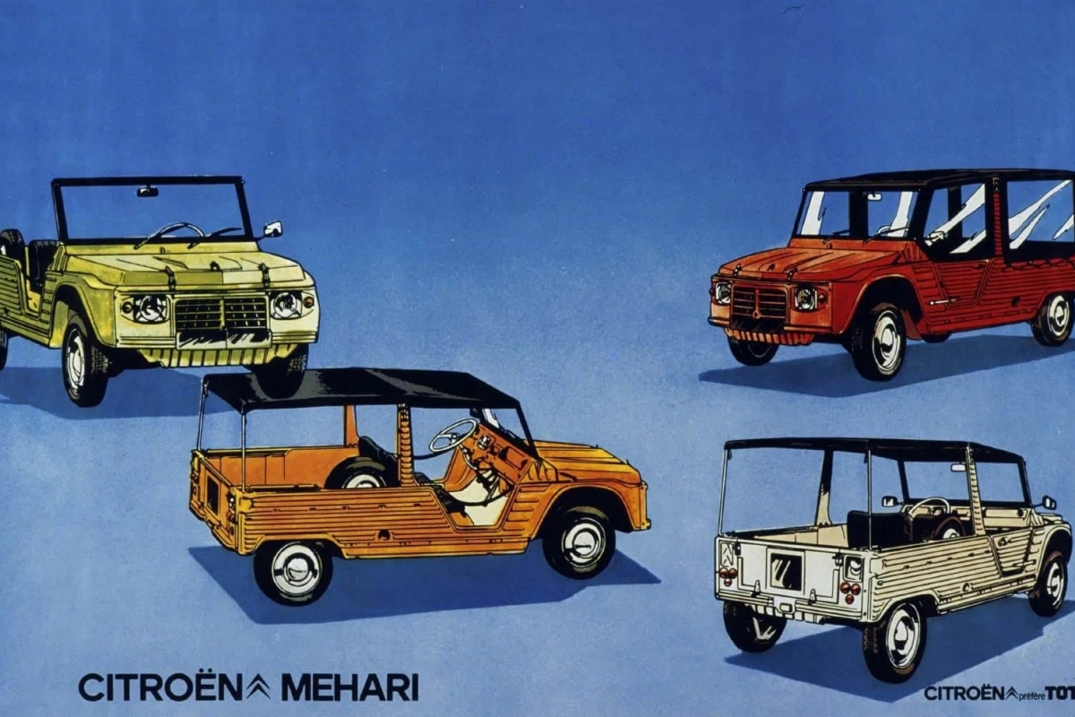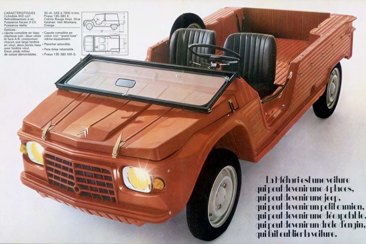 Historicamente falando, poderá trazer um dos 145 mil Meharis para sua casa, sabendo desde já que tem quatro lugares, e inicialmente as cores disponíveis eram vermelho Hopi, o verde Montana e o beije Kalahari. O cor-de-laranja que surgiu em 1976 e mais tarde surgiram outras variantes no verde.