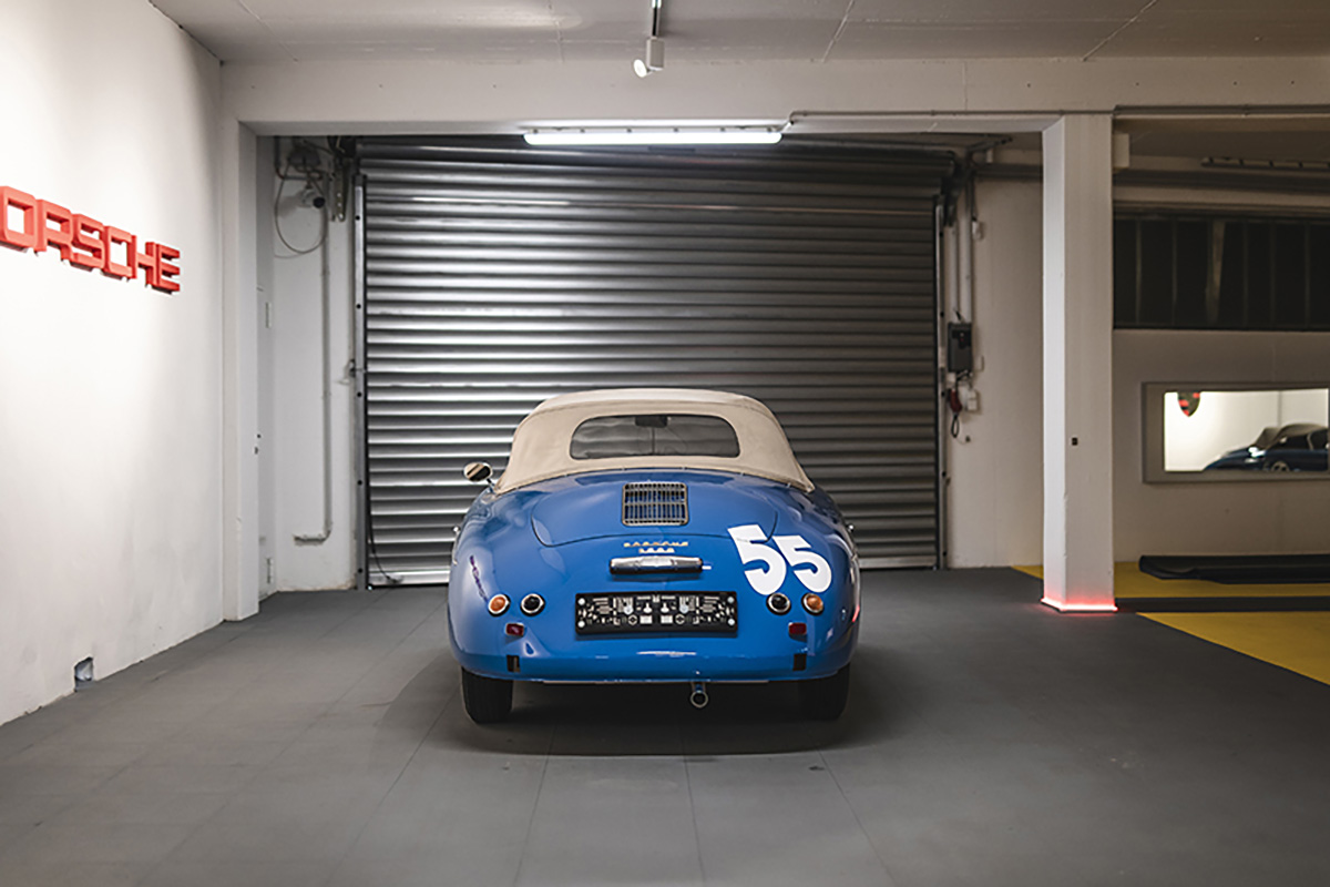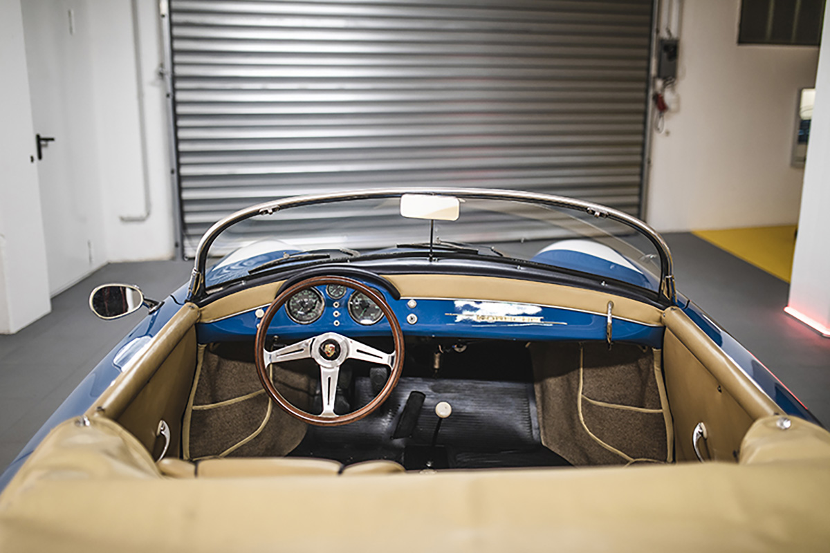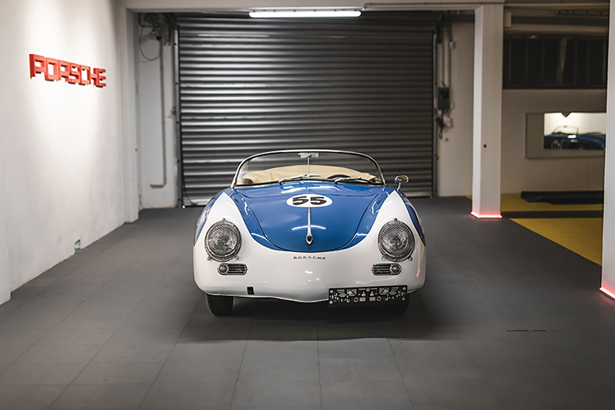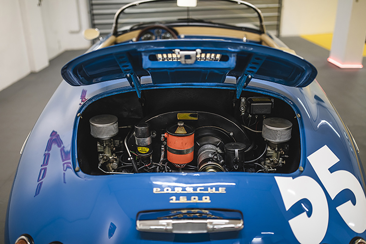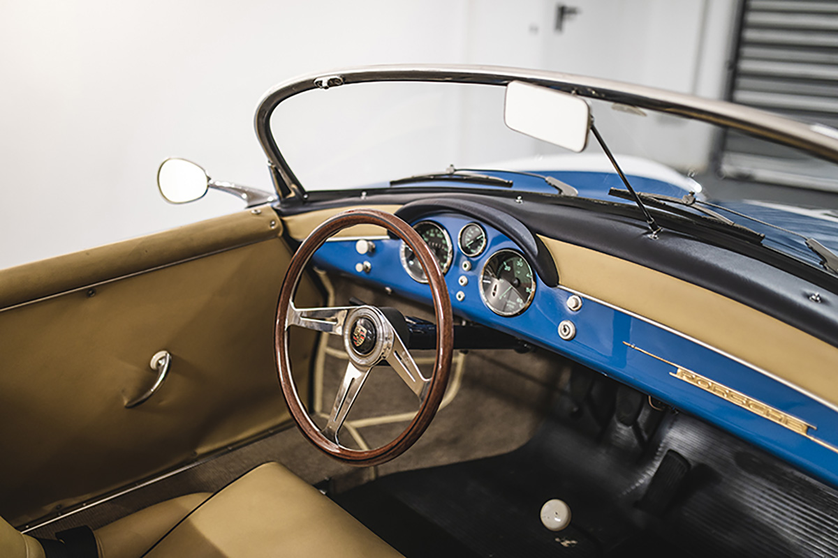 Este Porsche 356 Speedster está pintado numa cor extremamente rara, designada de Sky Blue, que combina com o interior em pele bege Sahara, estufado pelo italiano Stefan Widmann. O Porsche 356 Speedster nasceu da vontade do importador da marca para os E.U.A, Max Hoffman, que conhecia bem os seus clientes. Este exemplar pertence às 1033 unidades produzidas em 1955, vendido novo no stand de Hoffman, em Nova Iorque. Este automóvel está equipado com o motor de 1,5 litros com 60cv. O seu valor estimado de venda situa-se entre os 275 mil e os 325 mil euros.