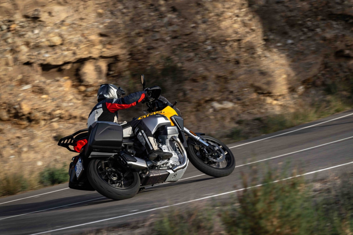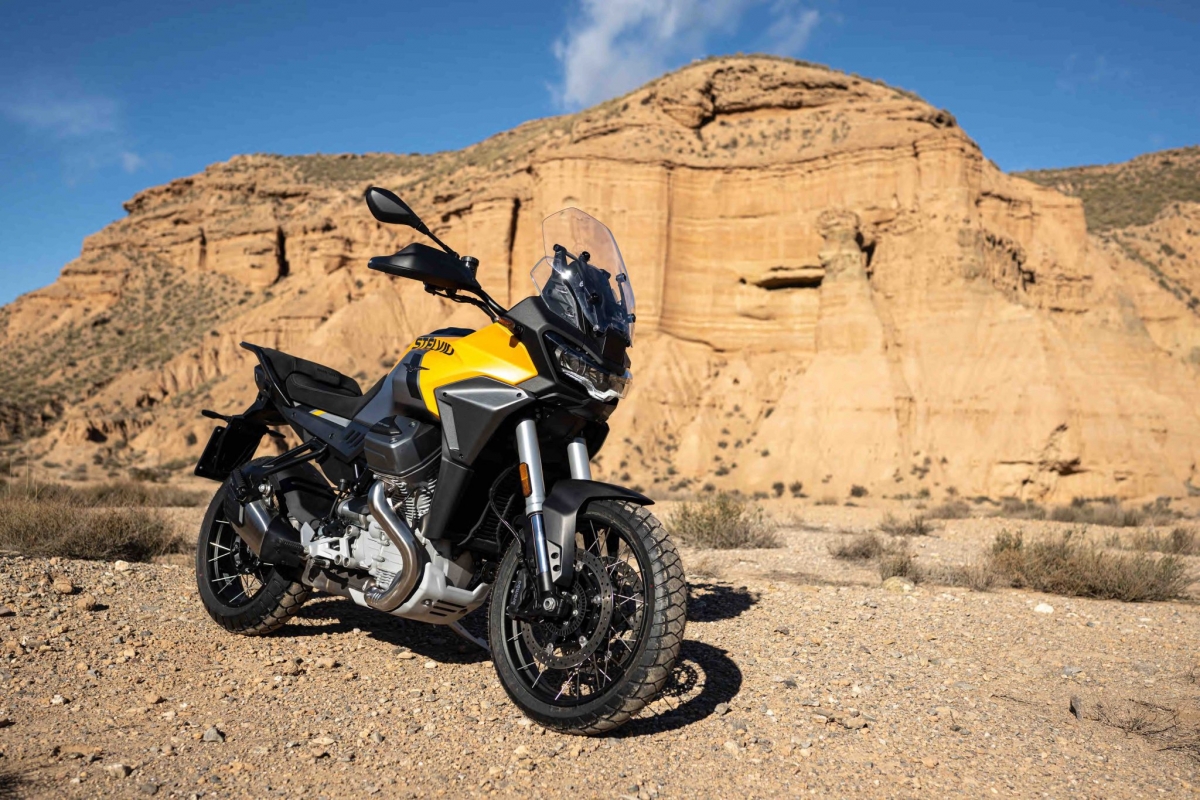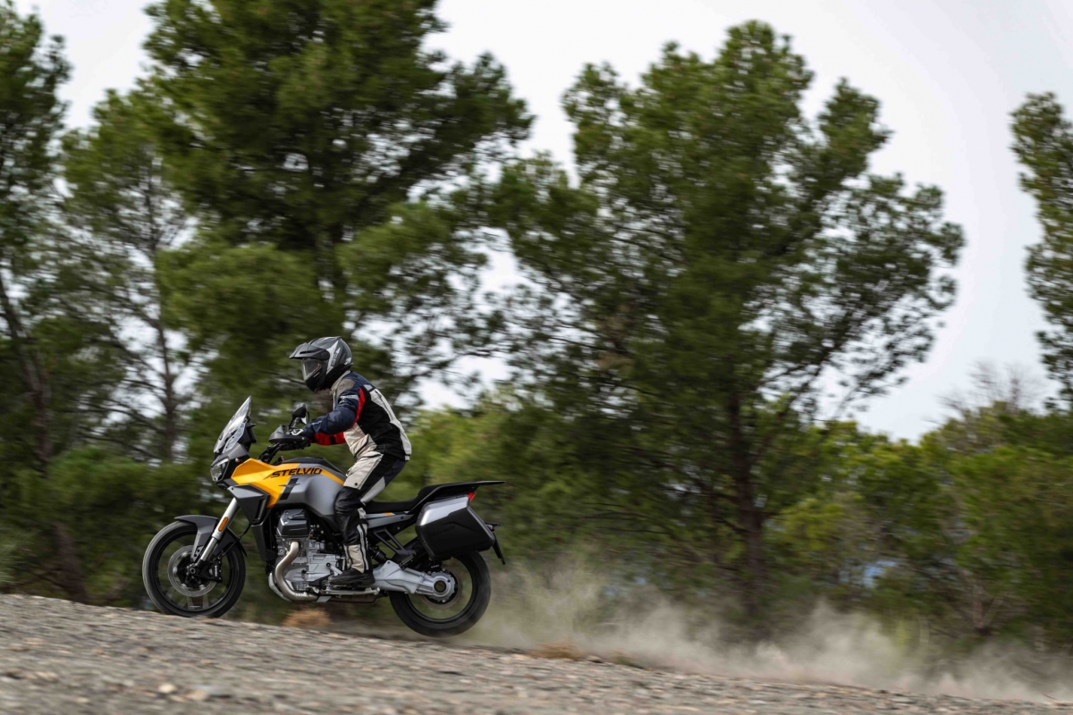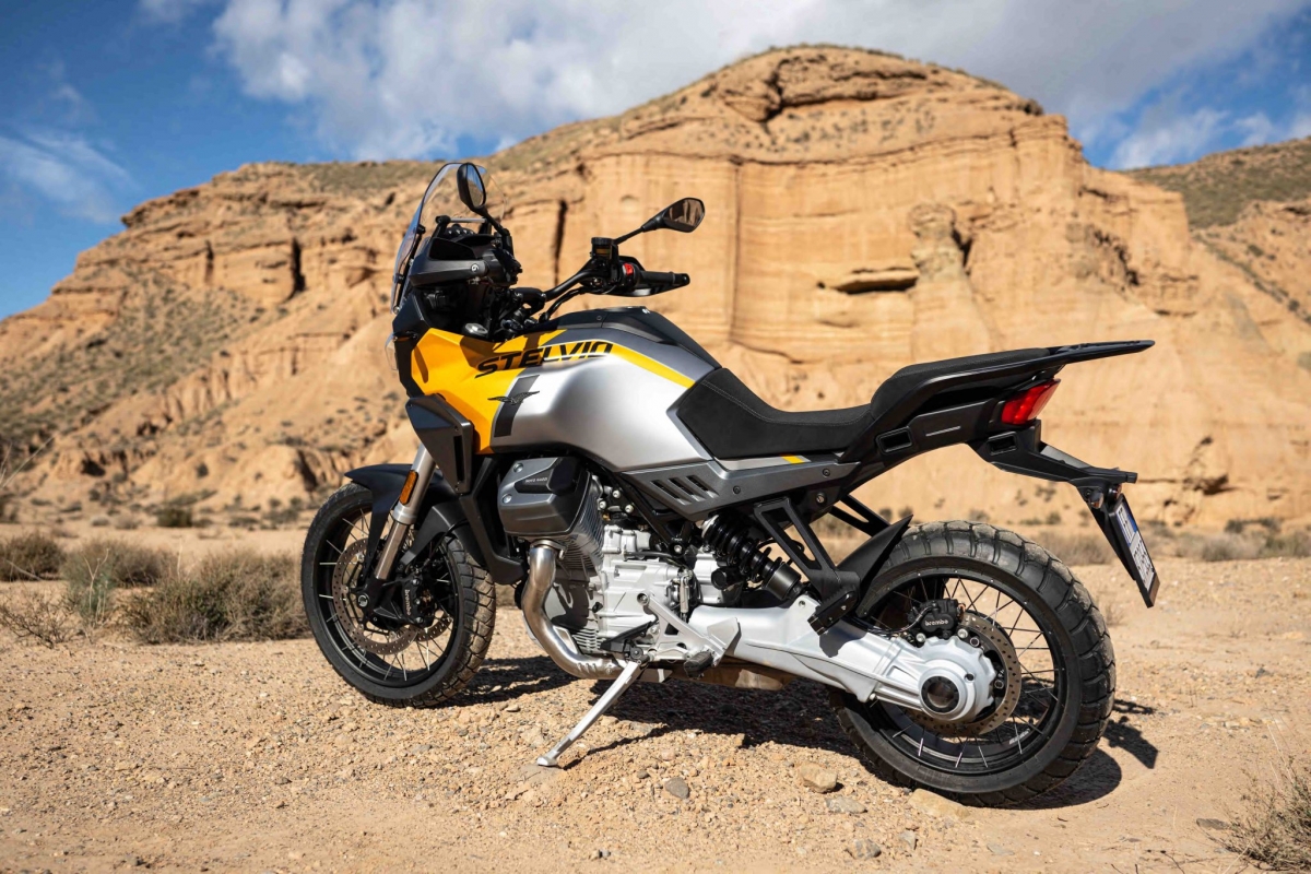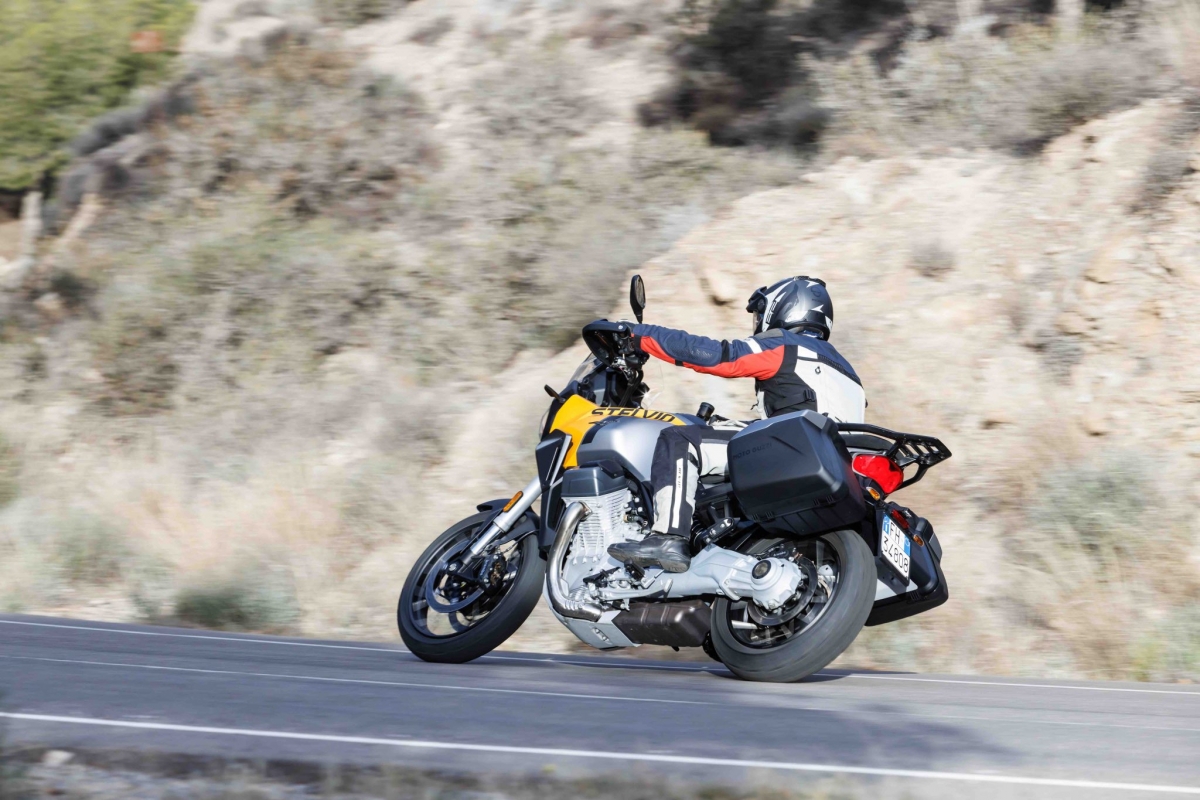 A empatia pela nova Moto Guzzi Stelvio chega-nos desde o primeiro olhar. Vemos todos os traços característicos do modelo que se estreou pela primeira vez no mercado em 2007, mas melhorados em todos os aspectos: está mais esguia, moderna, com traços mais contemporâneos, muito elegante, com a nova geração do poderoso bloco em V a 90º, acabamentos de luxo e equipamento de altíssimo nível. Além disso, as formas compactas e a tecnologia disponibilizada por esta nova geração, fazia-nos ansiar, muito, por este contato dinâmico. E ele chegou e fomos os únicos representantes da imprensa portuguesa a podermos testemunhar em primeira mão, nas belíssimas estradas da região de Almería, em Espanha, as qualidades da nova Stelvio. Como já referimos, a sport/turismo V100 Mandello serviu de base a esta maxi-trail, porque quando foi idealizada, contemplava uma plataforma que pudesse ter diversas aplicações. Uma ciclística de luxo, acompanhada por um design de referência e um ultra-moderno e poderoso motor. São 115 cv de potência mais que suficientes para nos fazer desfrutar em pleno deste modelo versátil, que permite viagens grandes, dentro ou fora do asfalto, de forma confortável, mas também a utilização diária e até aventuras off road, esporádicas.