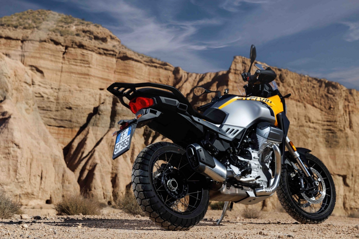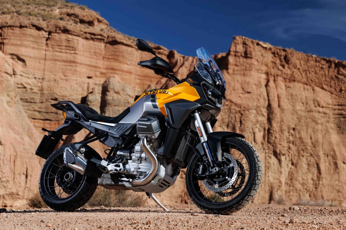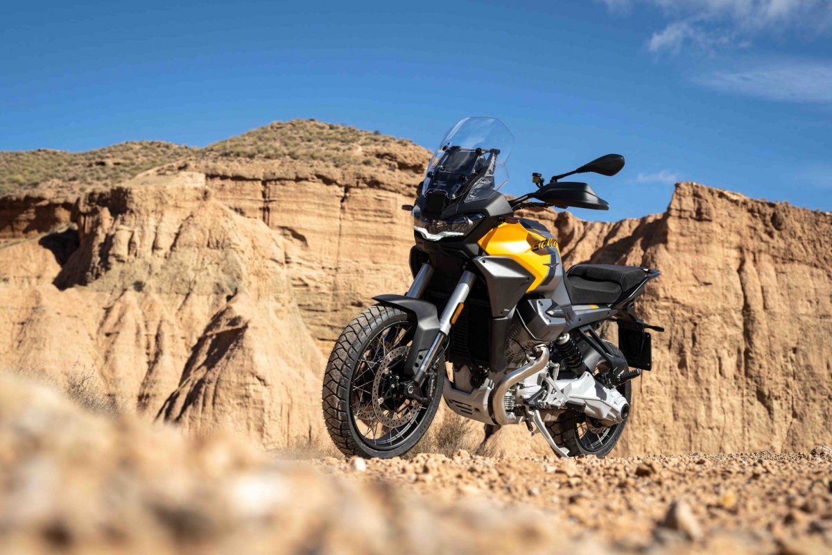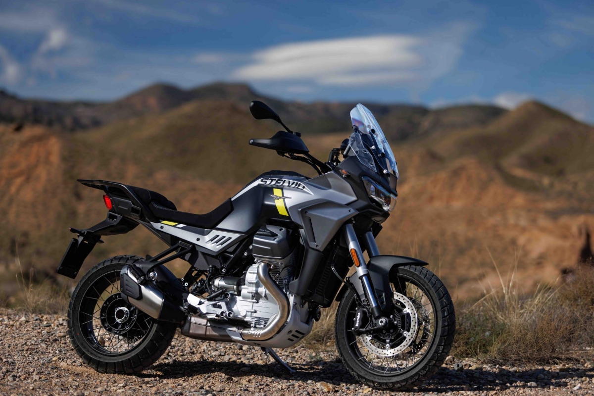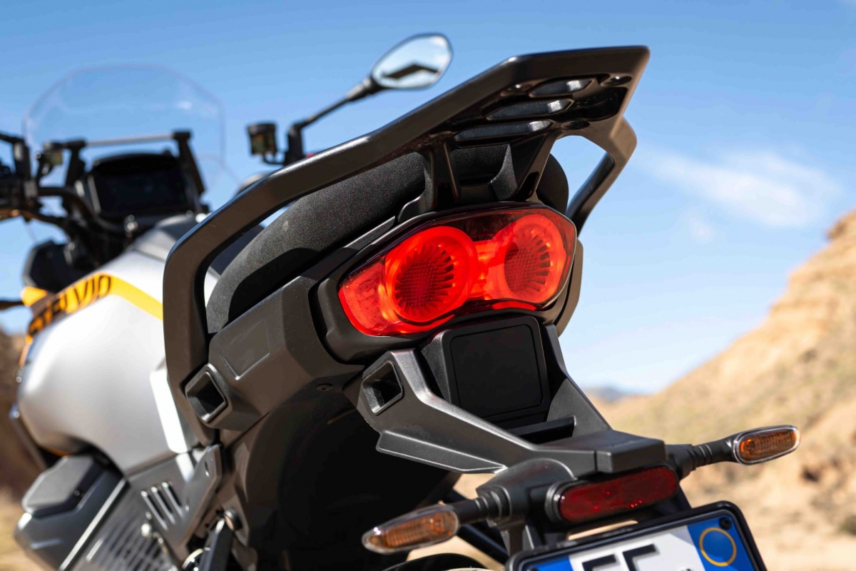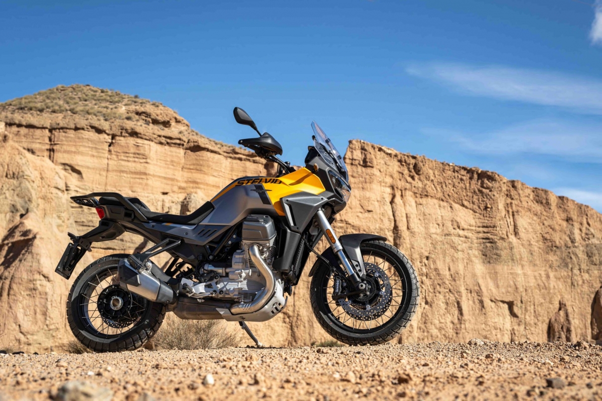 A empatia pela nova Moto Guzzi Stelvio chega-nos desde o primeiro olhar. Vemos todos os traços característicos do modelo que se estreou pela primeira vez no mercado em 2007, mas melhorados em todos os aspectos: está mais esguia, moderna, com traços mais contemporâneos, muito elegante, com a nova geração do poderoso bloco em V a 90º, acabamentos de luxo e equipamento de altíssimo nível. Além disso, as formas compactas e a tecnologia disponibilizada por esta nova geração, fazia-nos ansiar, muito, por este contato dinâmico. E ele chegou e fomos os únicos representantes da imprensa portuguesa a podermos testemunhar em primeira mão, nas belíssimas estradas da região de Almería, em Espanha, as qualidades da nova Stelvio. Como já referimos, a sport/turismo V100 Mandello serviu de base a esta maxi-trail, porque quando foi idealizada, contemplava uma plataforma que pudesse ter diversas aplicações. Uma ciclística de luxo, acompanhada por um design de referência e um ultra-moderno e poderoso motor. São 115 cv de potência mais que suficientes para nos fazer desfrutar em pleno deste modelo versátil, que permite viagens grandes, dentro ou fora do asfalto, de forma confortável, mas também a utilização diária e até aventuras off road, esporádicas.