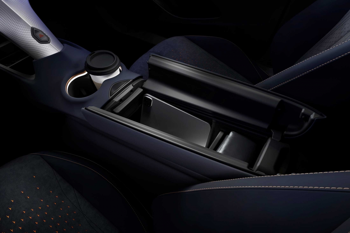O interior é peculiar e surpreendente, com rasgos que parecem retirados do carro do Batman. Falamos da espinha dorsal que se prolonga desde a parte central da consola até aos dois lados do tablier, para continuar para as portas. Depois encontramos os habituais dois ecrãs táteis, com o central de 15″, o mesmo do ID.7. A marca diz que melhorou a interação homem-máquina. Os bancos desportivos são feitos com materiais sustentáveis.