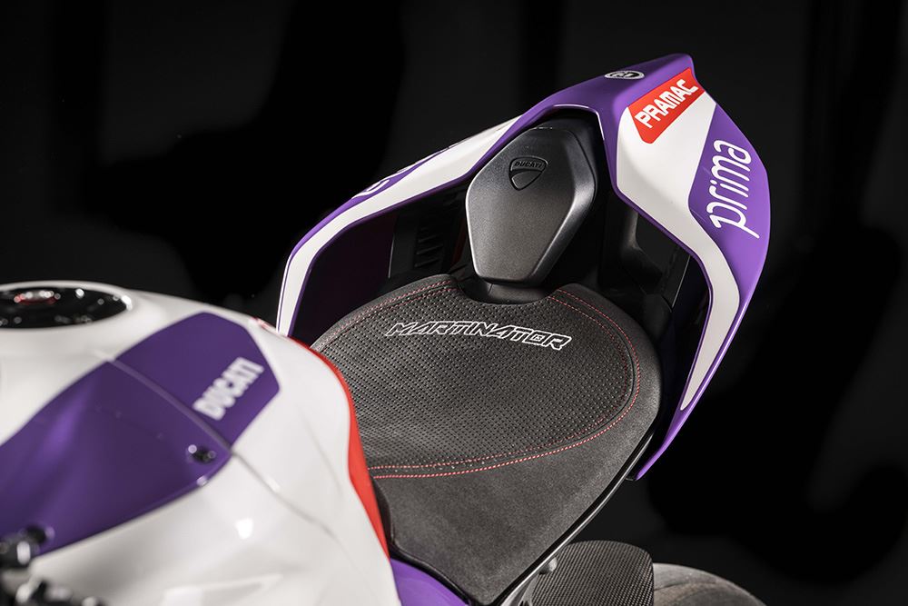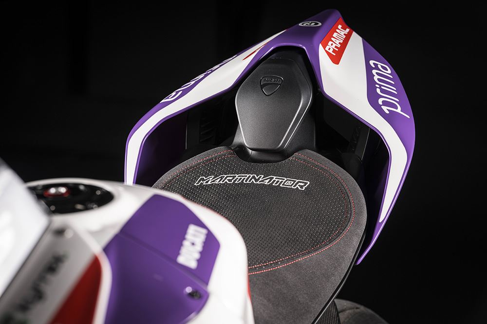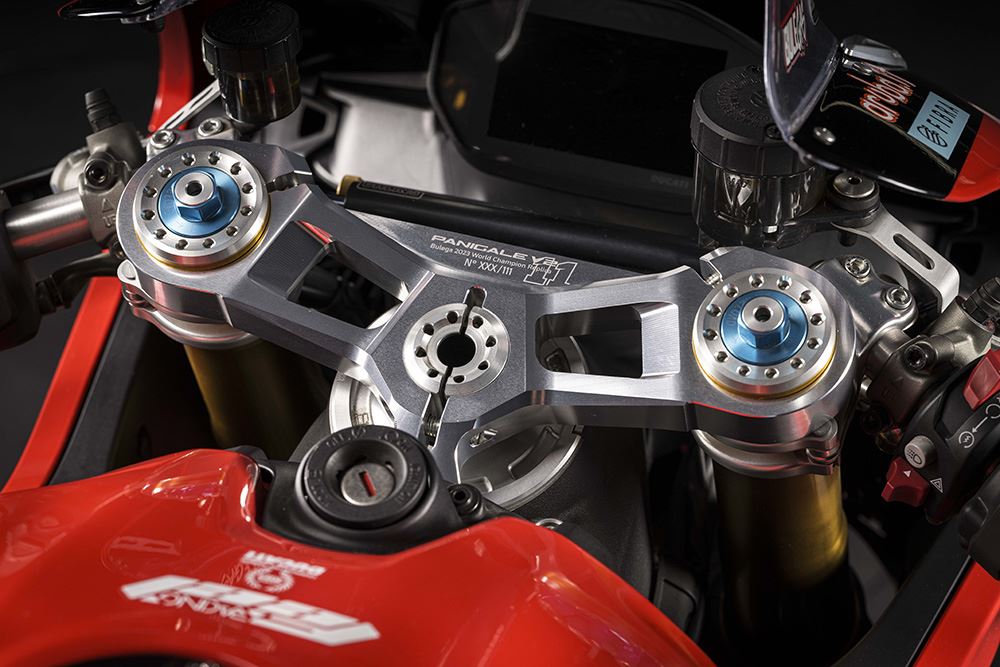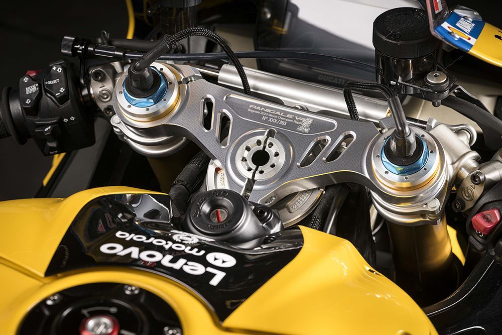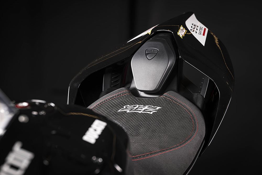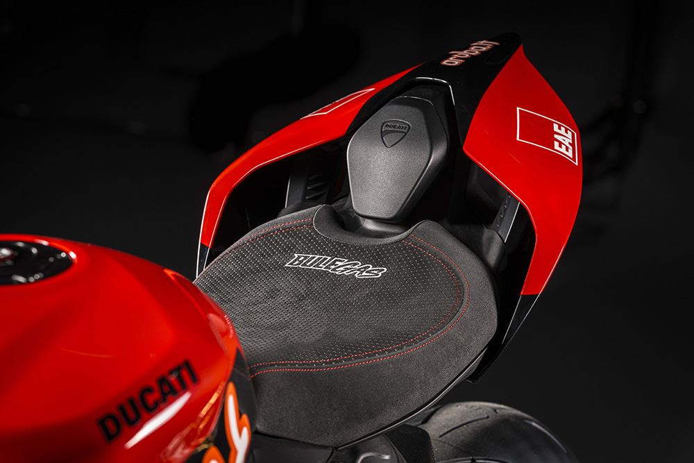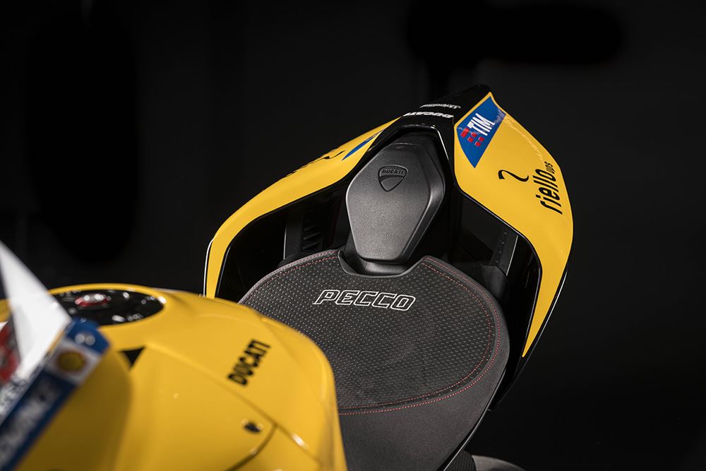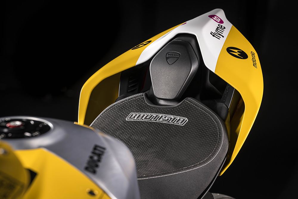 As Panigale V4 são dedicadas aos pilotos Francesco Bagnaia e Álvaro Bautista, e possuem um icónico esquema de cores em amarelo de Misano, que simboliza um capítulo marcante na história da Ducati. Cada moto, seja a V4 ou a V2, vem com características únicas, como assentos especiais, mesas de direção em alumínio gravadas a laser e uma animação exclusiva no painel ao ligar a ignição.