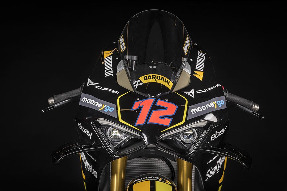 A Panigale V2 Bulega 2023 World Champion Réplica, limitada a 111 unidades, celebra a vitória de Nicolò Bulega com suspensões Öhlins, silenciadores Akrapovič e outros componentes.