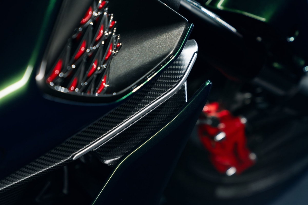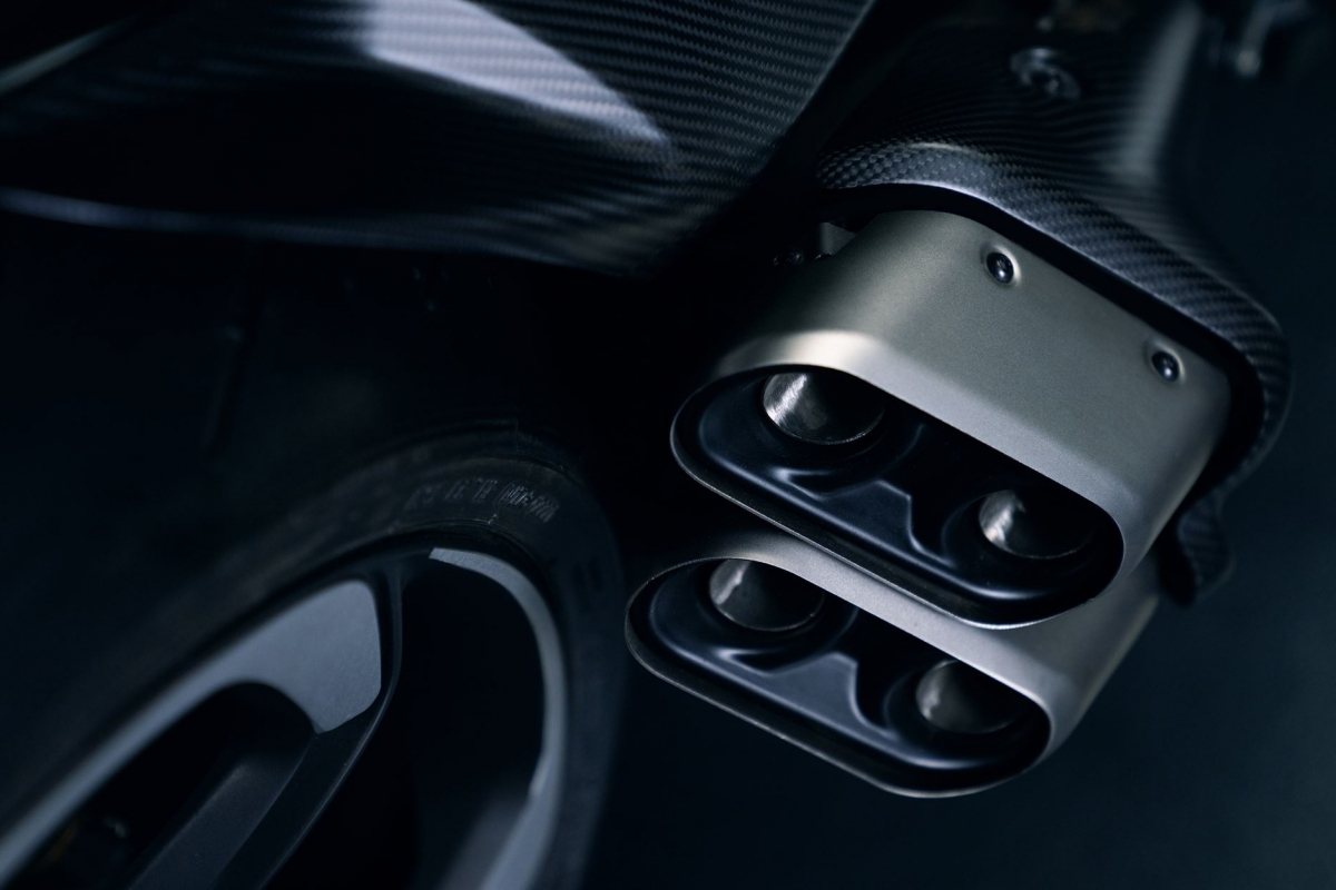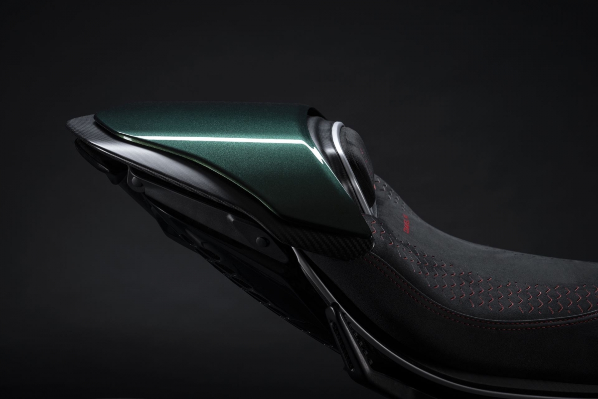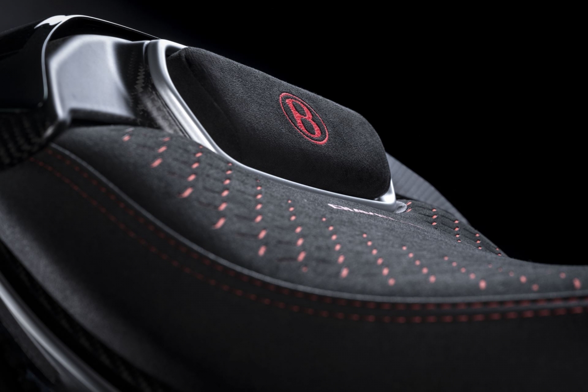 Já a zona traseira monolugar, que pode ser substituída por um banco para o “pendura”, segue as linhas da traseira do Batur. O banco do piloto, em Alcantara preto, inspira-se no interior do carro, com o tecido vermelho subjacente a ser igual ao dos bancos do coupé.