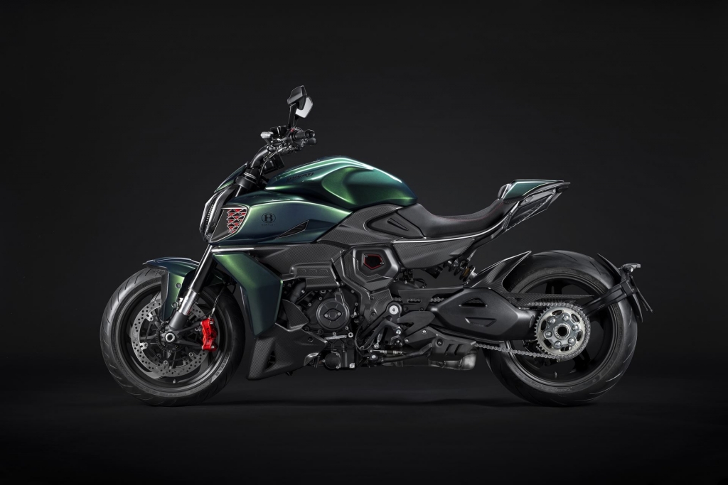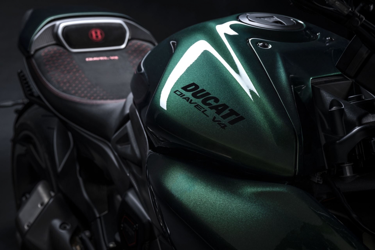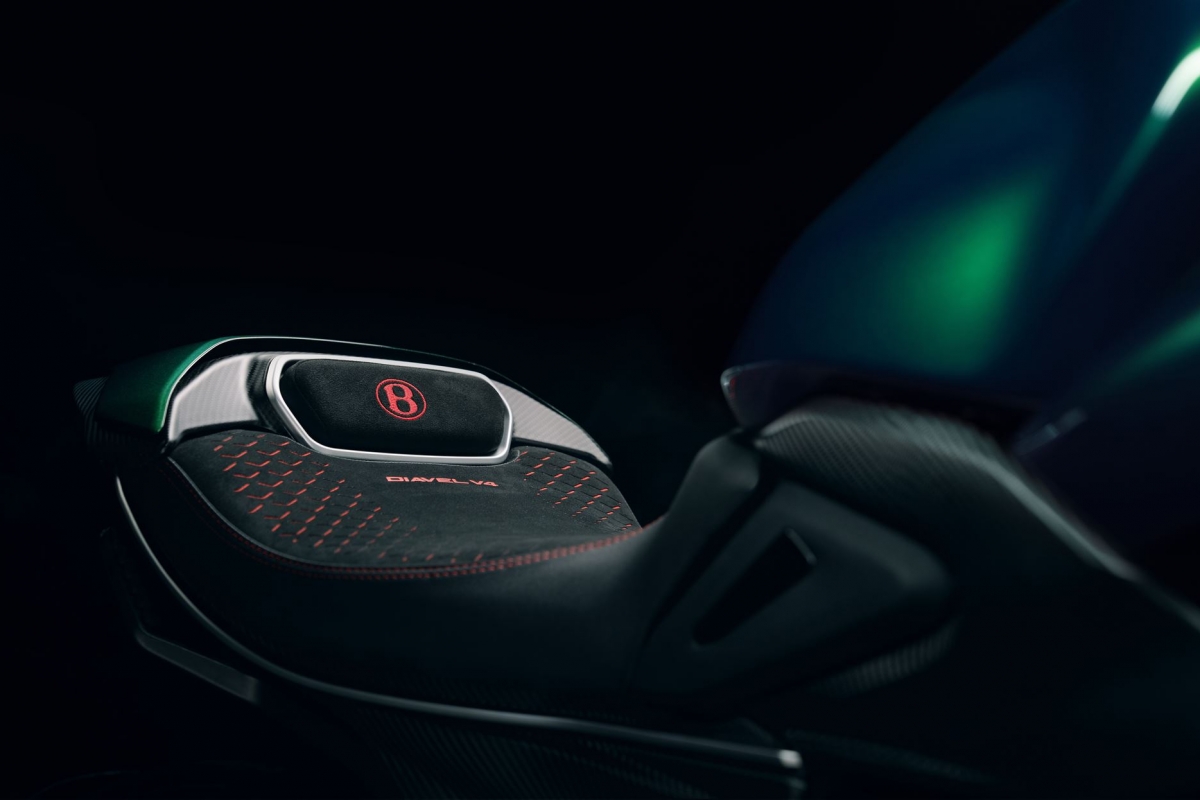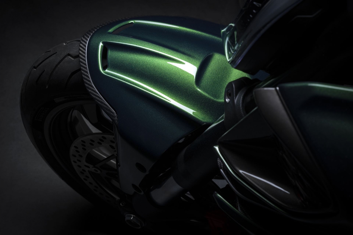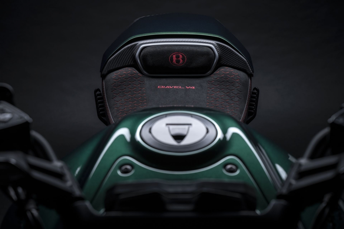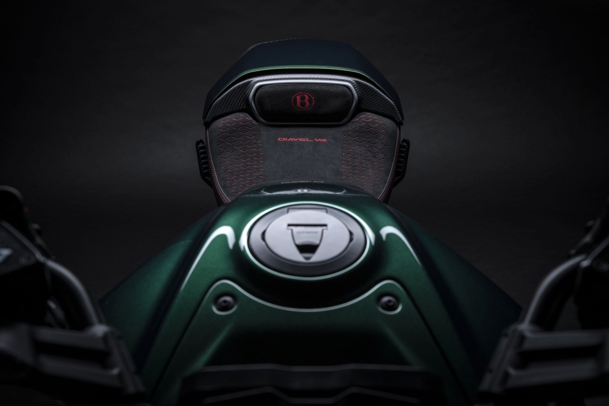 O tom Scarab Green, refinado com tons metalizados, faz parte da palete de cores com a divisão Mulliner pinta as suas edições especiais. Numerosos componentes técnicos “retirados” do Batur foram retomados nas linhas agressivas da Diavel V4, com o abuso da fibra de carbono.