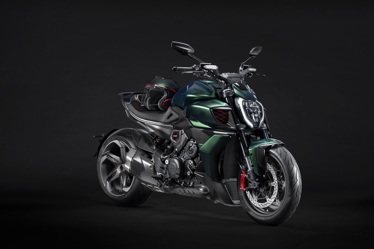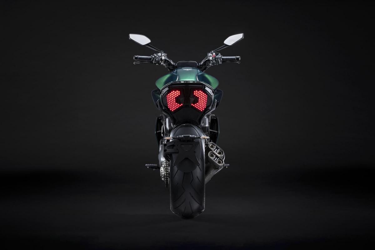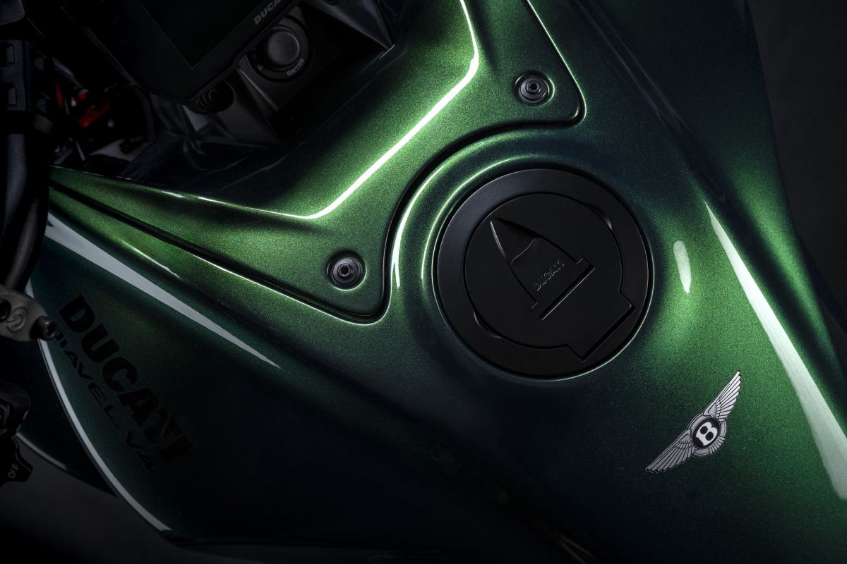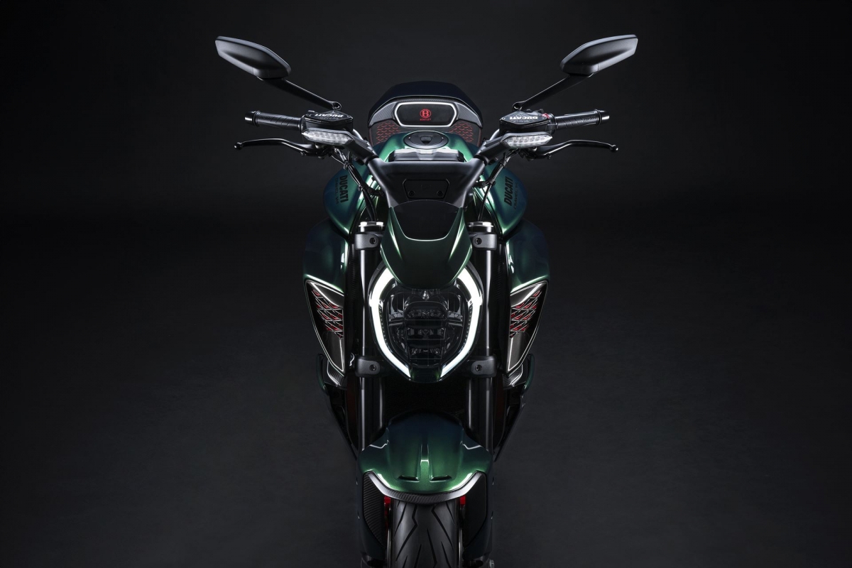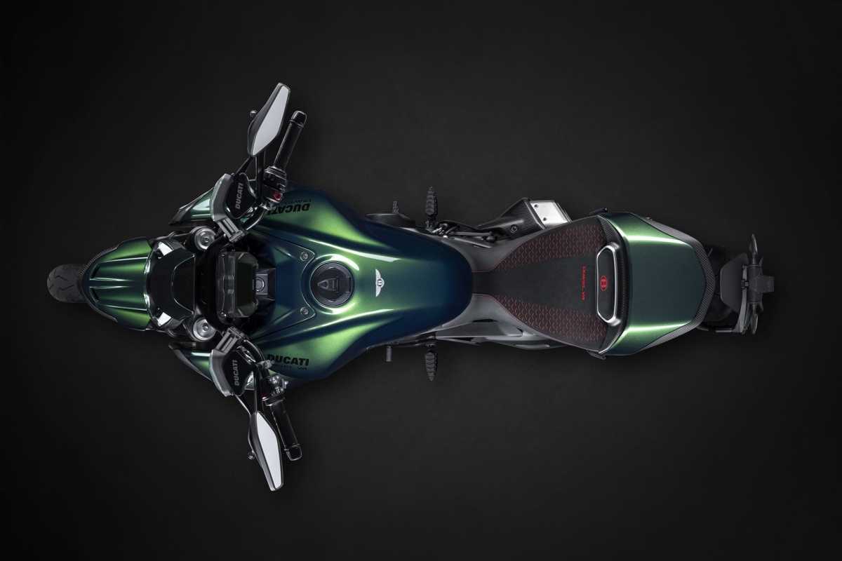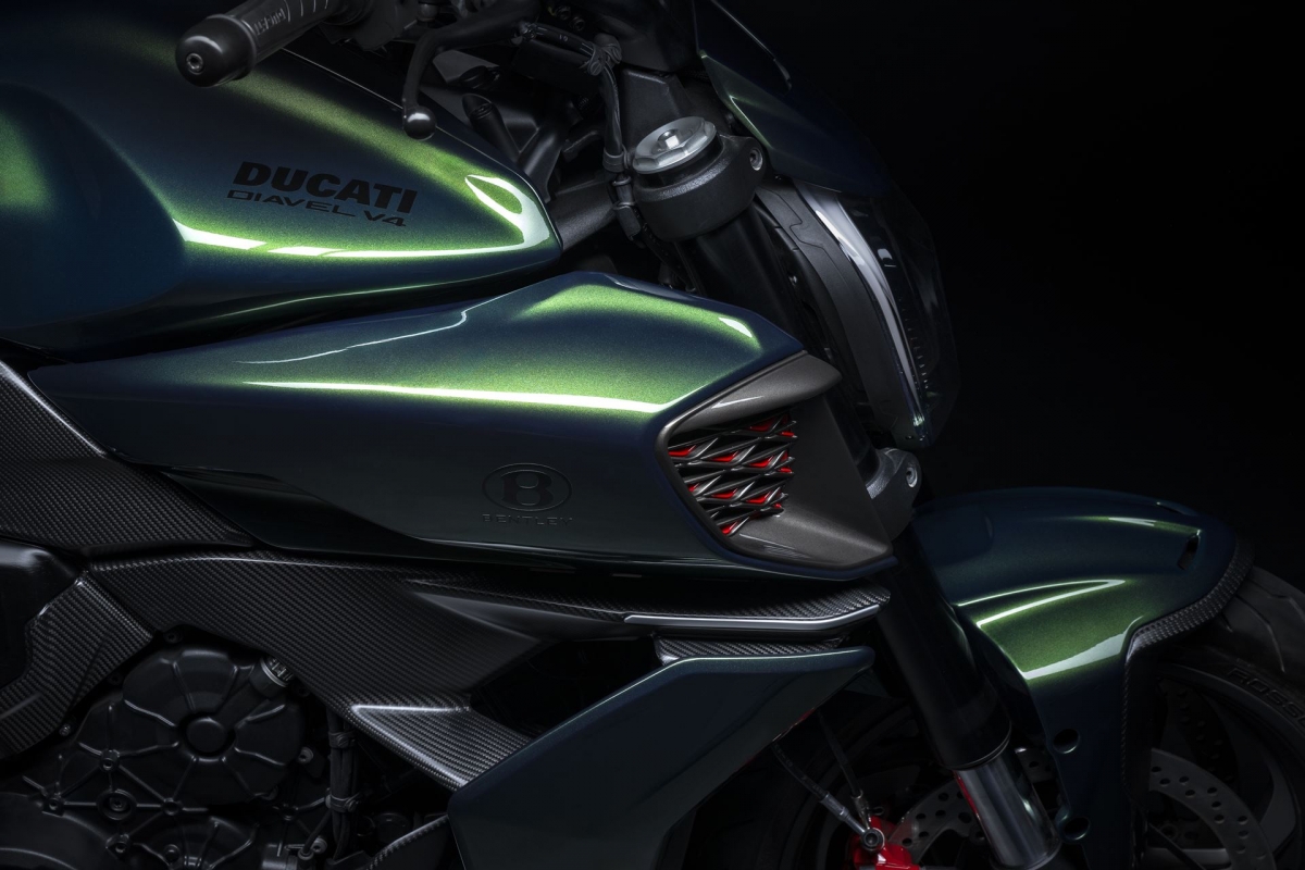 O tom Scarab Green, refinado com tons metalizados, faz parte da palete de cores com a divisão Mulliner pinta as suas edições especiais. Numerosos componentes técnicos “retirados” do Batur foram retomados nas linhas agressivas da Diavel V4, com o abuso da fibra de carbono.