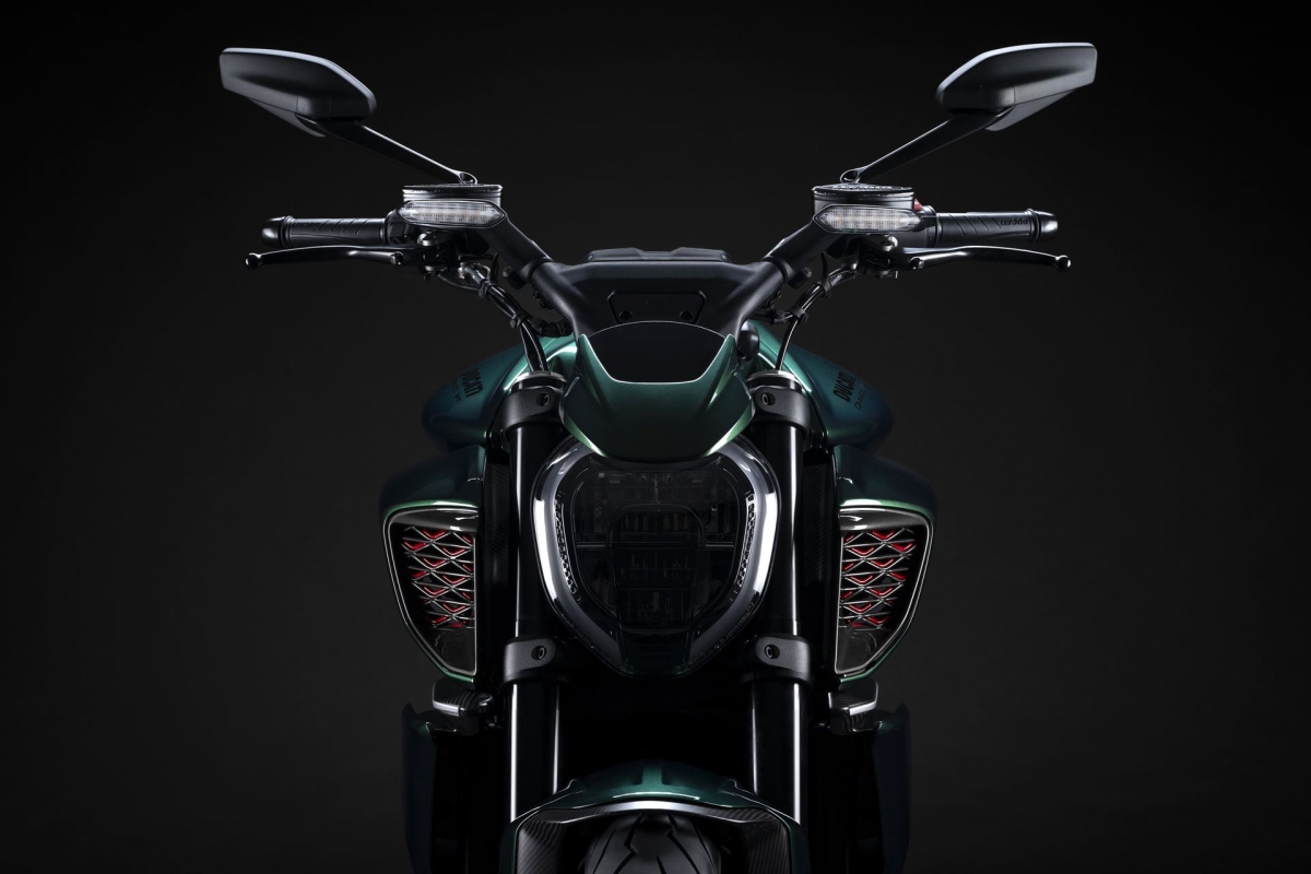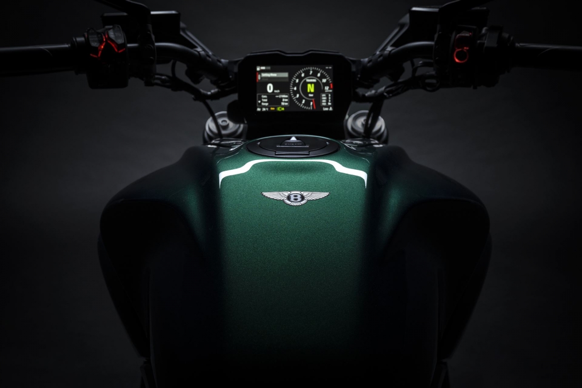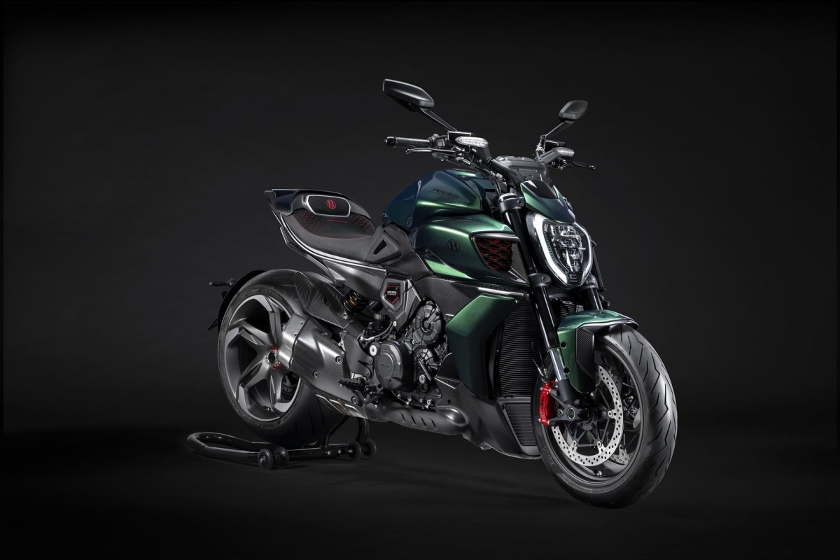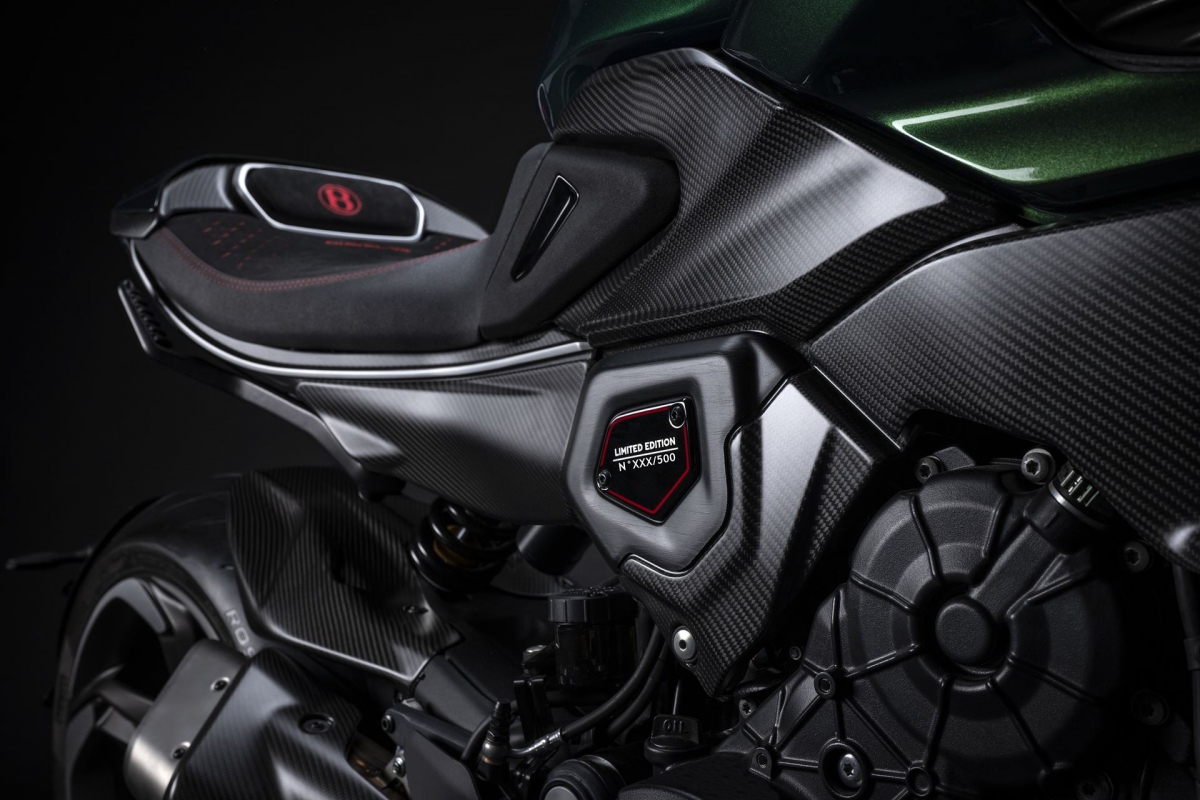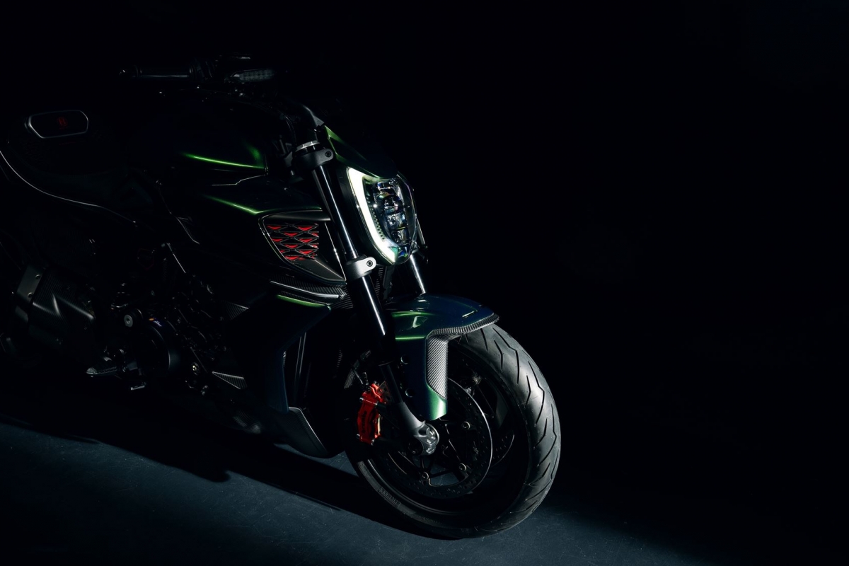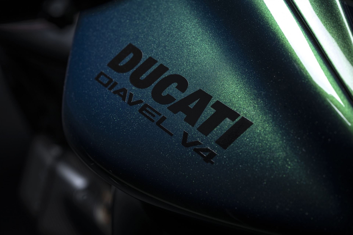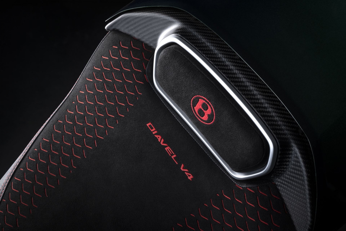 O tom Scarab Green, refinado com tons metalizados, faz parte da palete de cores com a divisão Mulliner pinta as suas edições especiais. Numerosos componentes técnicos “retirados” do Batur foram retomados nas linhas agressivas da Diavel V4, com o abuso da fibra de carbono.