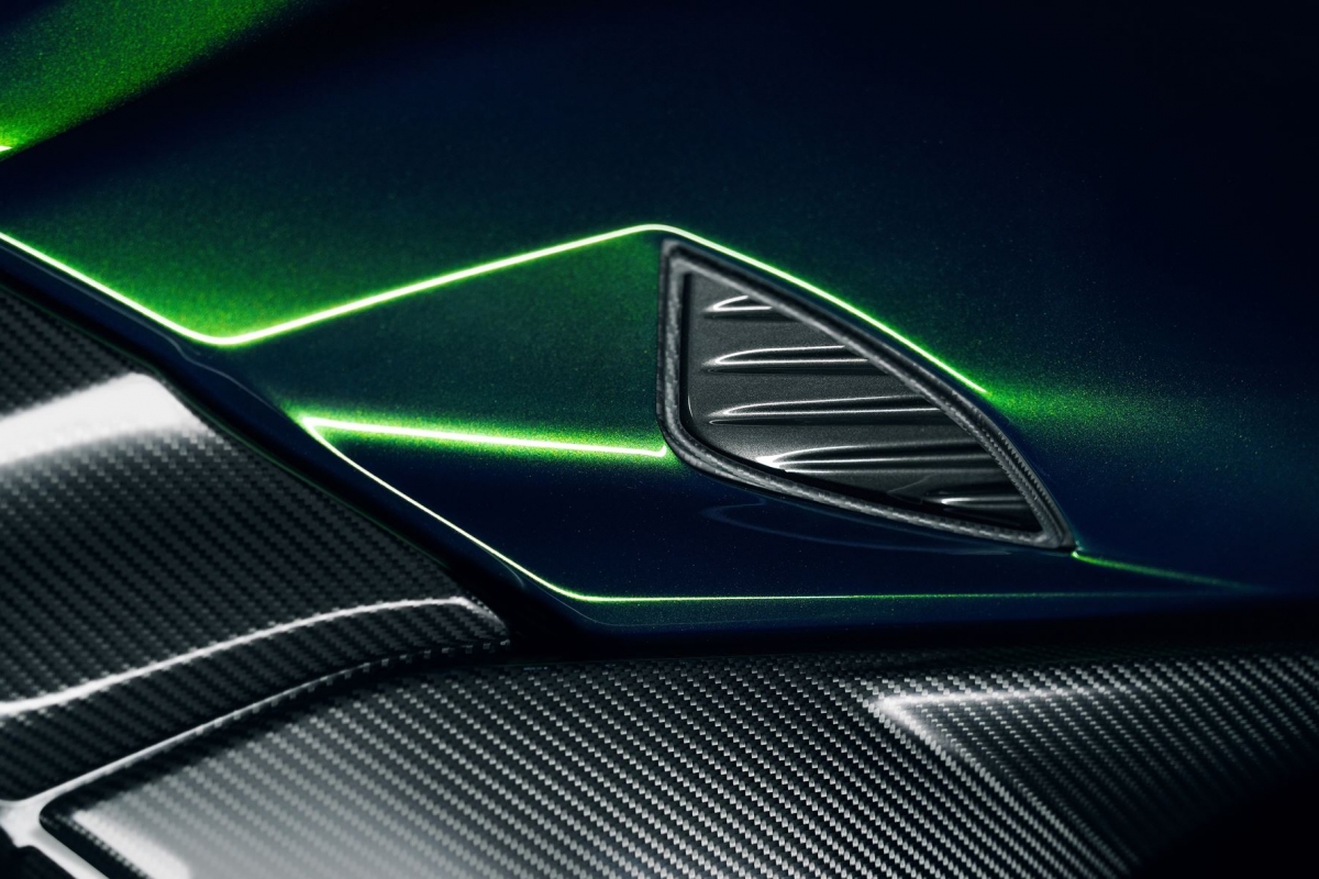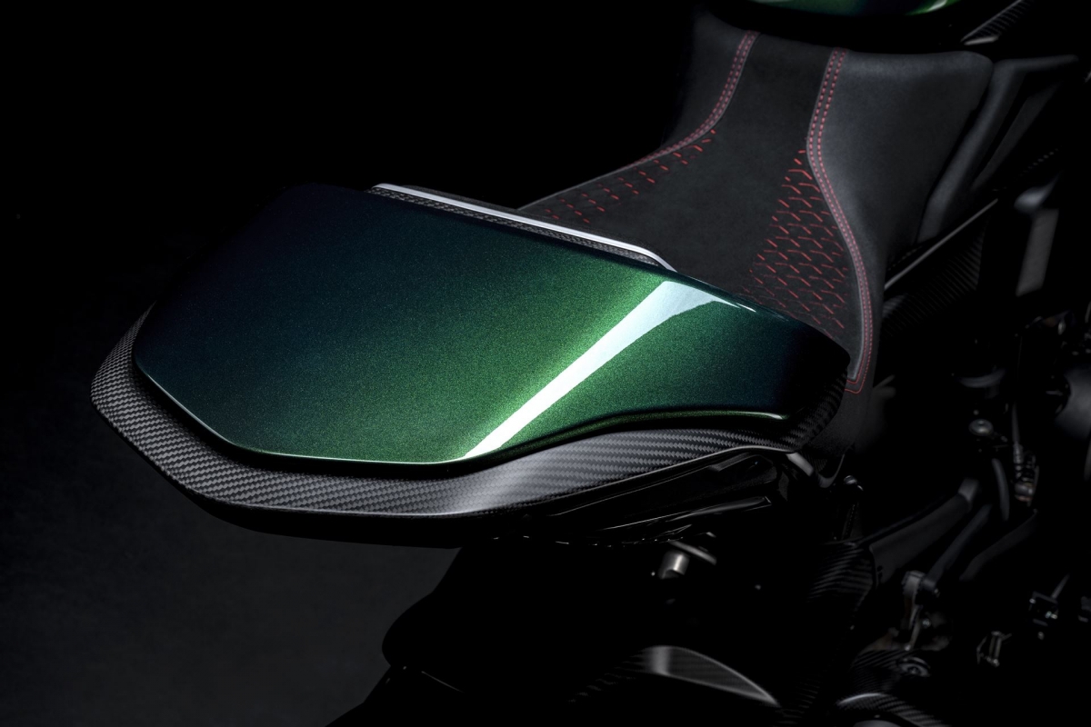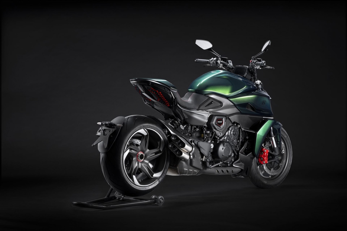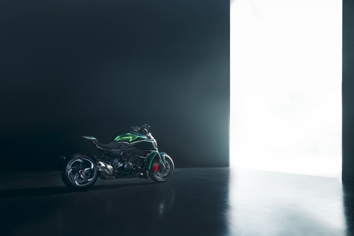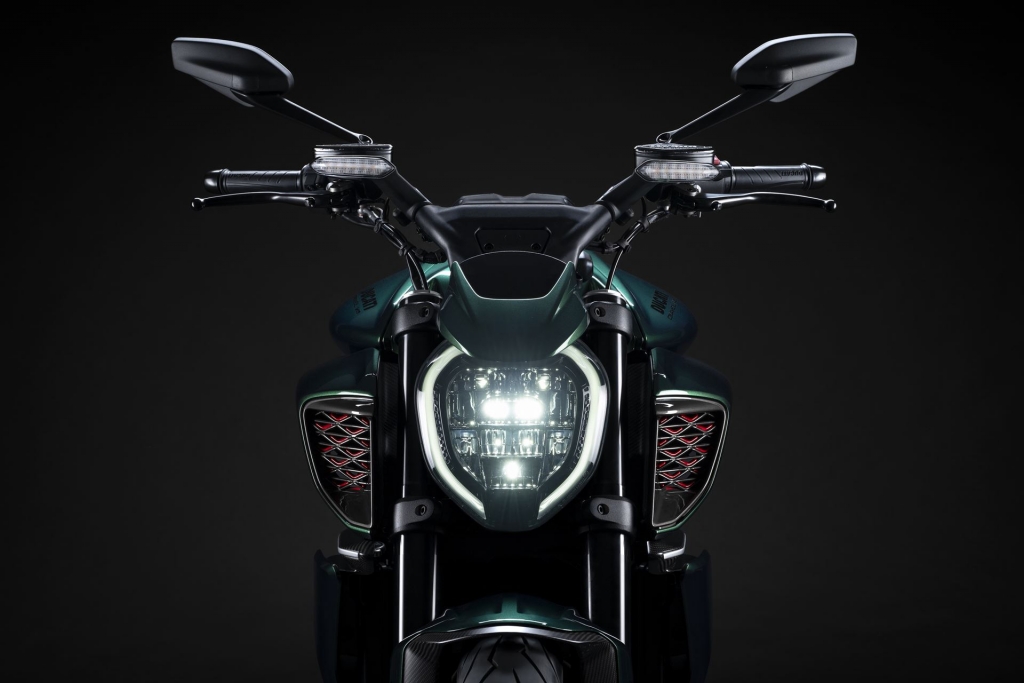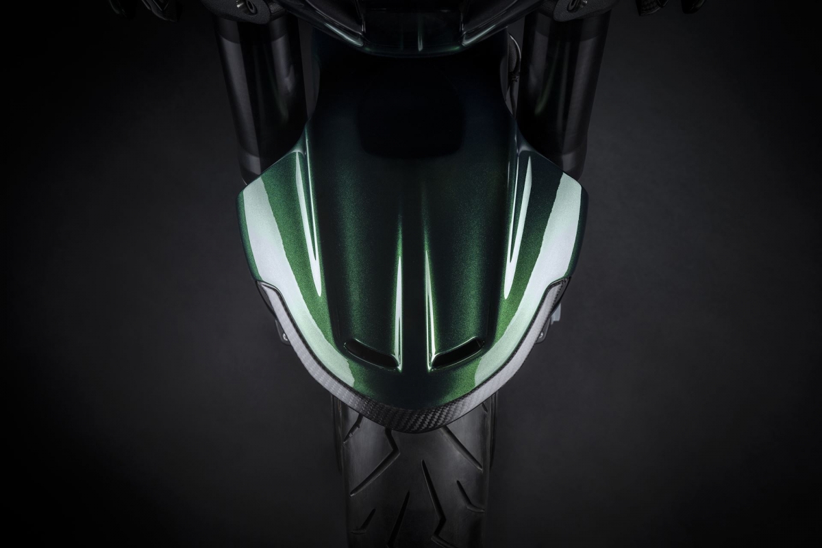 O tom Scarab Green, refinado com tons metalizados, faz parte da palete de cores com a divisão Mulliner pinta as suas edições especiais. Numerosos componentes técnicos “retirados” do Batur foram retomados nas linhas agressivas da Diavel V4, com o abuso da fibra de carbono.