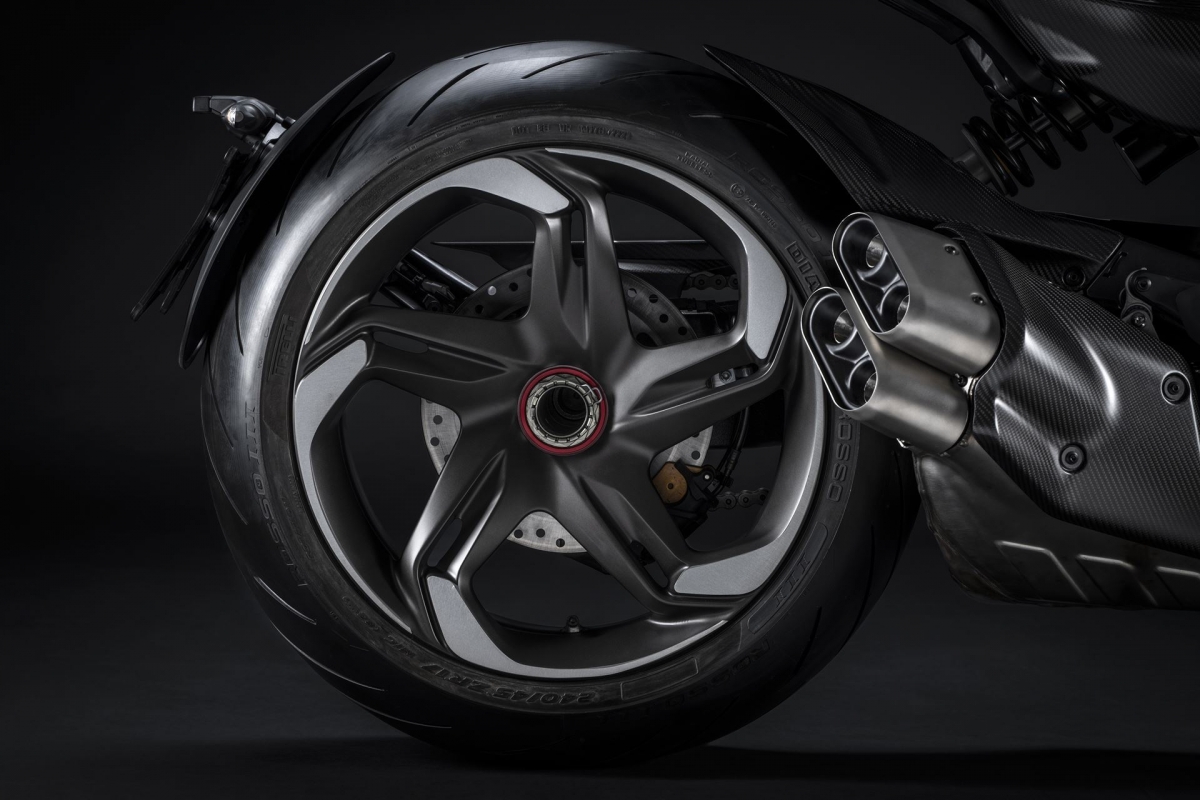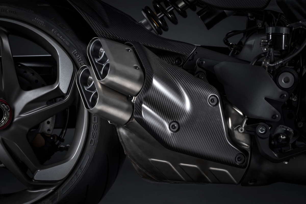 O escape duplo da Ducati Diavel V4 for Bentley também foi redesenhado para realçar a harmonia das linhas refinadas da moto.