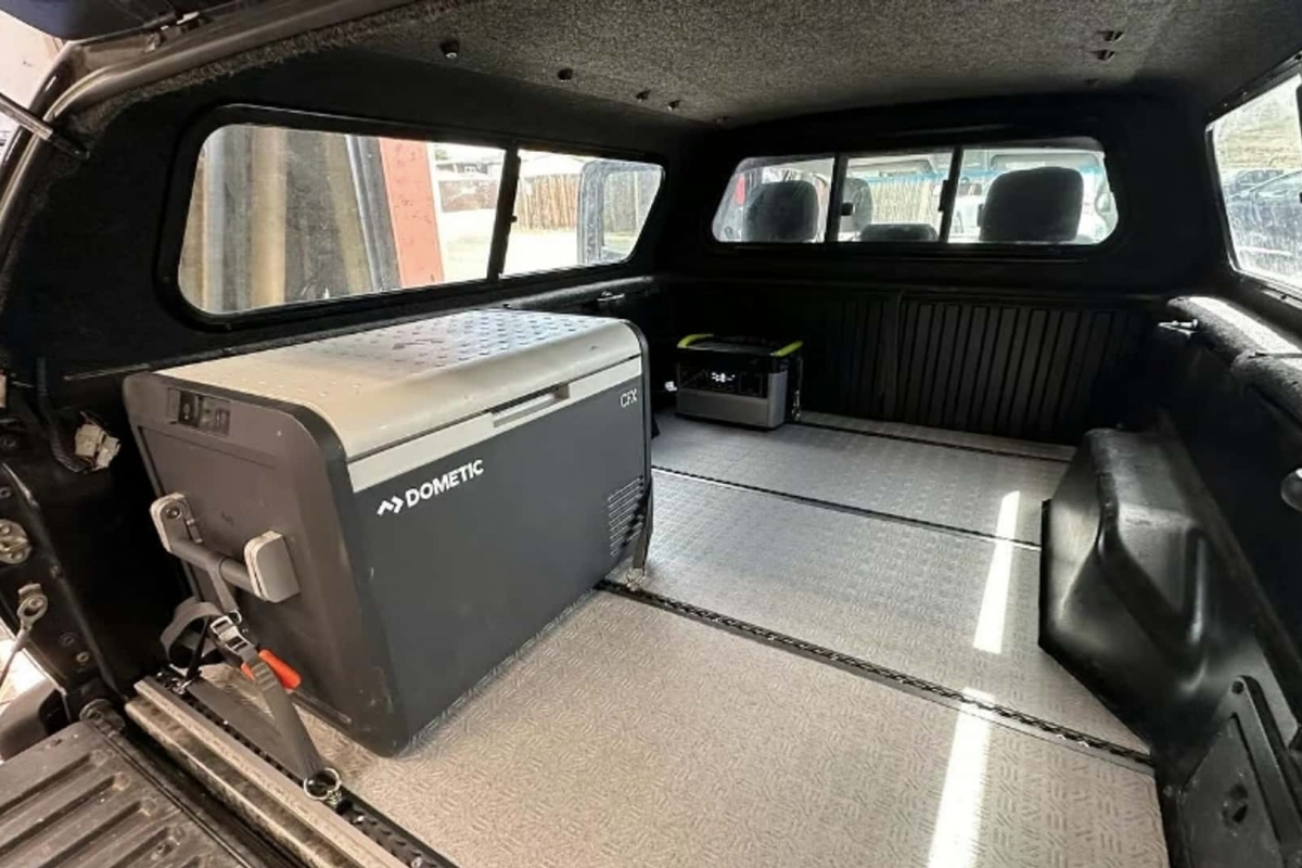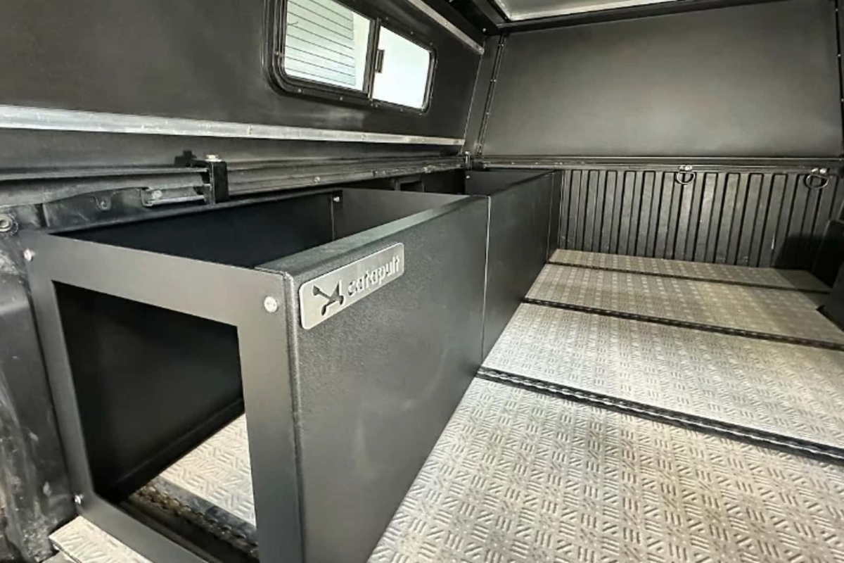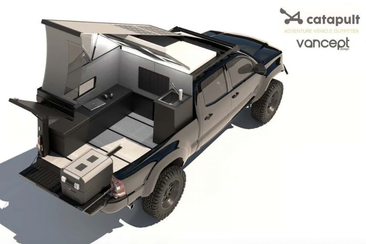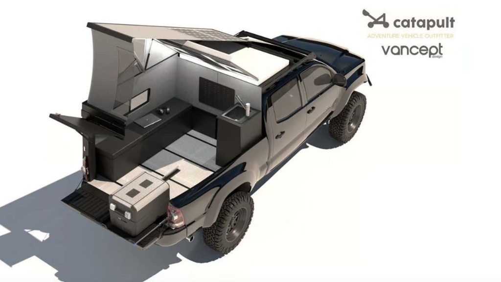 Outro destaque da Catapult é a placa de pavimento em compósito, feita à medida para o chão da plataforma da Tacoma. Incorpora várias filas de carris em L que conferem ao espaço do módulo superior a flexibilidade de um veículo recreativo modular, tal como um Terracamper, por exemplo.