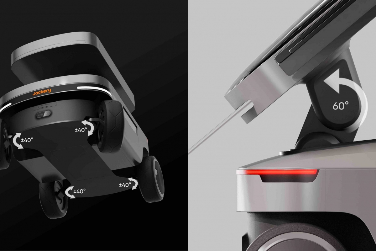 O produto integra painéis solares com o sistema de armazenamento de energia. Os painéis fotovoltaicos dobráveis estão posicionados no topo do robot-veículo. Quando dobrados, o seu tamanho compacto aumenta a portabilidade do produto. Quando expandidas, essas “asas solares” apresentam uma saída de 600W, demonstrando uma eficiência de conversão solar máxima de 25%.