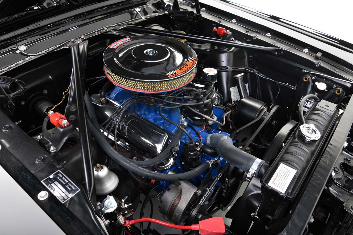 O motor que equipa este Mustang é o V8 Windsor 289 HiPo, de 4,7 litros de cilindrada, com um carburador de quádruplo corpo Autolite 4100, molas das válvulas reforçadas, hastes das cames sólidas e um colector de escape de fluxo mais livre, para desenvolver 275cv às 6 mil rotações por minuto e 423 Nm às 3400 rotações por minuto. Acoplado ao motor está uma caixa manual de quatro velocidades.